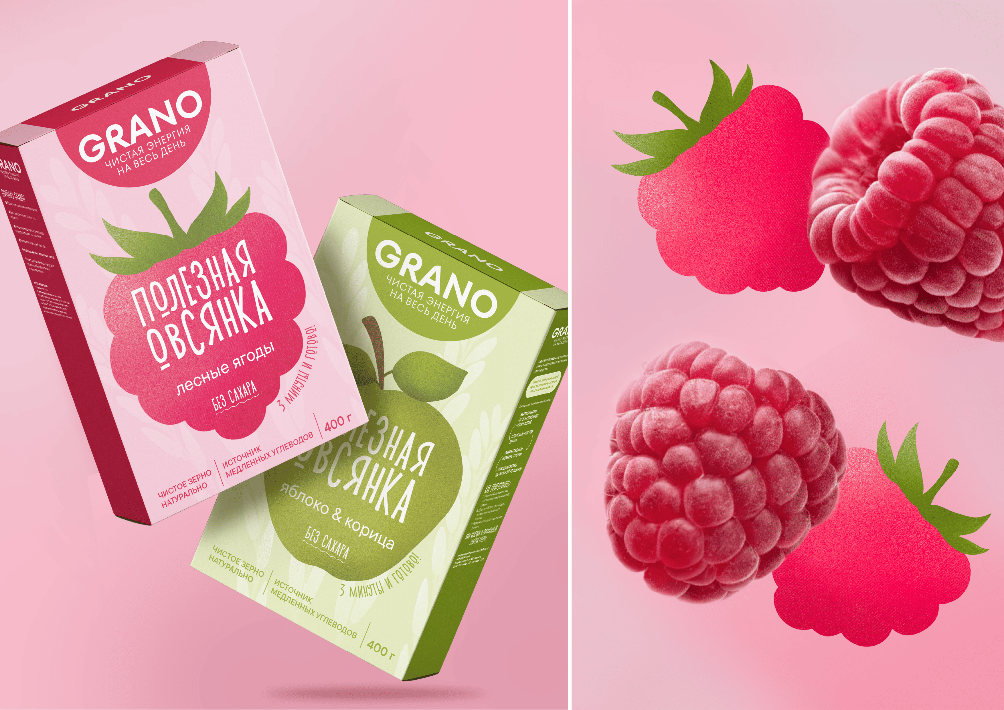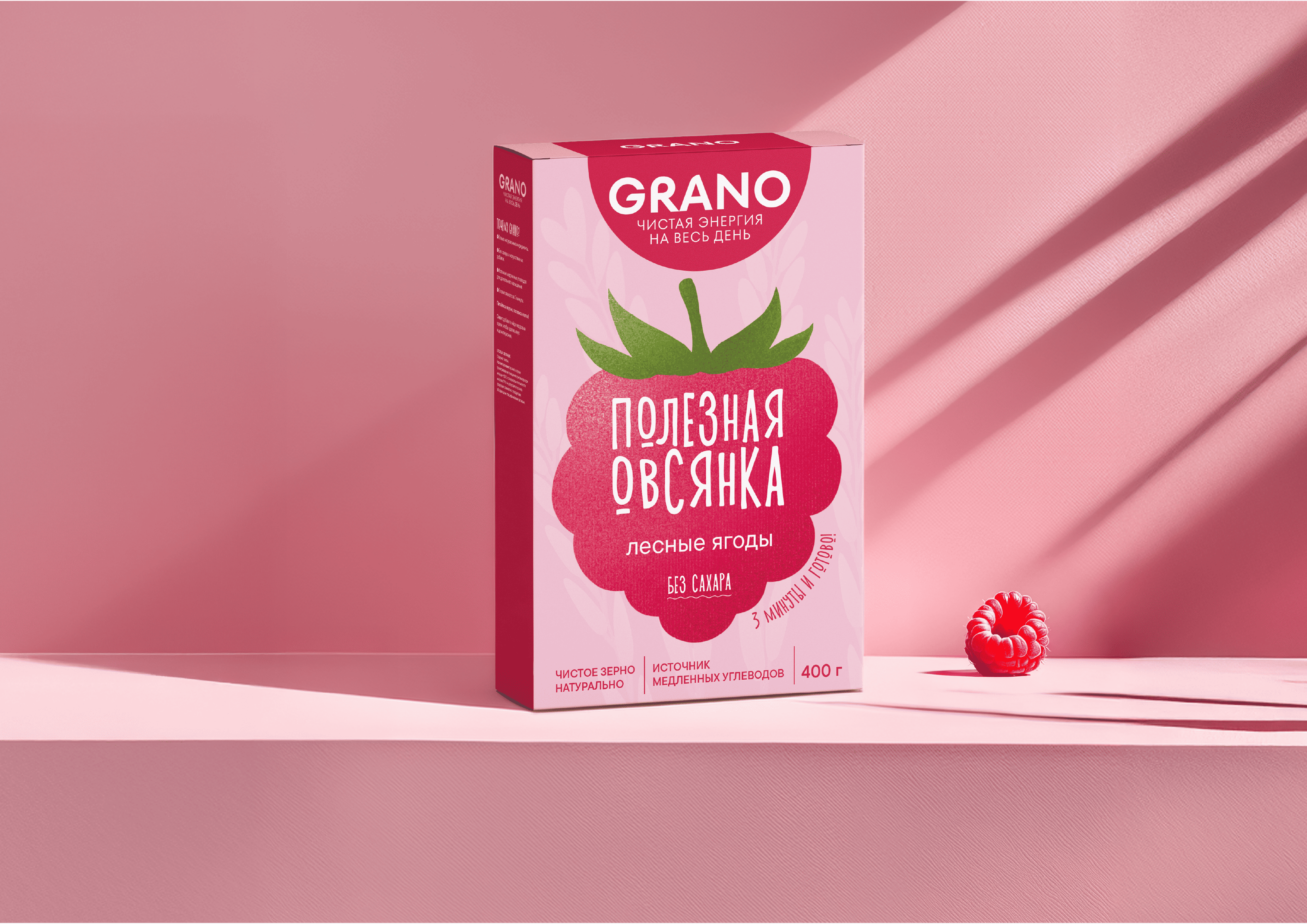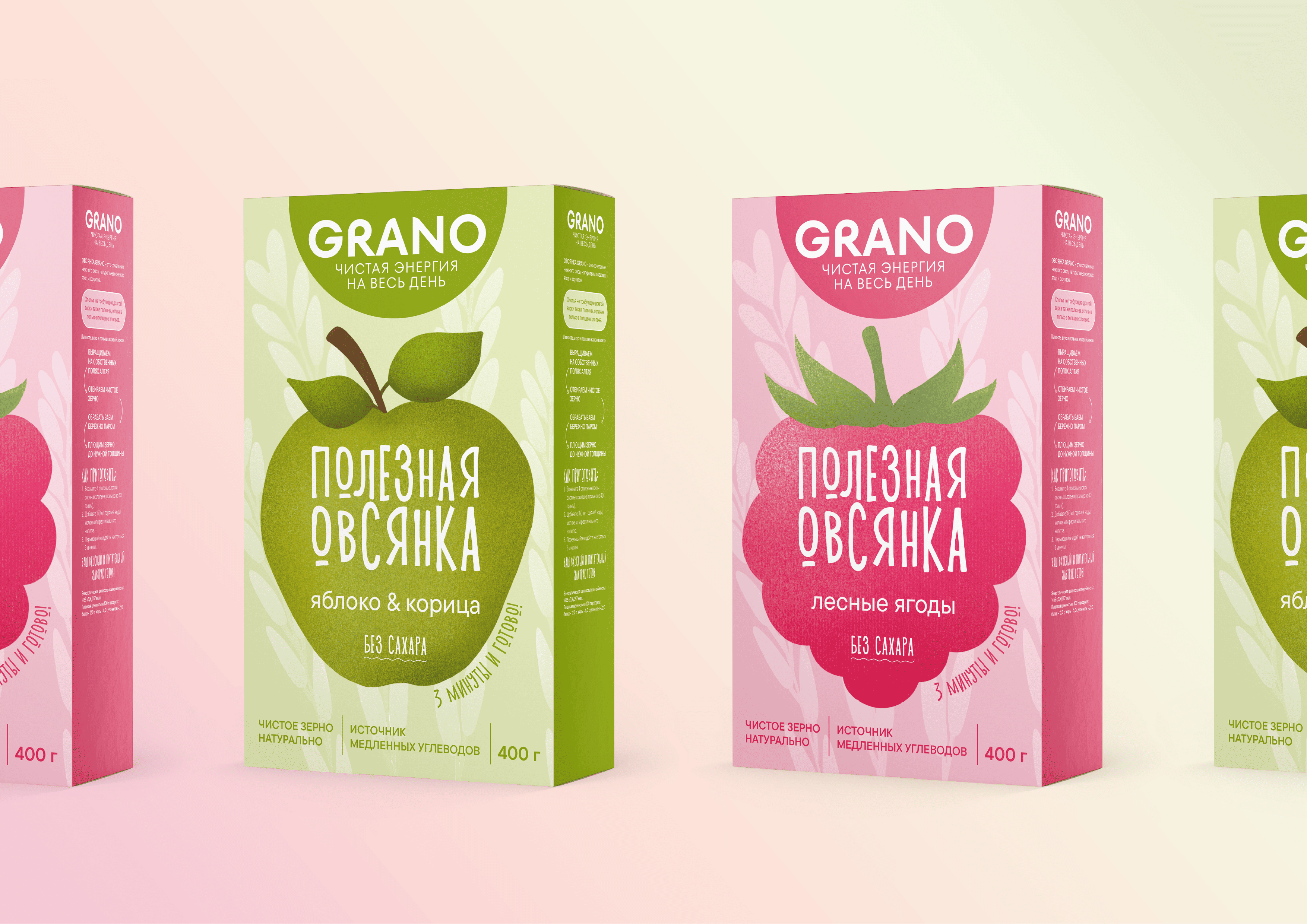 Design packaging for GRANO healthy oatmeal porridge with additives for two SKU. The packaging should attract active, health-conscious consumers who value a healthy lifestyle and natural nutrition. The design should convey freshness, naturalness and convenience.