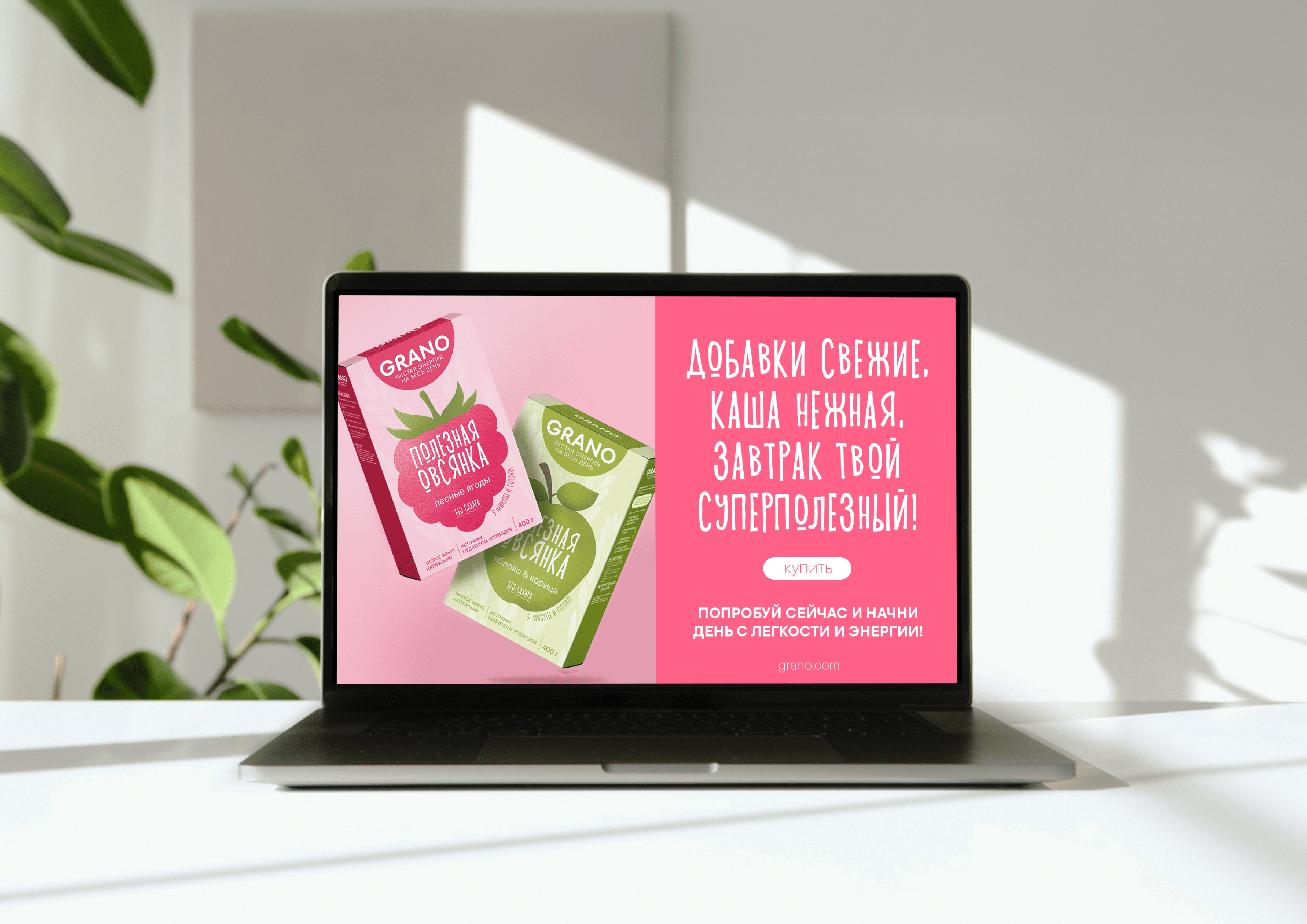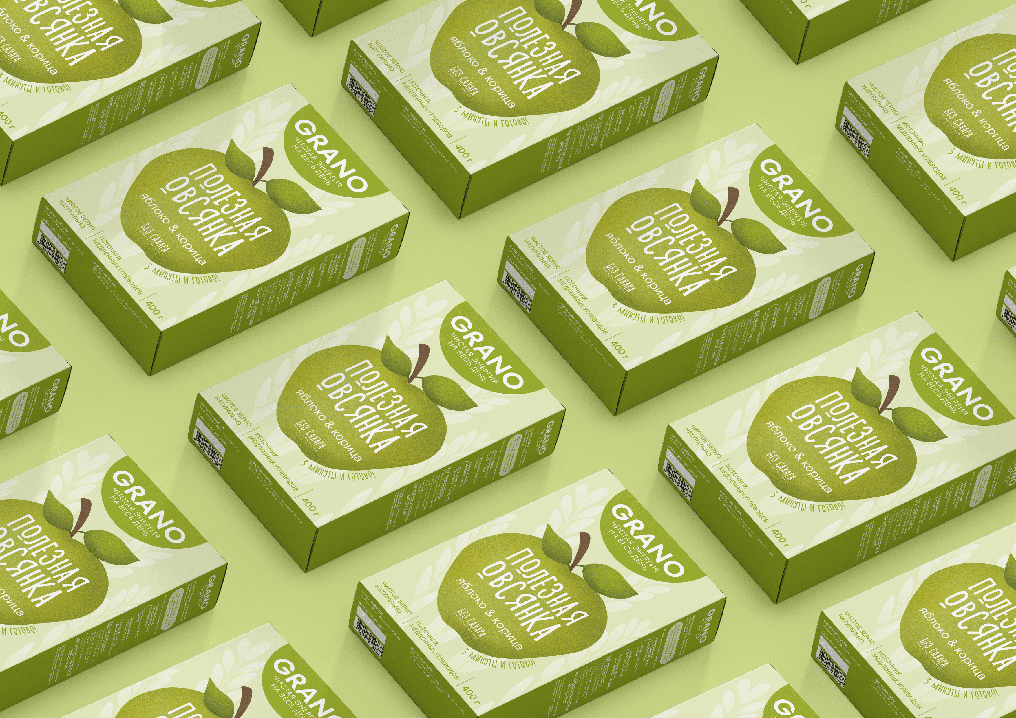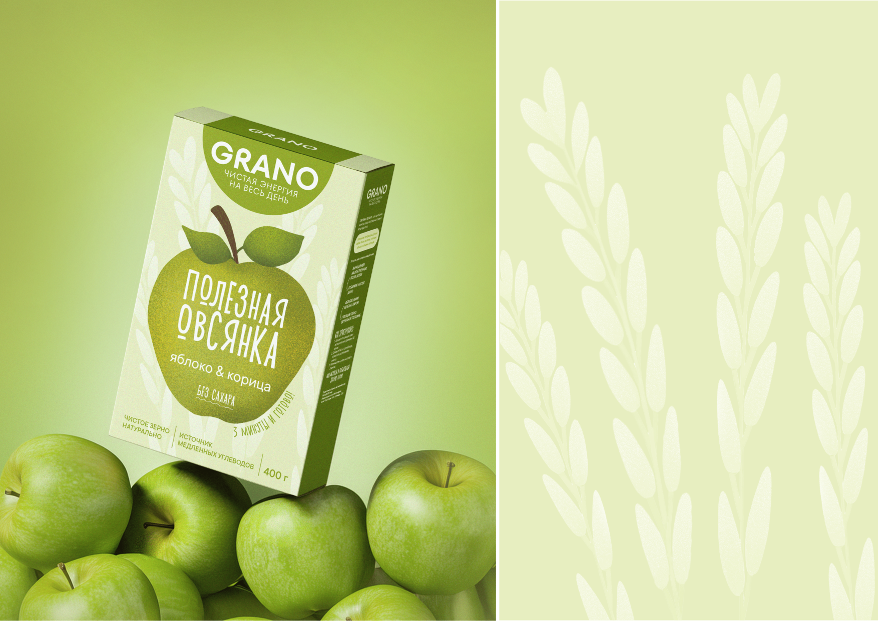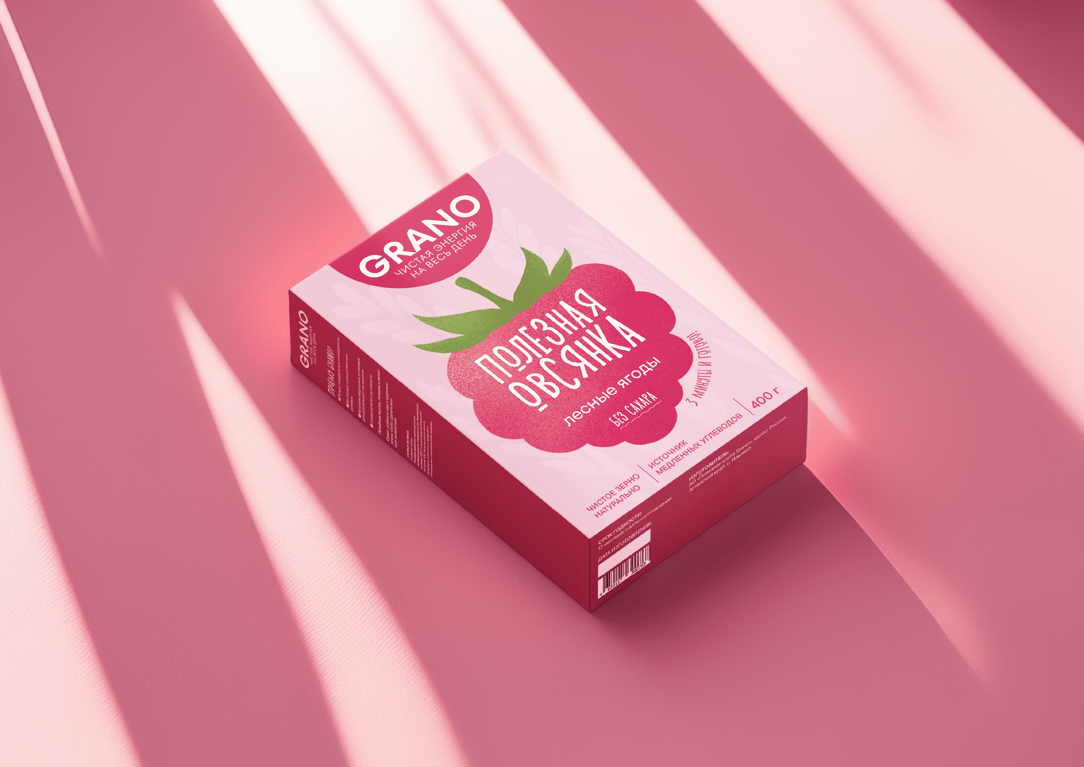 Design packaging for GRANO healthy oatmeal porridge with additives for two SKU. The packaging should attract active, health-conscious consumers who value a healthy lifestyle and natural nutrition. The design should convey freshness, naturalness and convenience.