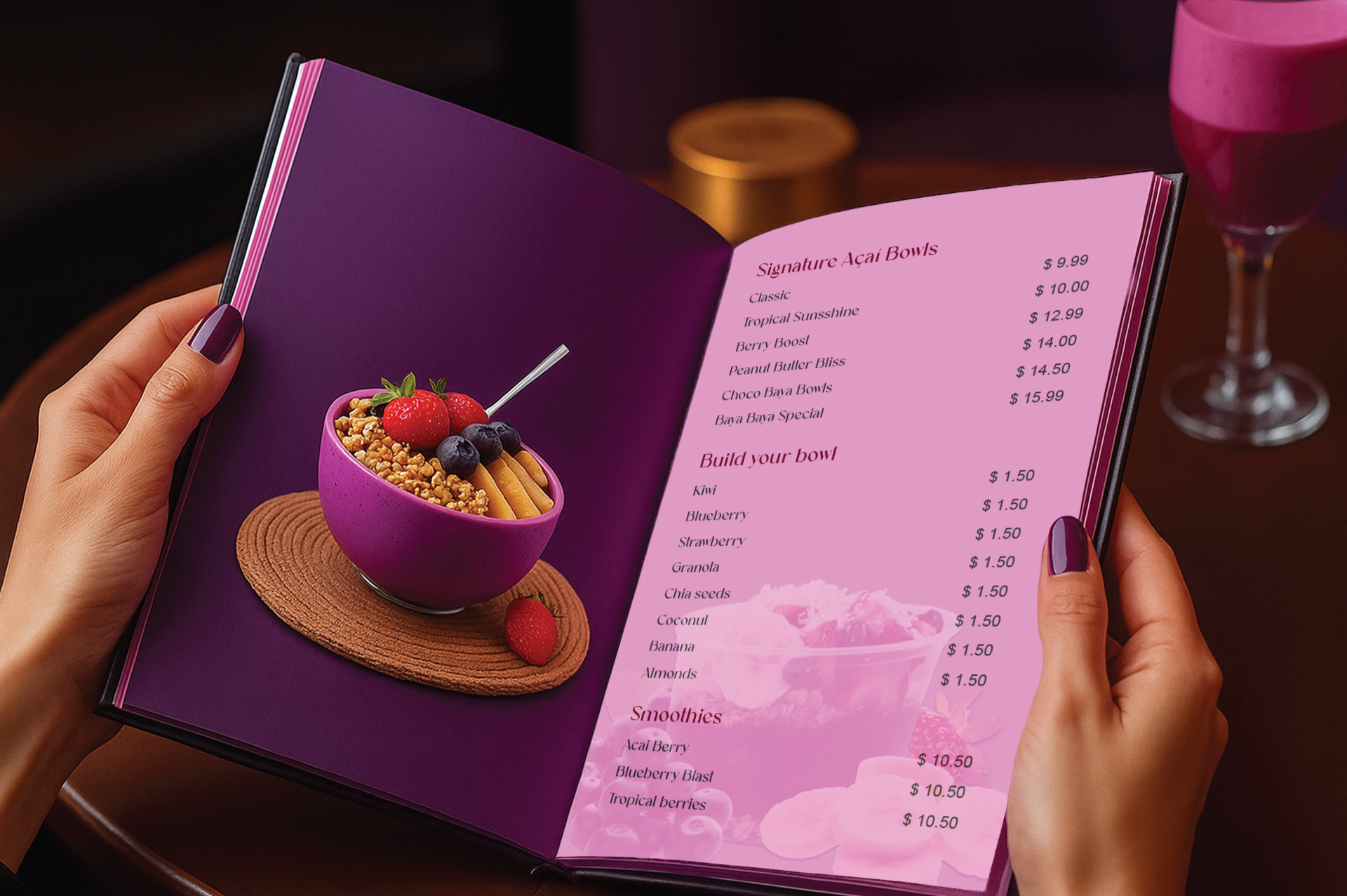 To craft a brand identity and packaging system that balances the health-focused appeal of açaí with a premium, youthful café experience. In a saturated market of smoothie and wellness cafés, Baya Baya needed to stand out while creating emotional resonance with a design-savvy and health-conscious audience.