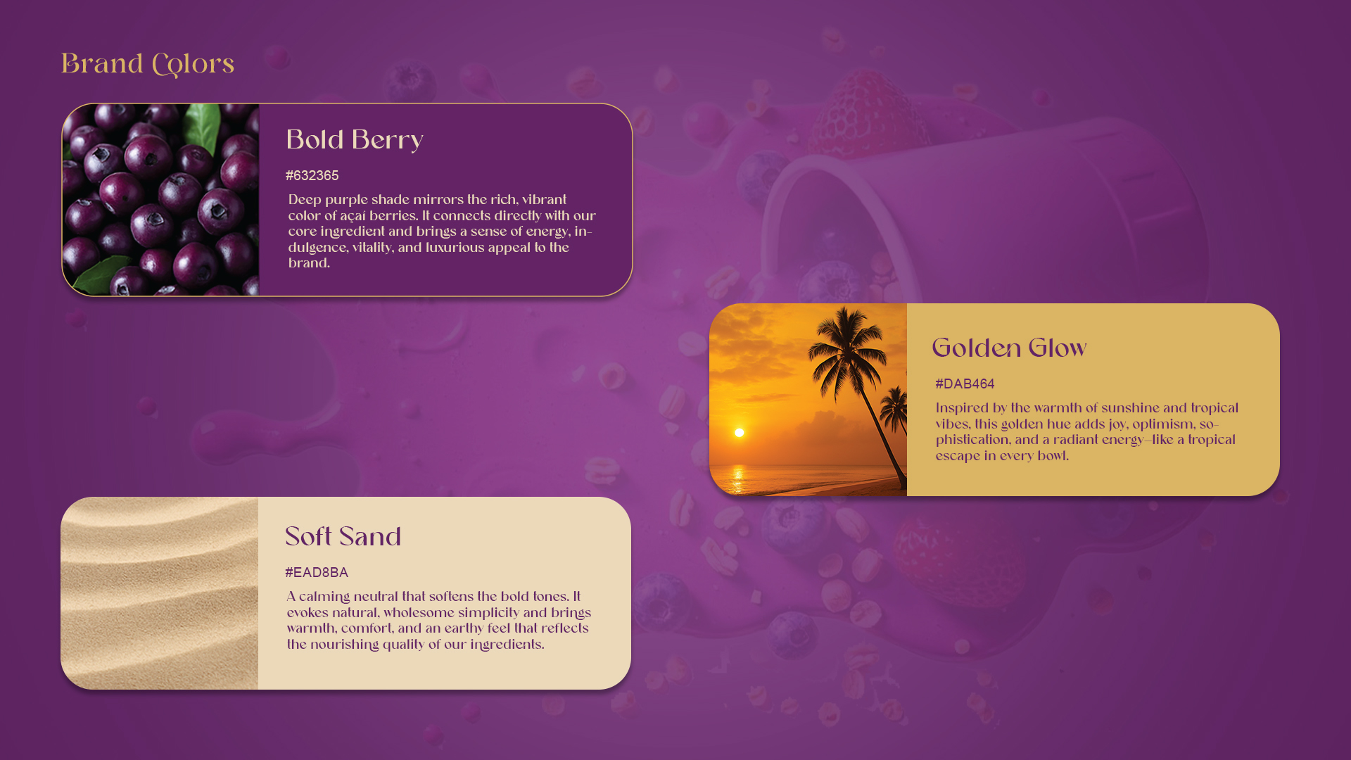 We developed a dynamic identity rooted in the tropical origin of the açaí berry. The color palette features