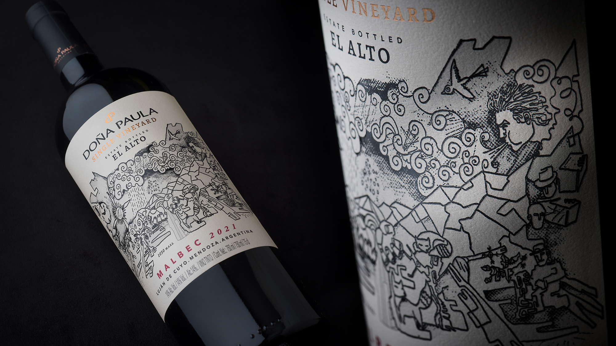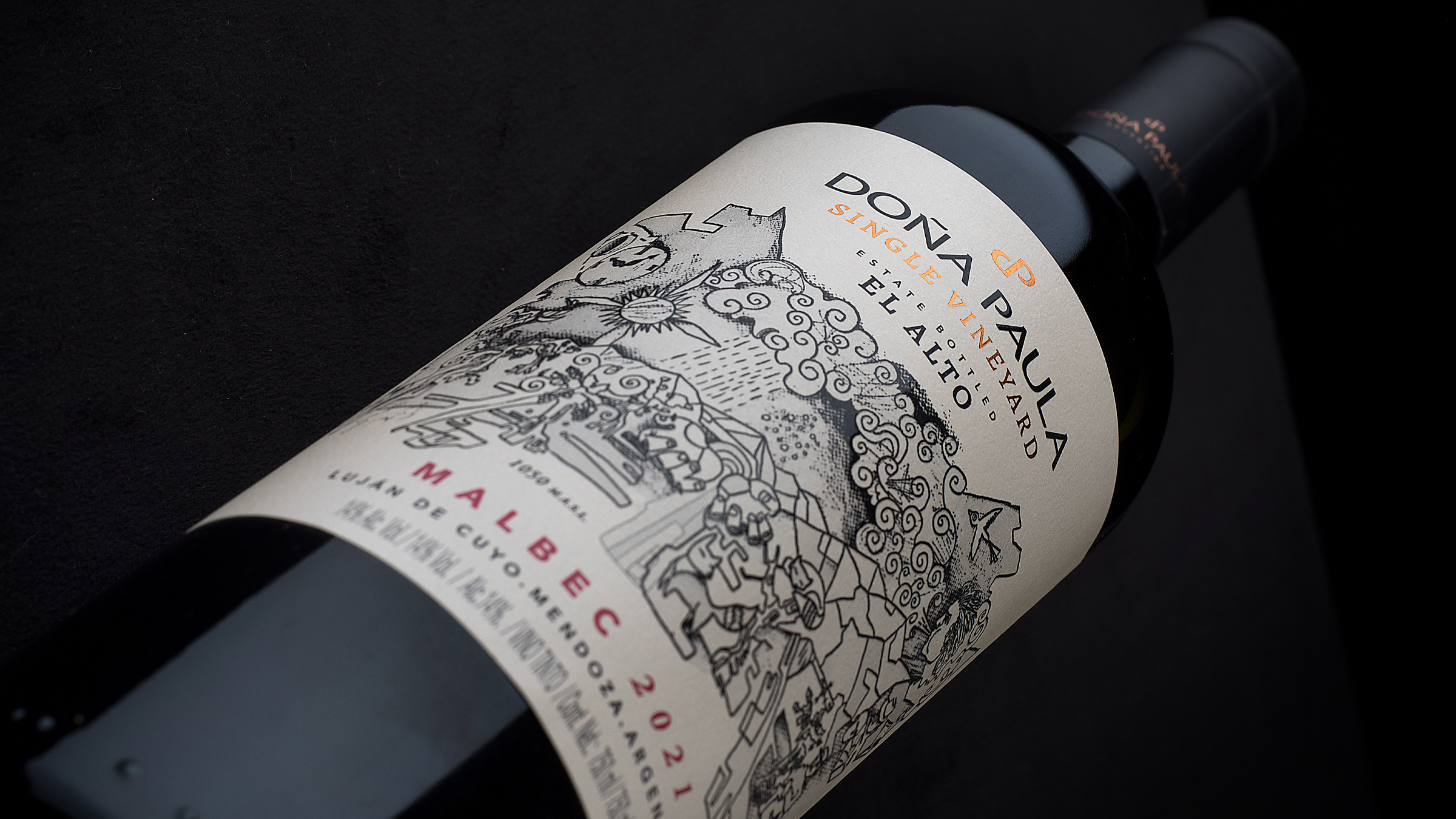 The Doña Paula Single Vineyard label is a canvas on which nature and terroir come to life through a design that captures, through a system of illustrations, the essence and uniqueness of each vineyard and its surroundings. Between these gestural and spontaneous lines of the illustration, small scenes of life in the vineyard emerge: the workers, the flora and fauna of the area, and the vines framed by paths and structures that suggest history and human endeavor. The presence of nature and its surroundings on each label represents the different vineyards with their unique characteristics. The color palette is minimalist, reminiscent of the land and its surroundings. Each label not only identifies a terroir but tells its story: the connection with the land, the influence of the environment, and the dedication behind each harvest.