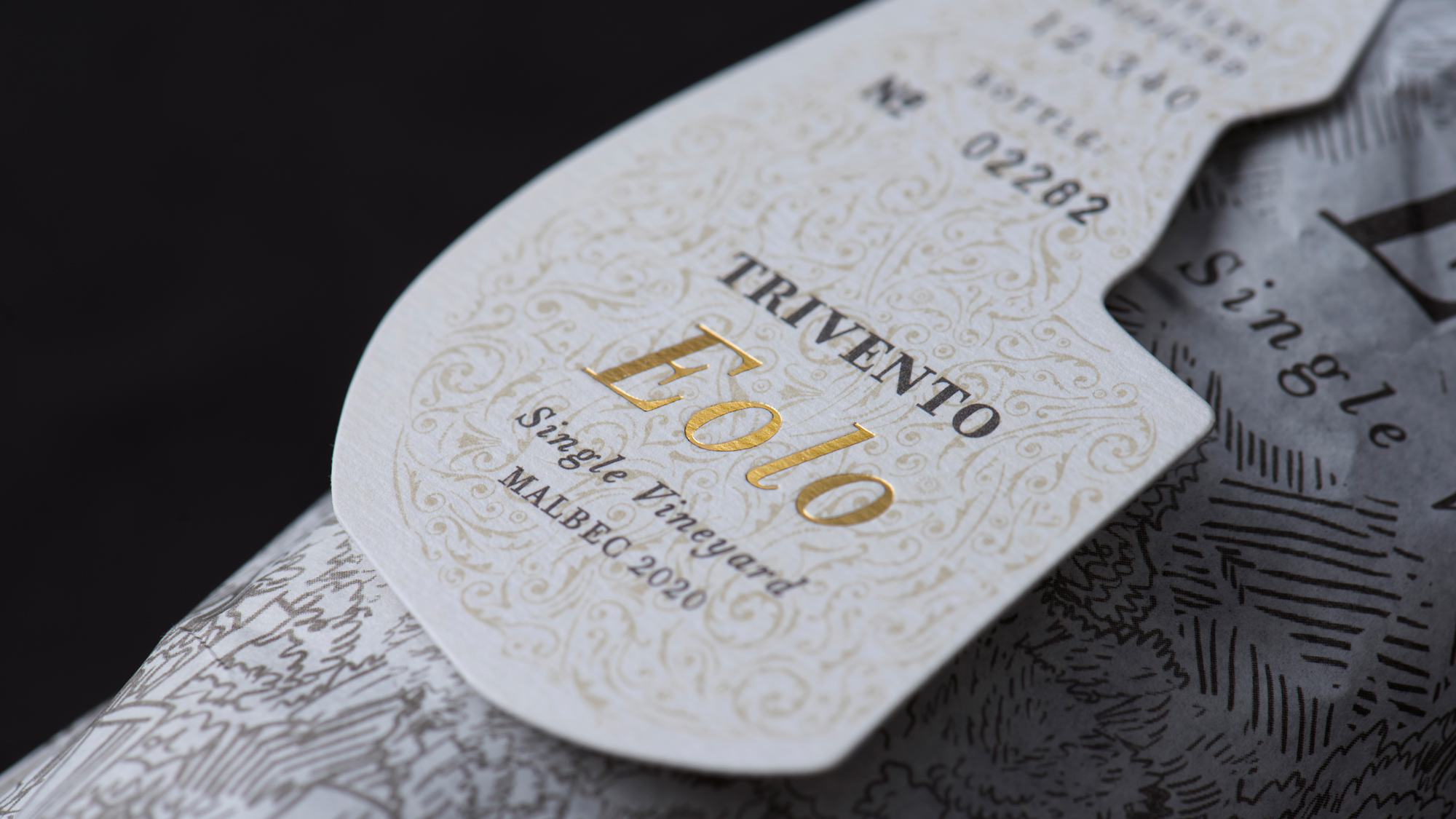 Textures play a key role: printed, in bas-relief, and with volumetric screen printing, they create layers of sensations that evoke the four elements that give life to this terroir. To close the packaging, sulfite paper wraps the bottle with a real illustration of the vineyard, achieving the perfect allegory: a bottled vineyard.