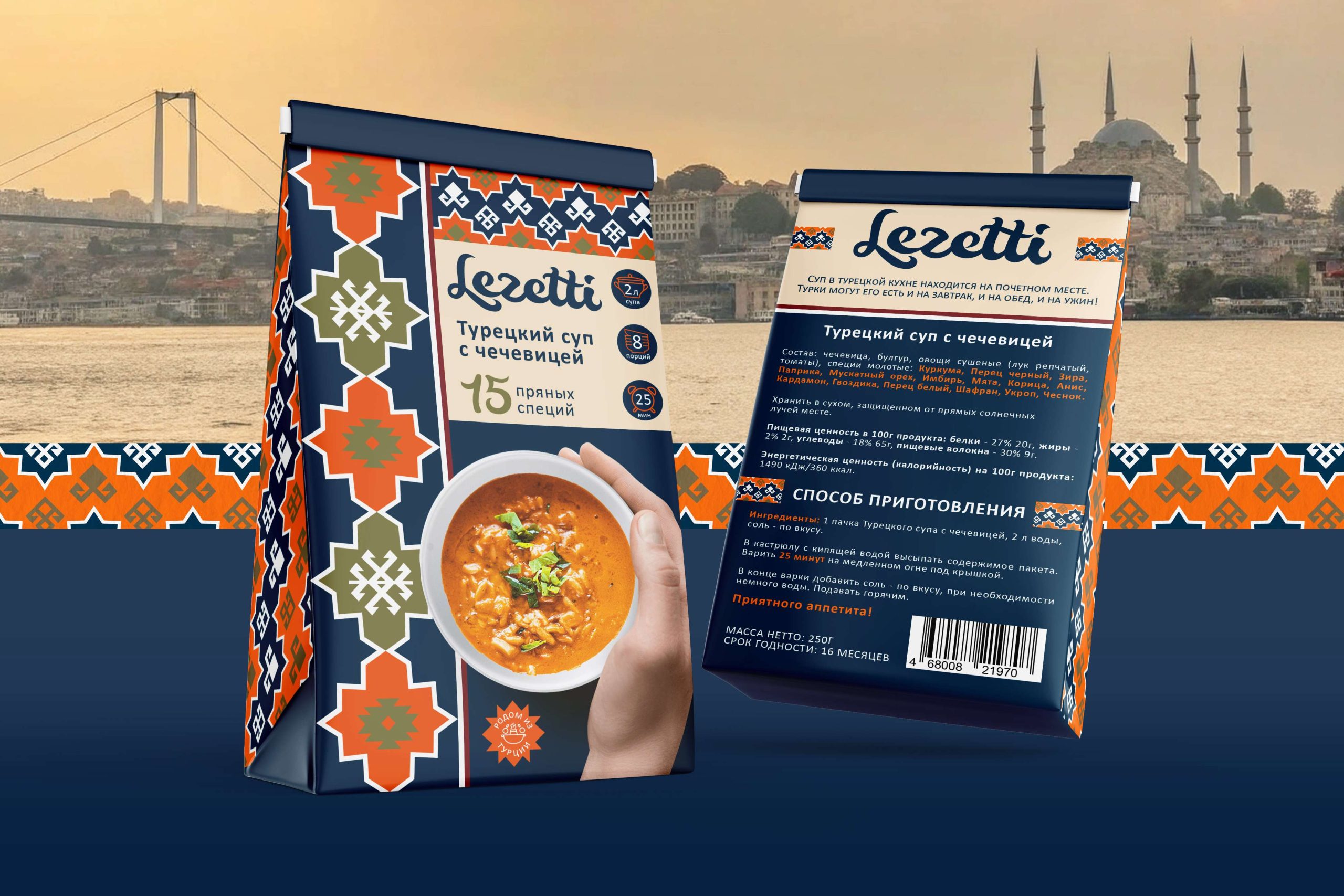 The Lezetti brand pays special attention to the observance of recipes and traditions. Each soup is based on classic Turkish dishes. This allows not only to feel the taste of the homeland, but also to introduce consumers to the cultural aspects of the country. That is why the packaging design is made using traditional ornaments that reflect the color of the country and its dishes.