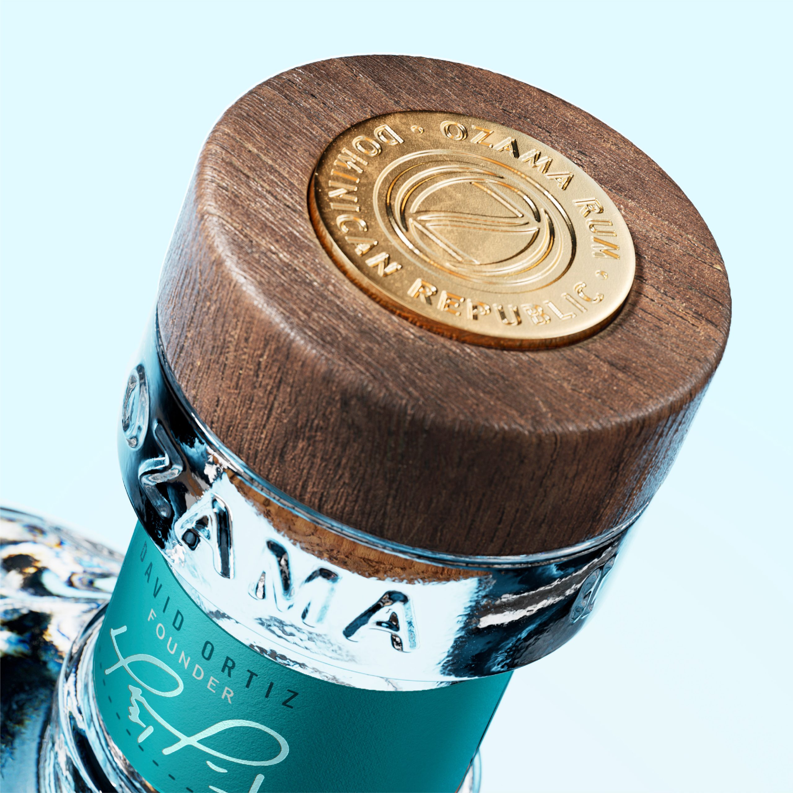 Each of the three expressions carries its own visual signature within a cohesive premiumisation system. Ozama Blanco is dressed in soft aqua tones accented by subtle embossing and varnish, a palette that reflects purity. Ozama Añejo shifts to richer turquoise shades and more pronounced print finishes, elevating details that hint at age and complexity. Ozama Gran Añejo goes deeper still, cloaked in bold teal with intricate foiling and textured layers that speak to depth and maturity. Every bottle is crowned with a wooden closure topped by a three-dimensional engraved gold coin.