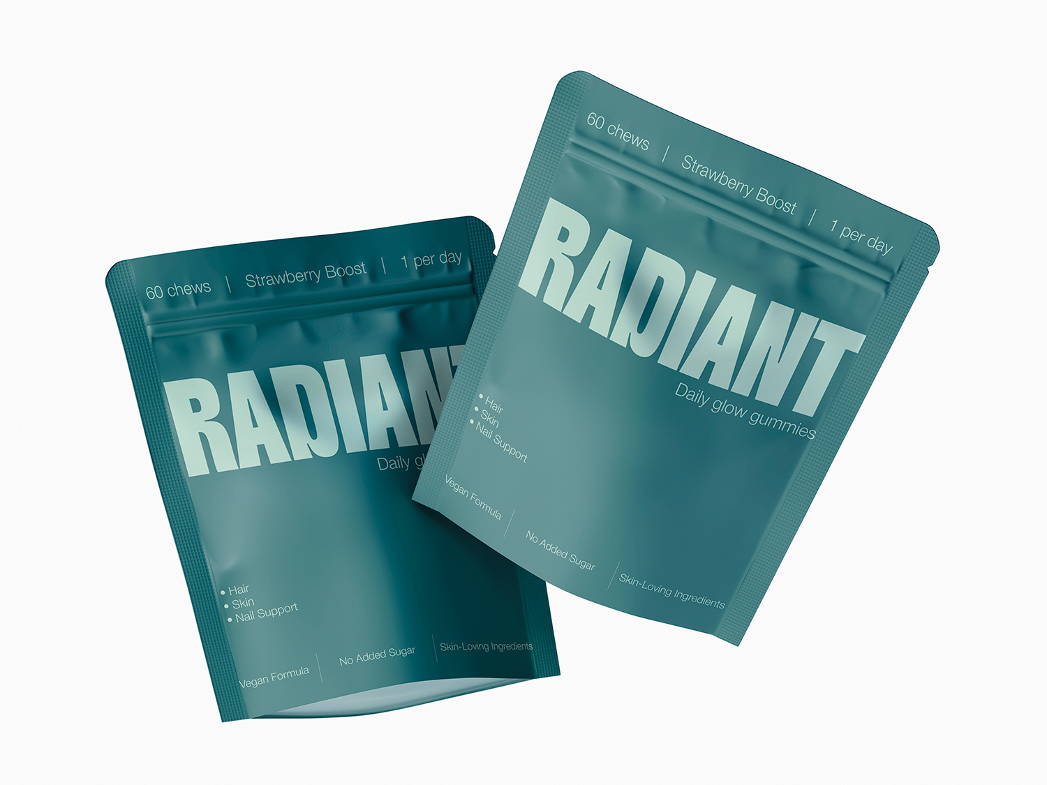 Radiant Glow Gummies is a conceptual packaging project exploring flat-color design and clean layout for a beauty supplement brand. The visual direction is minimal and confident, using a strong purple base and bold typography to create high visibility both on shelves and online. Designed with wellness startups in mind, this project focuses on clarity, appeal, and modern branding principles.
