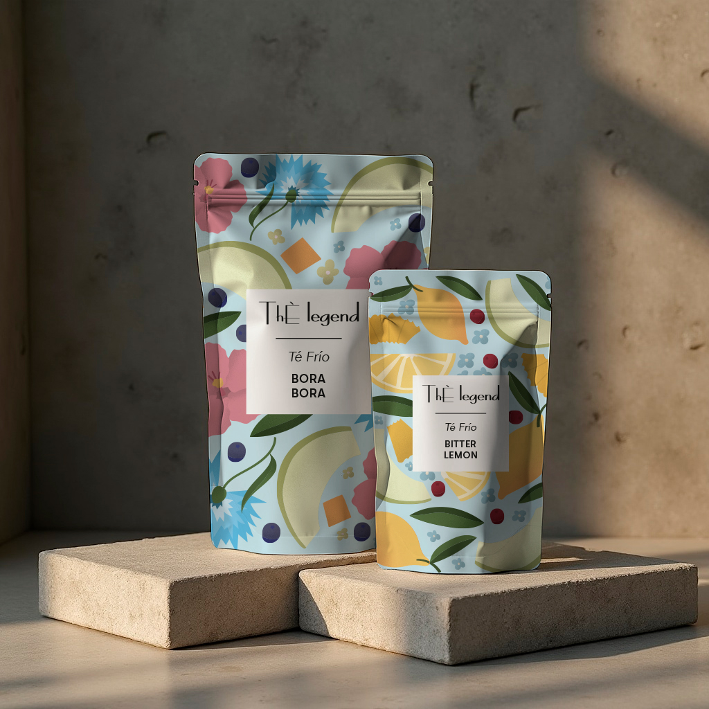 Building on this visual system, the cold tea range—Thé Frío—brings a refreshing twist to the family. These flexible pouch packages retain the brand’s signature illustration style but introduce brighter, lighter color palettes featuring summer fruits like lemon, melon, and berries. The labels are centrally placed and easy to read, with bilingual naming that supports both local and international markets. The background colors are intentionally light and fresh to convey coolness and a thirst-quenching character, ideal for the cold-brew nature of the product.