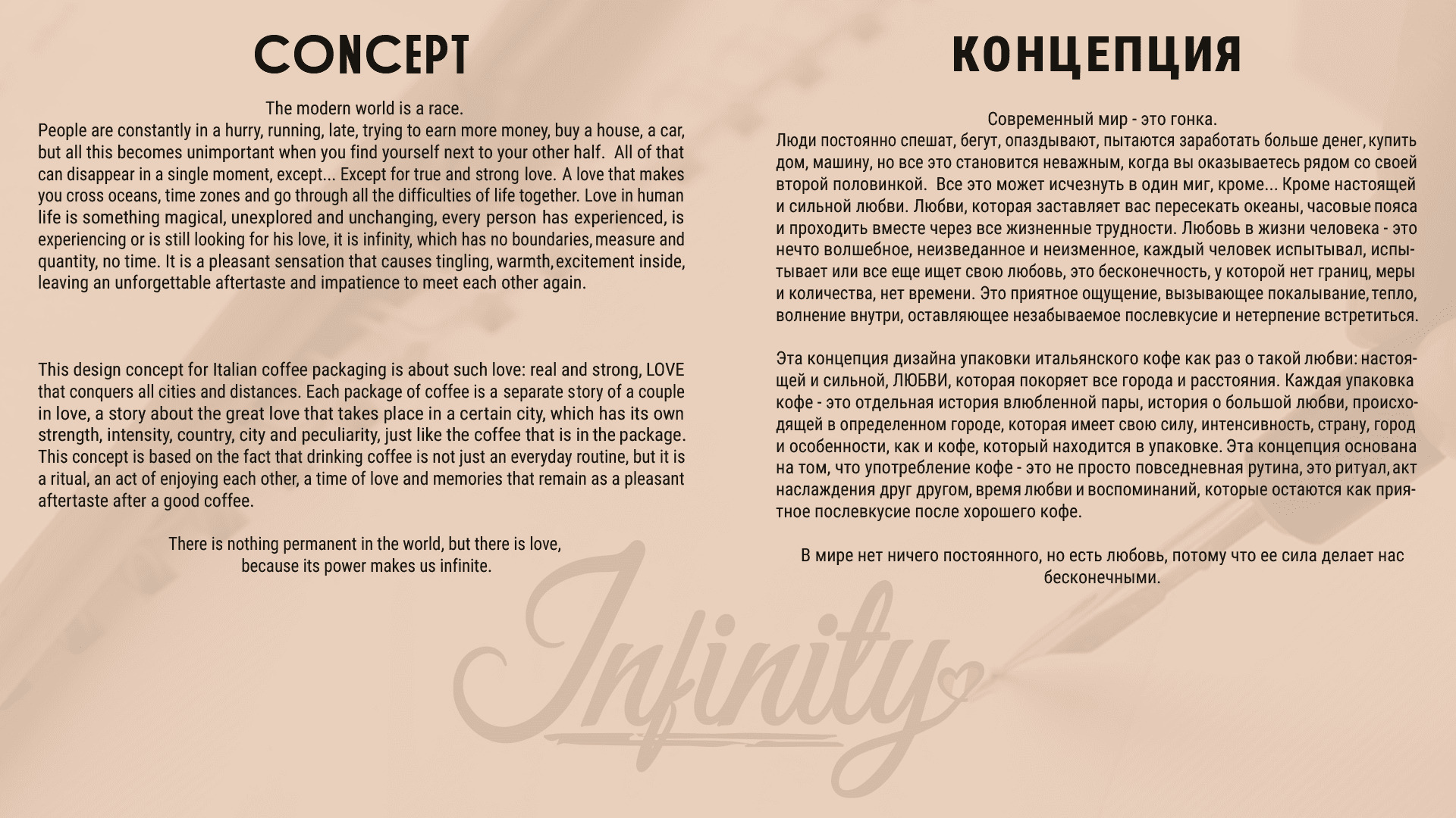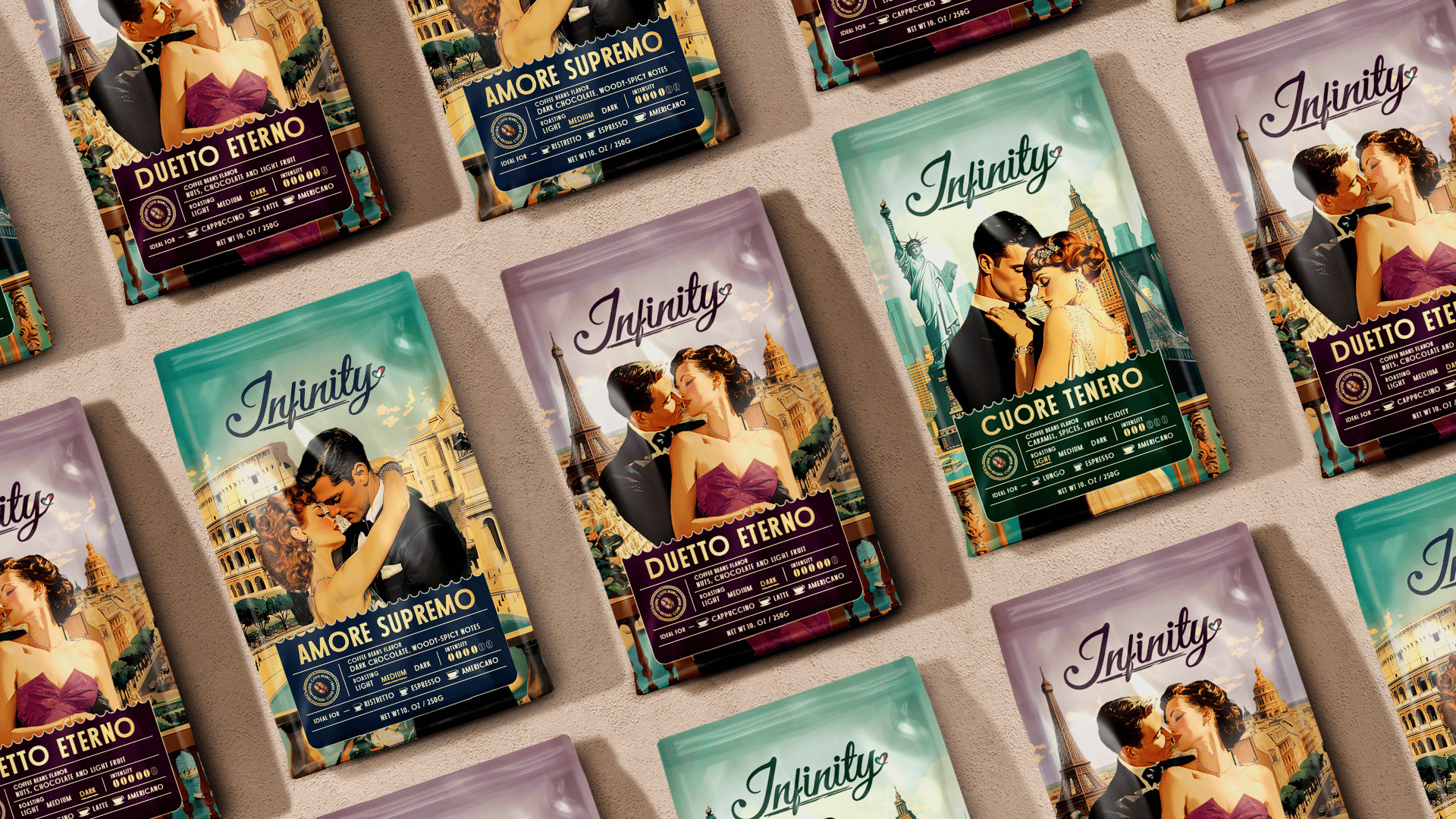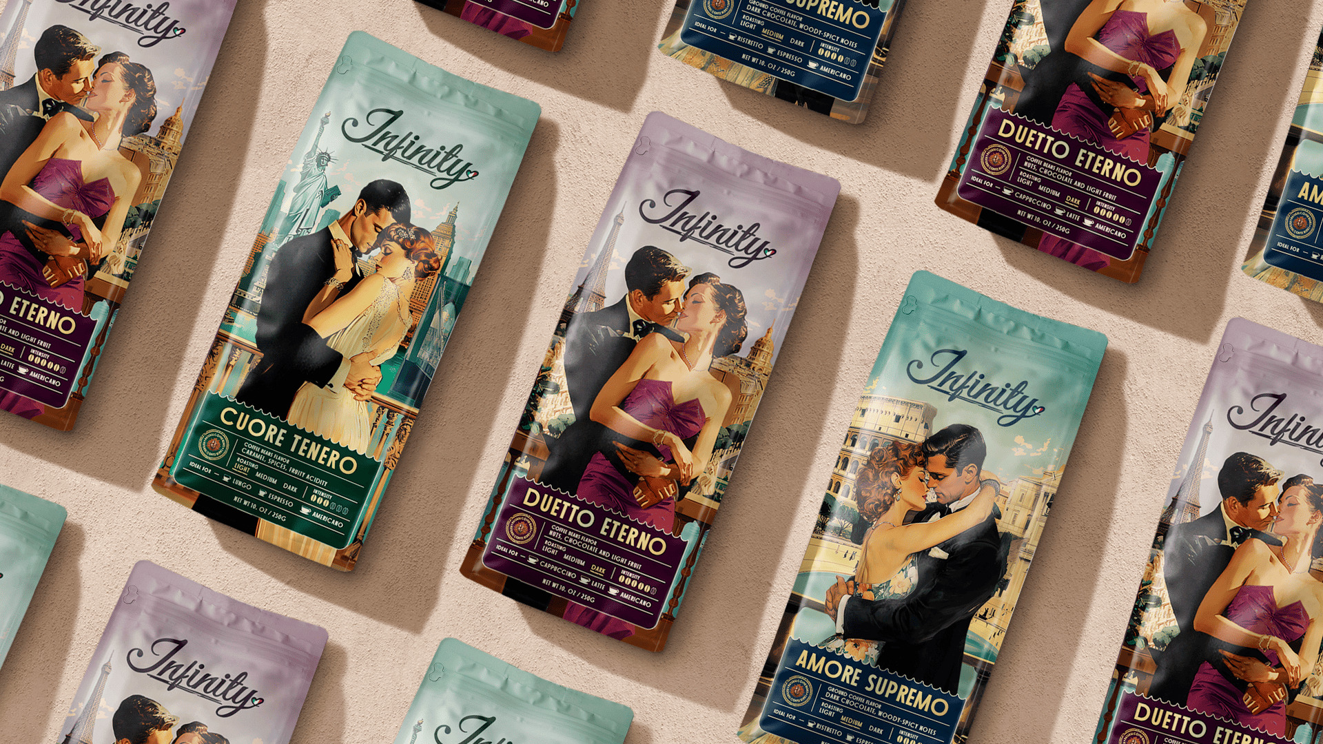 This design concept for Italian coffee packaging is about such love: real and strong, LOVE that conquers all cities and distances. Each package of coffee is a separate story of a couple in love, a story about the great love that takes place in a certain city, which has its own strength, intensity, country, city and peculiarity, just like the coffee that is in the package.