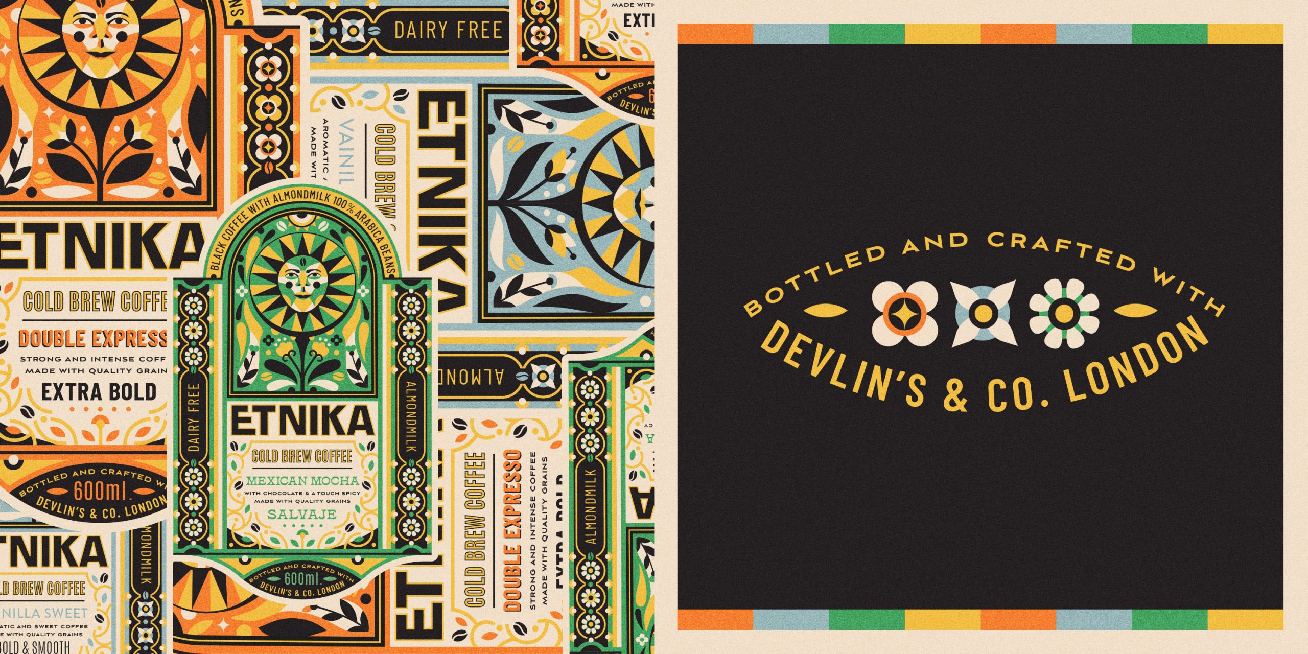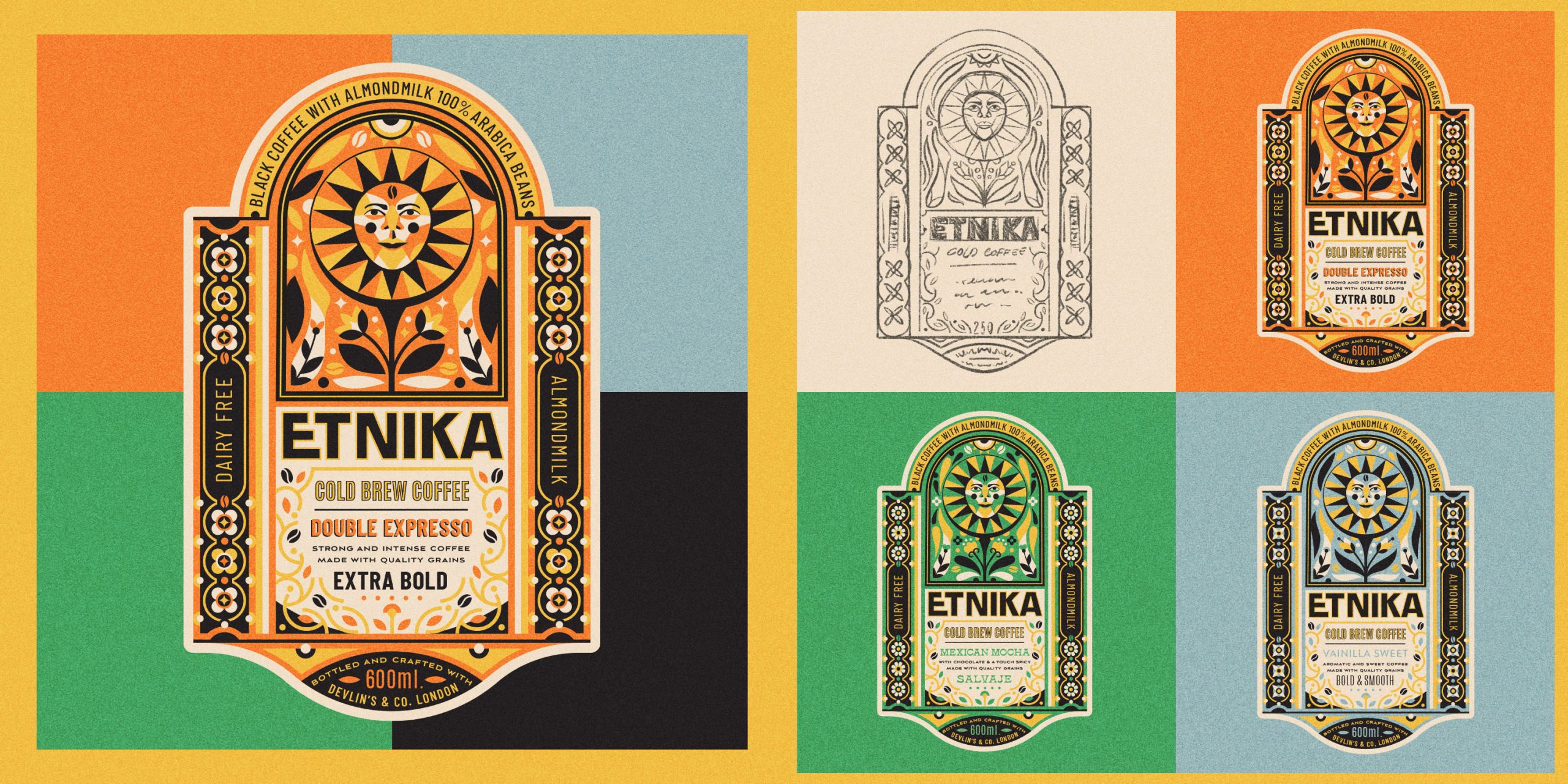Packaging design and illustration, along with graphic language, for the London-based cold brew coffee brand ETNIKA. They needed a modern image that reflected nature, the production process, and the quality of the beans. Each variety is made with beans from a different country, with its own geography, climate, and culture. Therefore, the design had to present a folkloric and colorful style, not tied to a particular country or culture, but rather represent a language that evokes culture, customs, and ethnicities with a new, unique brand language.