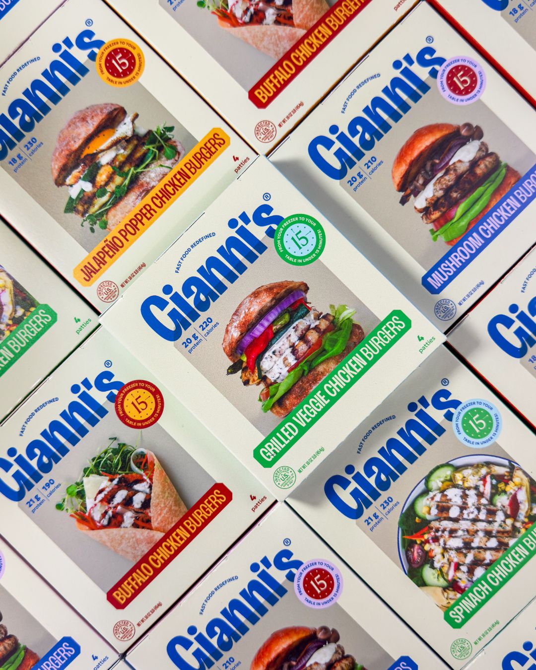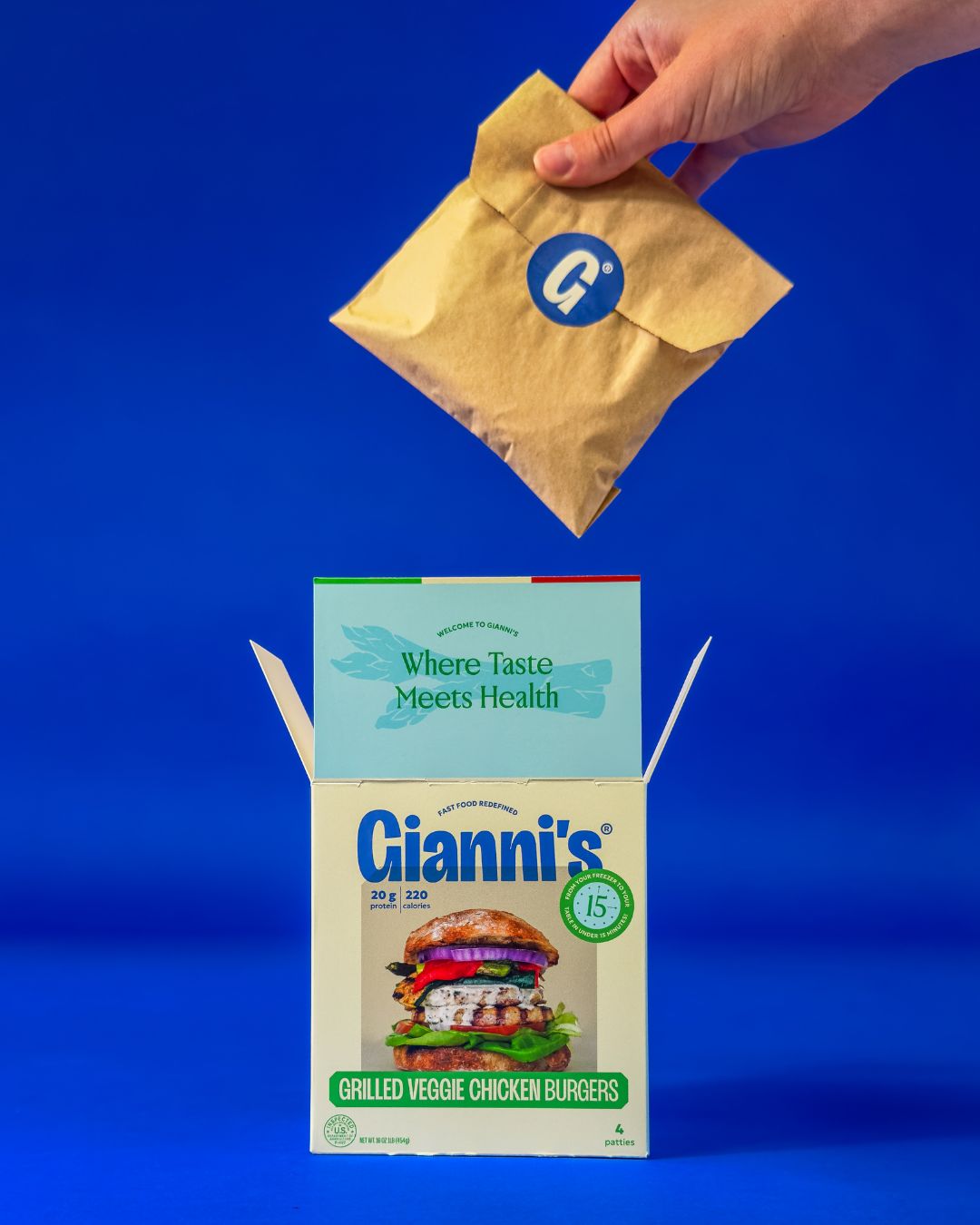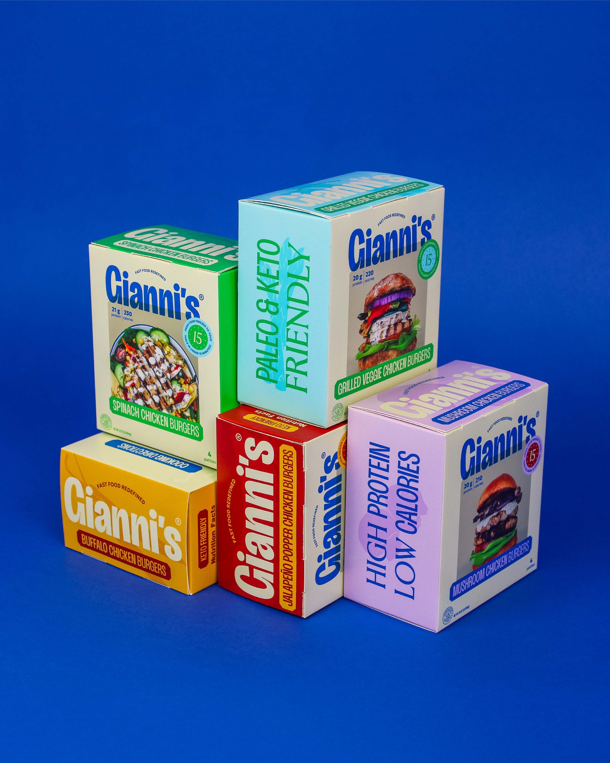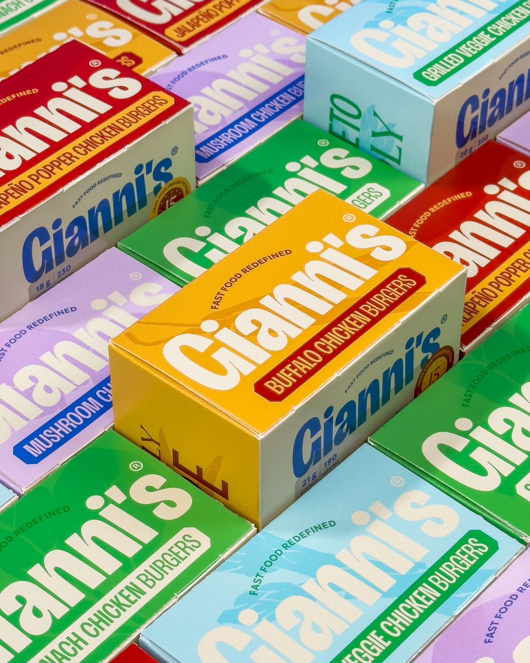 Blending retro design details with modern accents, the frozen food packaging for Gianni’s Fast Food designed by Leadoff Studio showcases the all-natural burger front and center on a parchment colored backdrop, with a sliver of the Italian flag along the edge of the top panel to bring the consumer back to the brand’s roots. The brand as a whole is greatly influenced by Italian design heritage.