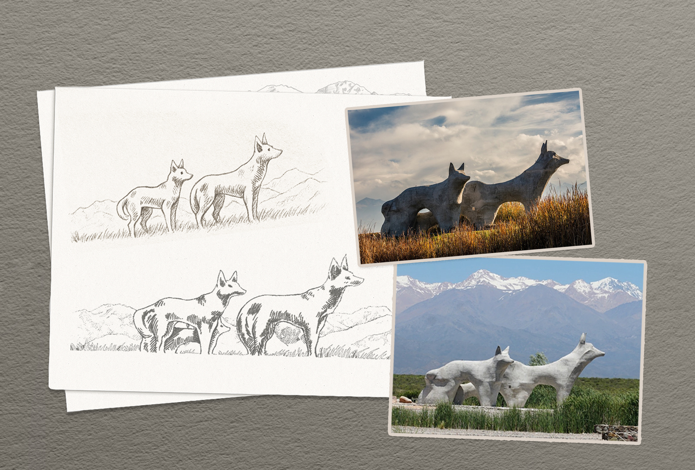 To achieve this, we chose an iconic element from the vineyard: three monumental white fox sculptures that rise amidst the vineyard rows. Widely photographed and shared by visitors to the winery, this image has become a spontaneous and recognizable emblem of La Isabel Estate. Drawing inspiration from this reference, we developed an illustration that captures the symbolic and sculptural power of these figures, turning them into the visual centerpiece of the label.