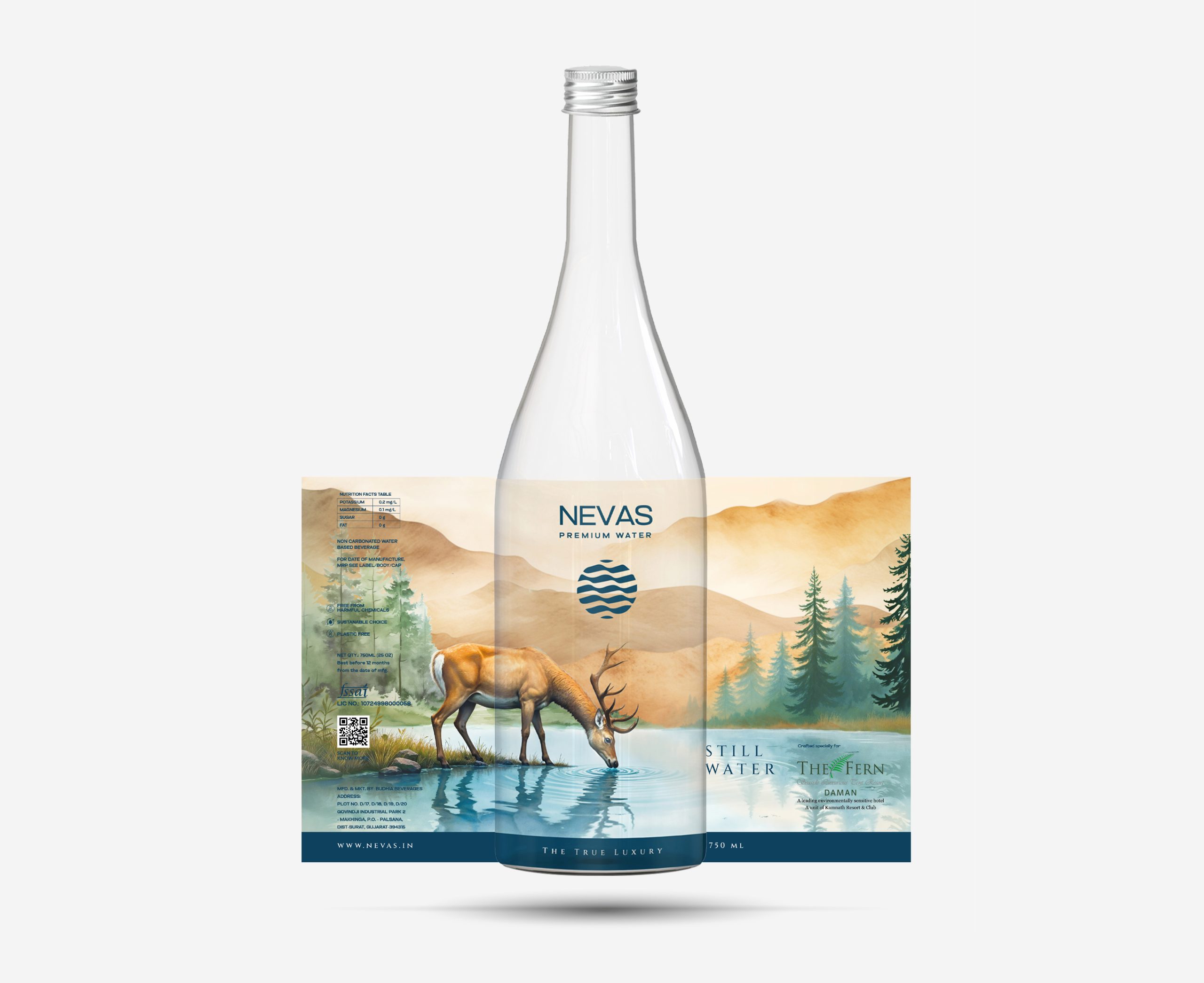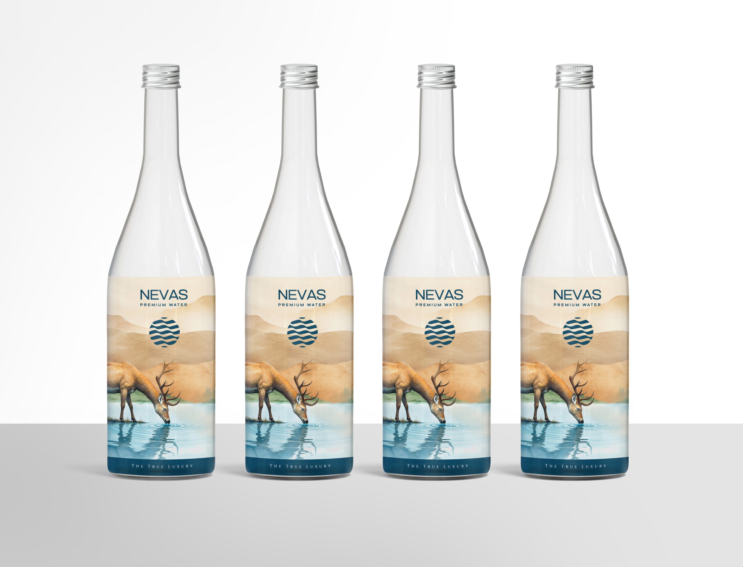 The label depicts a deer pausing at a serene waterbody in a desert-like landscape, a visual metaphor of the eternal search for freshness and purity. In many cultures, the deer symbolizes gentleness, grace, and the instinct to seek what sustains life. Here, the deer encounters not a mirage, but true water—representing NEVAS as the rare discovery of authenticity in a world full of illusions.