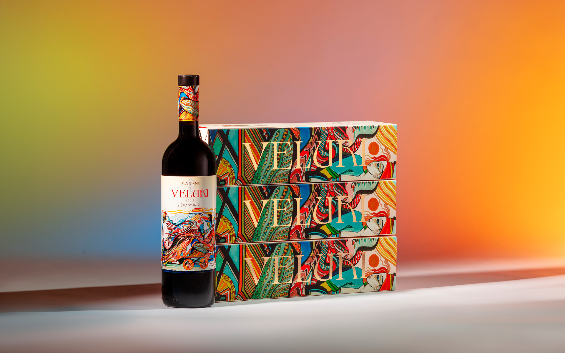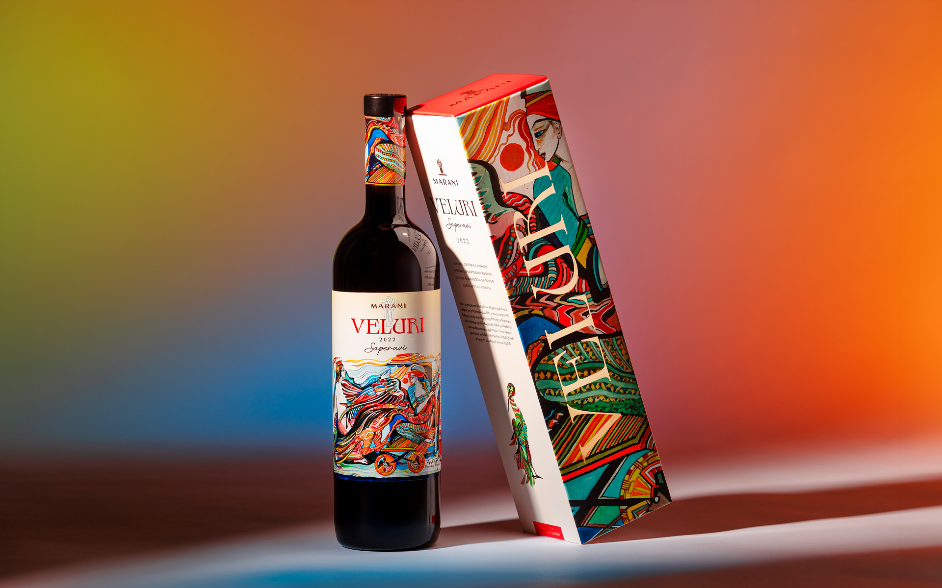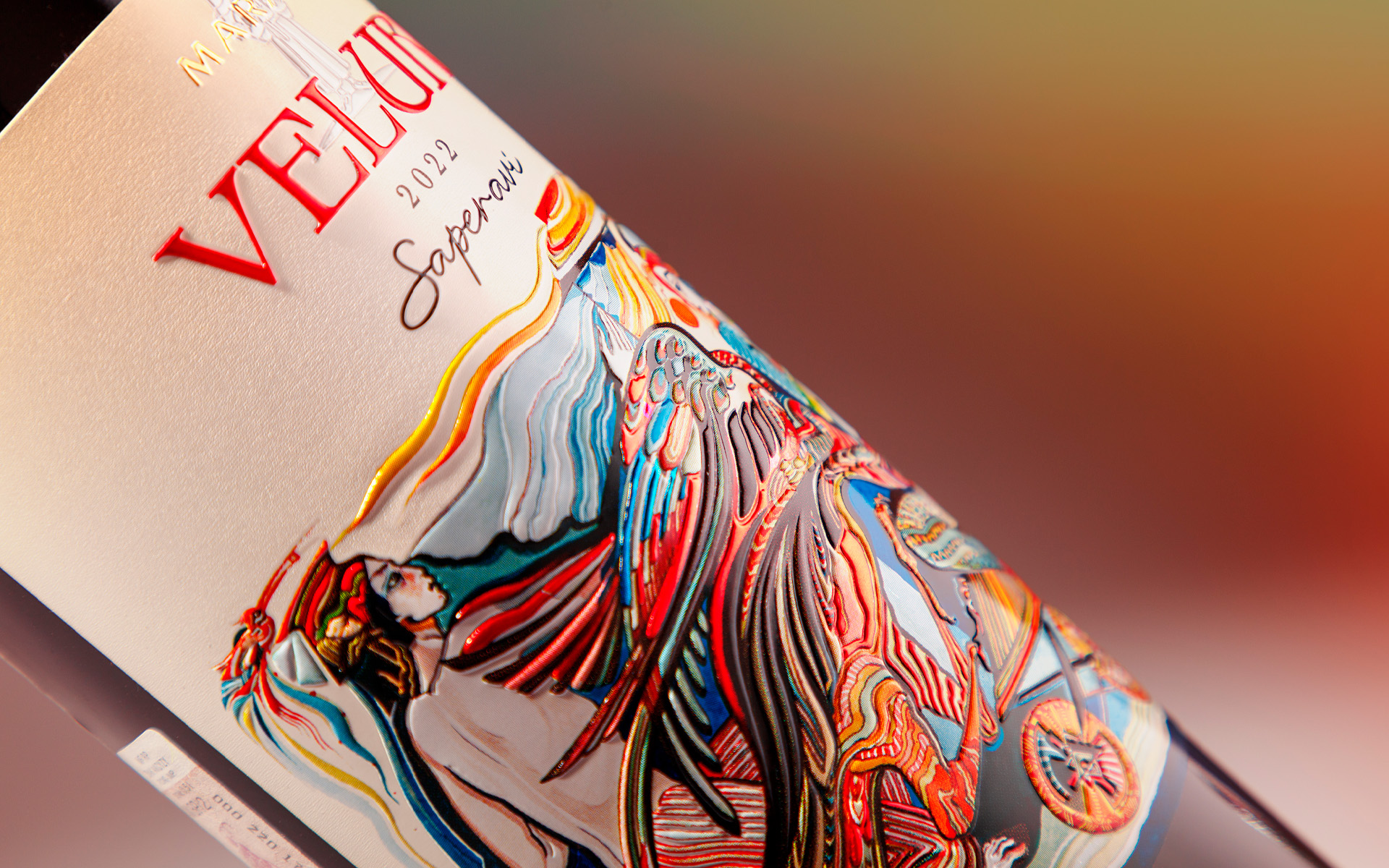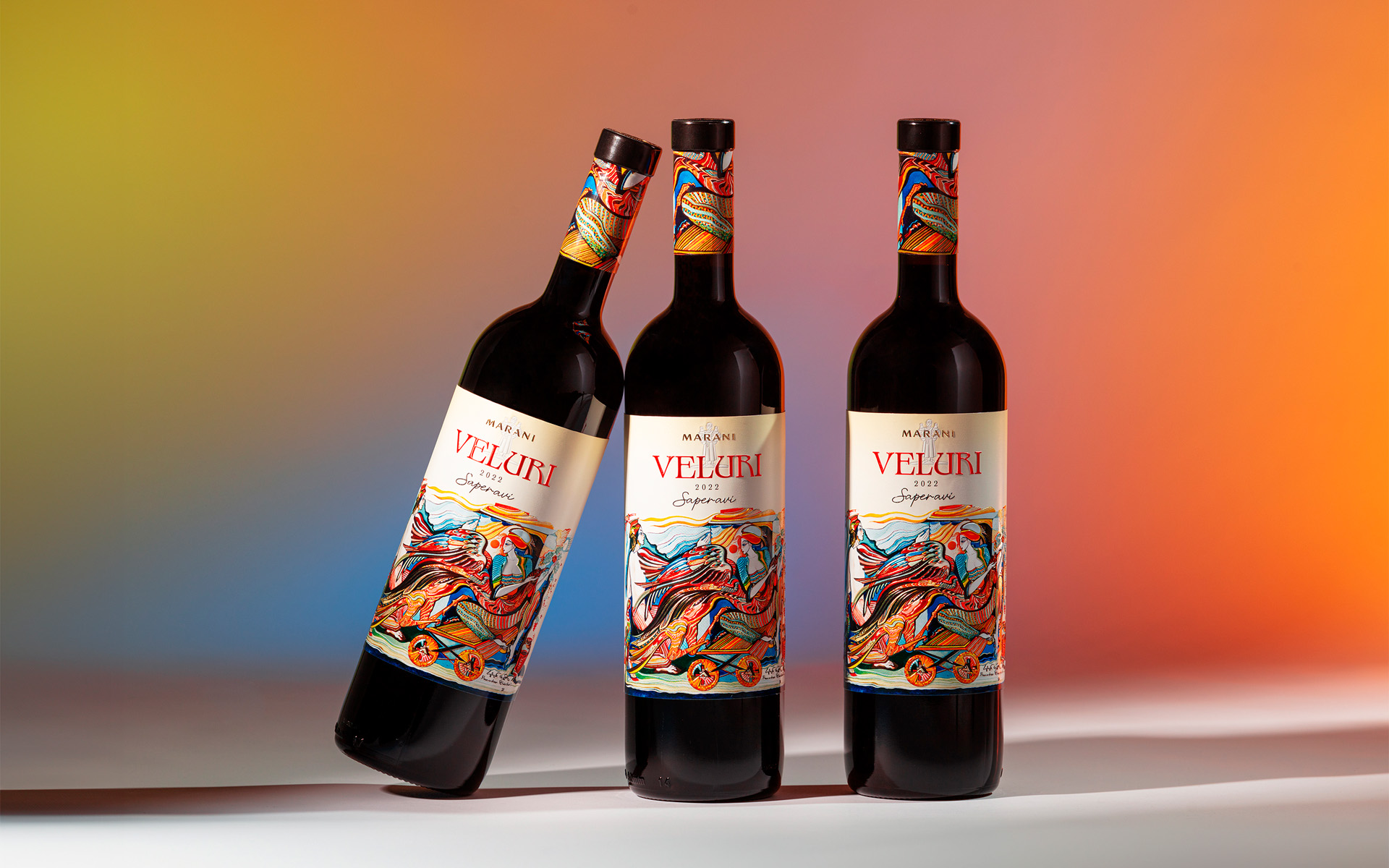 Marani Veluri Superavi stands as a testament to how art and design can transform wine packaging into a true sensorial masterpiece. At the core of its identity lies The Wild Autumn, an exclusive watercolor by the acclaimed Georgian artist Rusudan Petviashvili. Our creative team reinterpreted this evocative work, seamlessly adapting it to the bottle and allowing the painting to become both canvas and narrative.