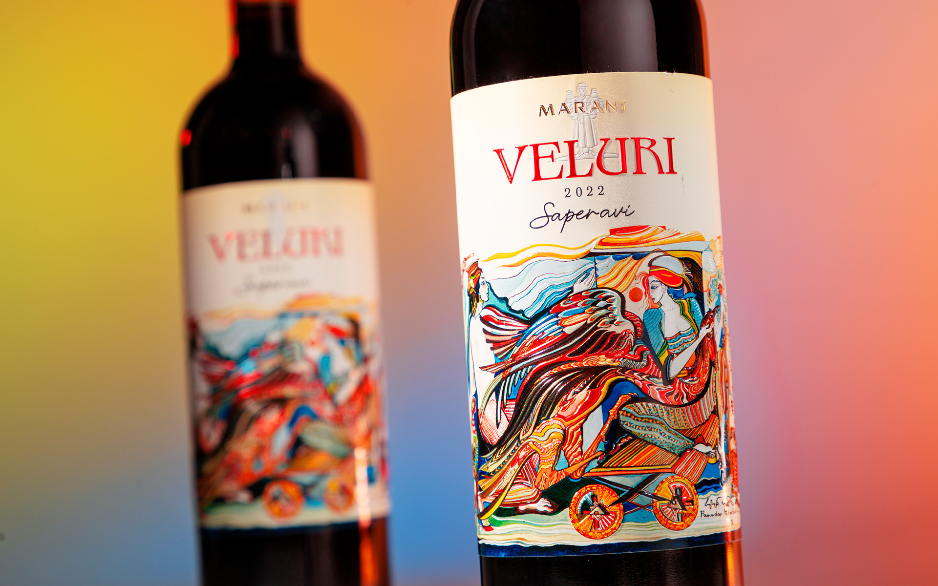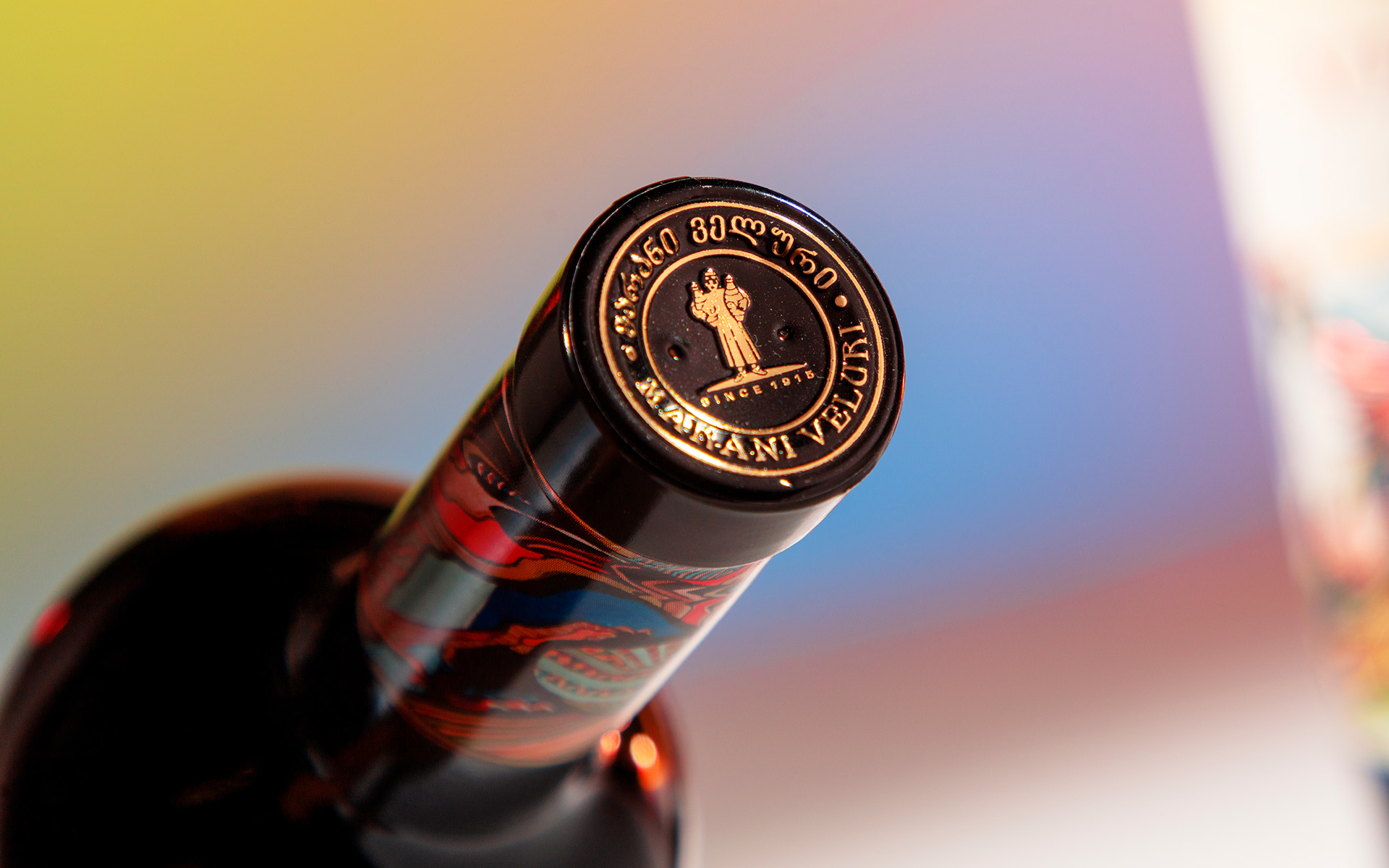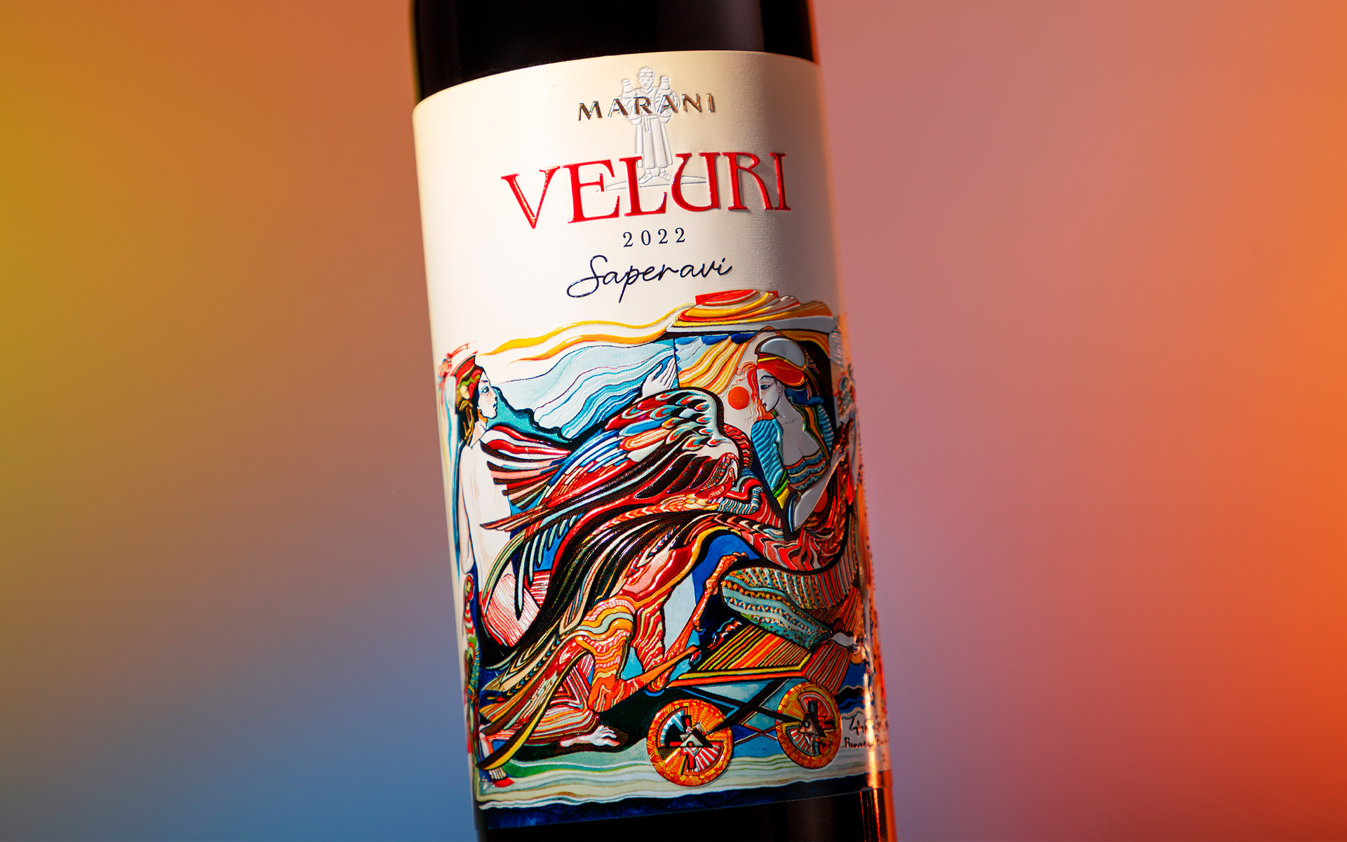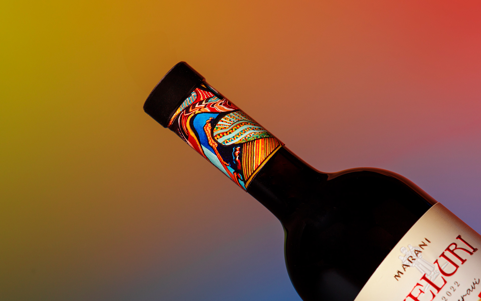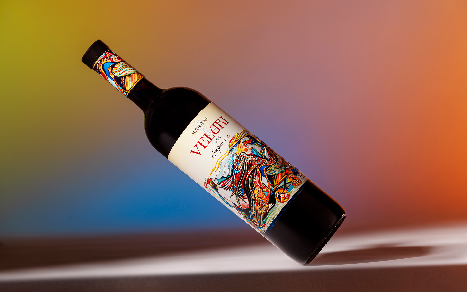 Marani Veluri Superavi stands as a testament to how art and design can transform wine packaging into a true sensorial masterpiece. At the core of its identity lies The Wild Autumn, an exclusive watercolor by the acclaimed Georgian artist Rusudan Petviashvili. Our creative team reinterpreted this evocative work, seamlessly adapting it to the bottle and allowing the painting to become both canvas and narrative.