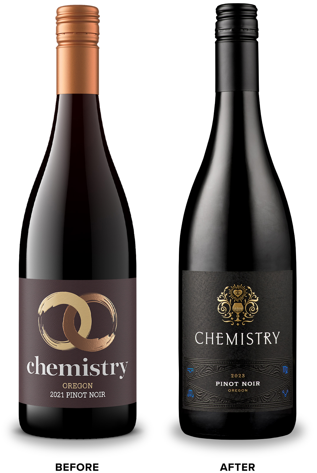Chemistry by Stoller Wine Group was restaged to embody the synergy between the technical and artistic aspects of crafting exceptional wine. The new packaging was designed to attract a younger consumer seeking beautiful wines at an exceptional value.