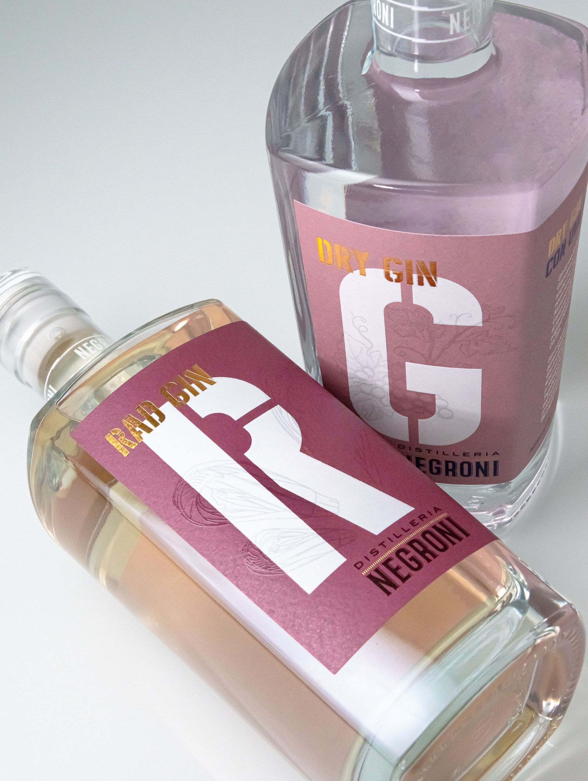 The packaging for Dry Gin G and Rad Gin by Distilleria Negroni combines bold local identity with refined material experimentation.