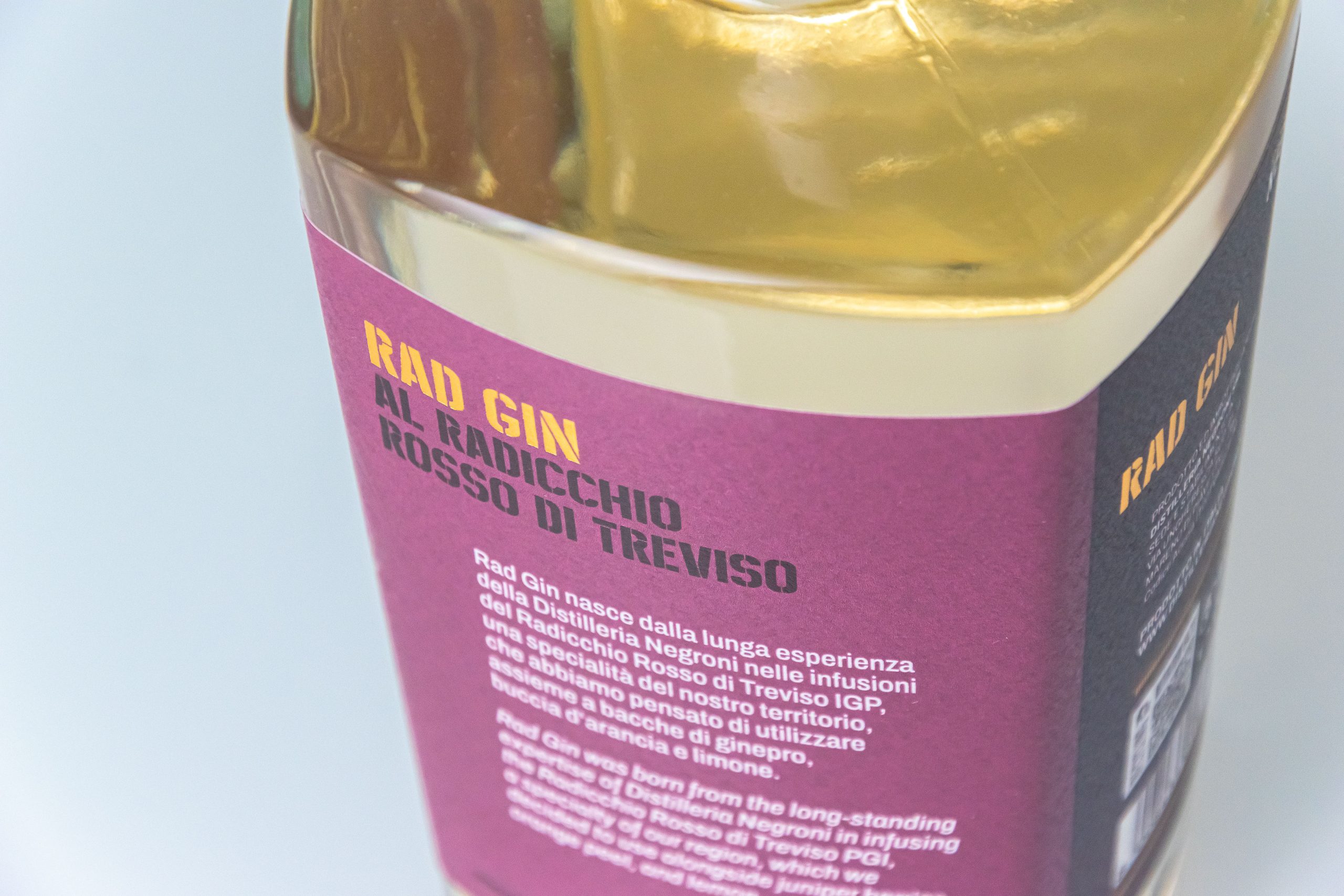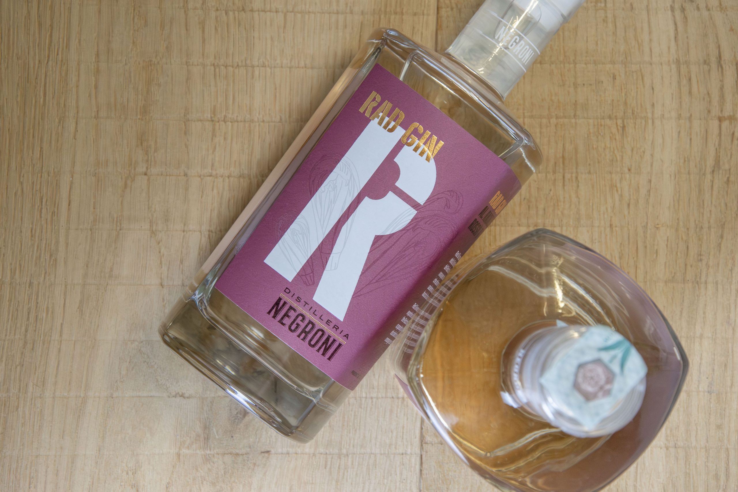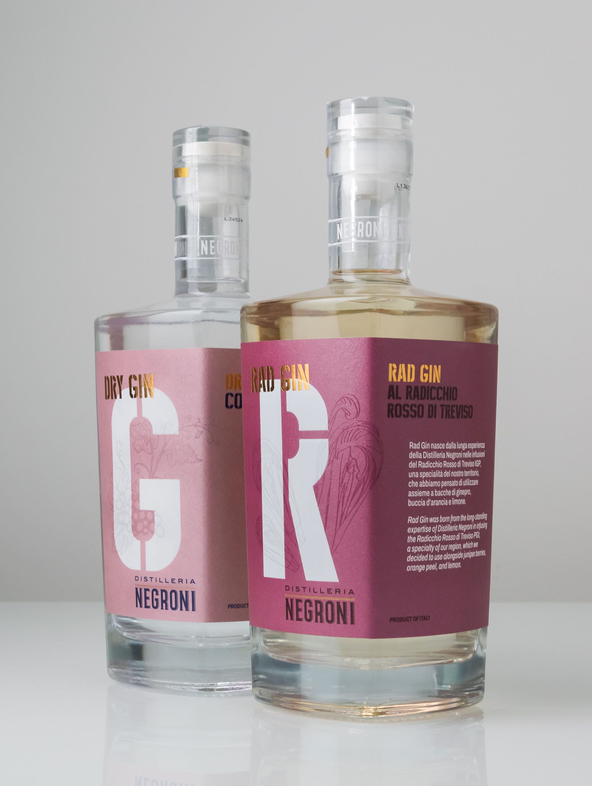 Dry Gin G celebrates the passion of Giancarlo, Negroni’s founder, for Isabella grapes – also known as Concord grapes – cultivated on the family estate in Volpago del Montello. Rad Gin pays homage to the distillery’s heritage in crafting botanical infusions, featuring Radicchio Rosso di Treviso IGP, a signature ingredient of the Veneto region, along with juniper berries, orange peel, and lemon peel.