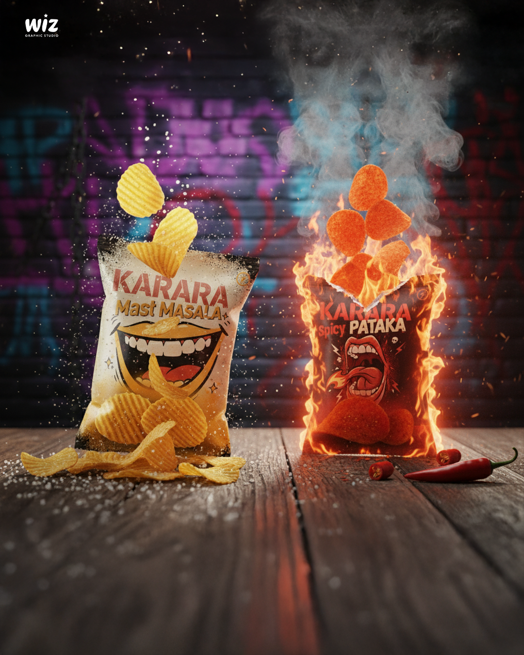 A vibrant conceptual packaging design that uses expressive mouth emotions to depict taste bud’s reactions fiery thrill for the spicy pataka variant and calm delight for the mast masala celebrating India’s love for bold masalas.