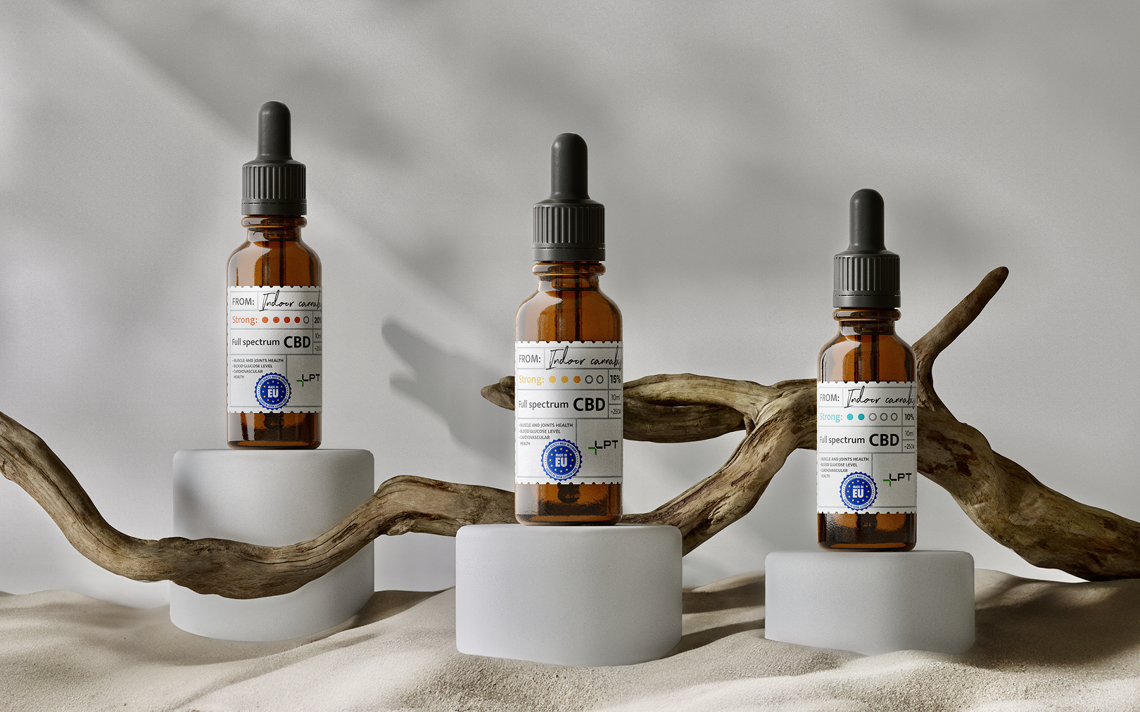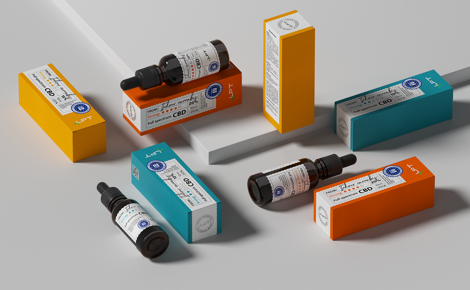Сolours reflect the intensity level of the product, creating a balance between classic pharmacy products and modern design. We started from the fact that green, yellow and red are intuitive to the user, and selected softer shades to continue the idea that the oil is used for relaxation and good sleep.