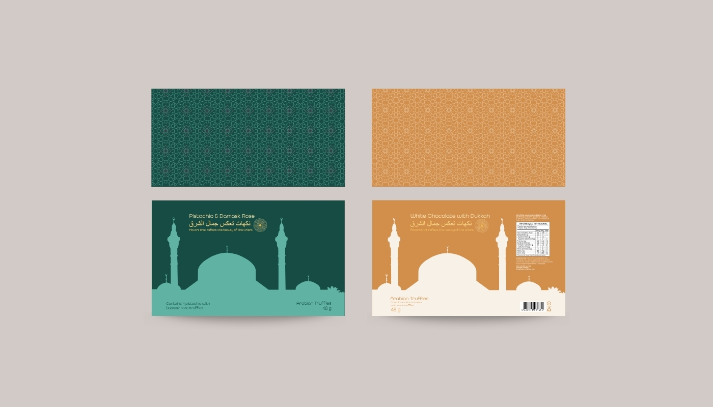 The project focused on developing two packaging designs for gourmet truffles—Pistachio with Damask Rose and White Chocolate with Dukkah—conceived in direct connection with the culture and architecture of Jordan, their place of origin.
