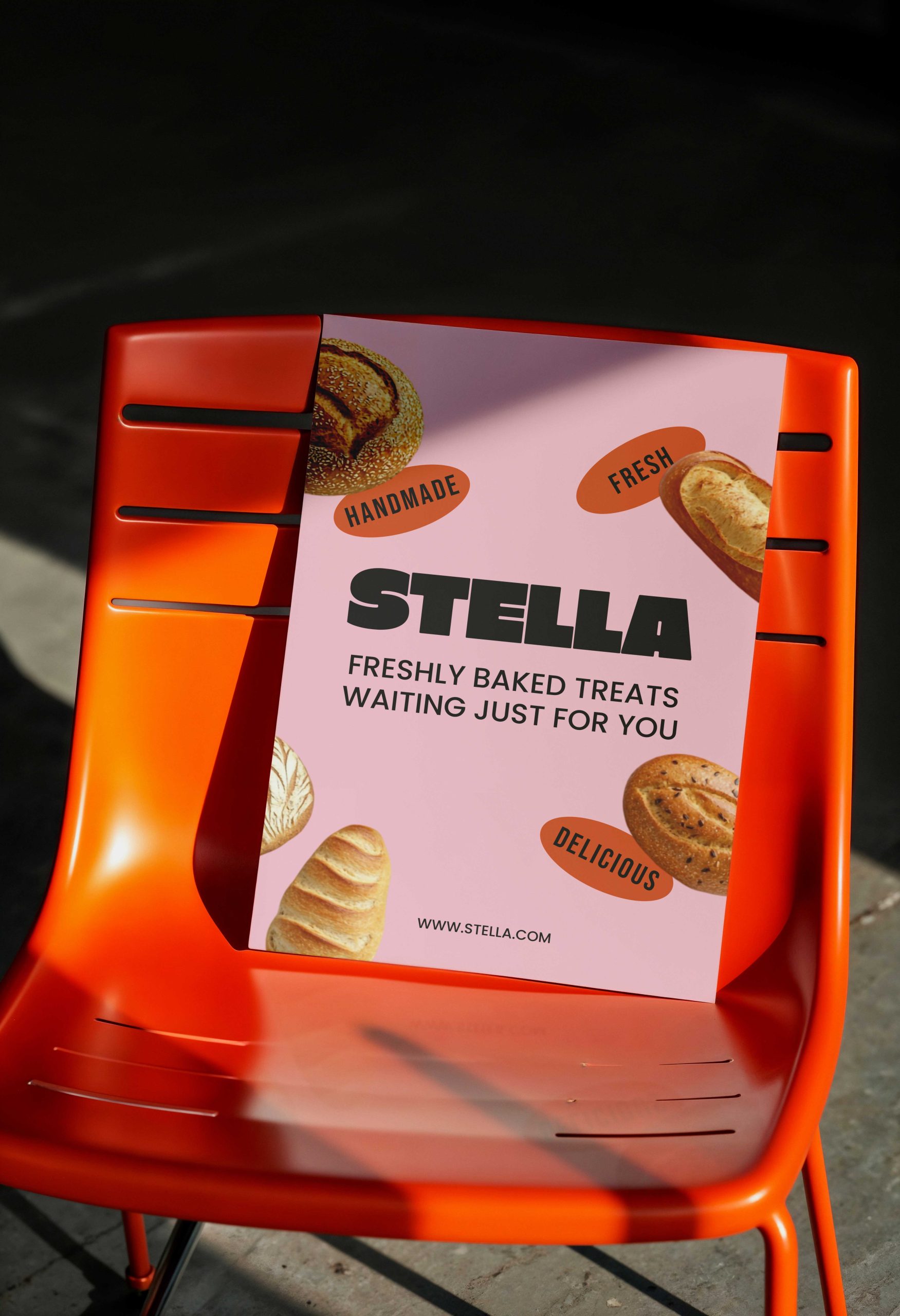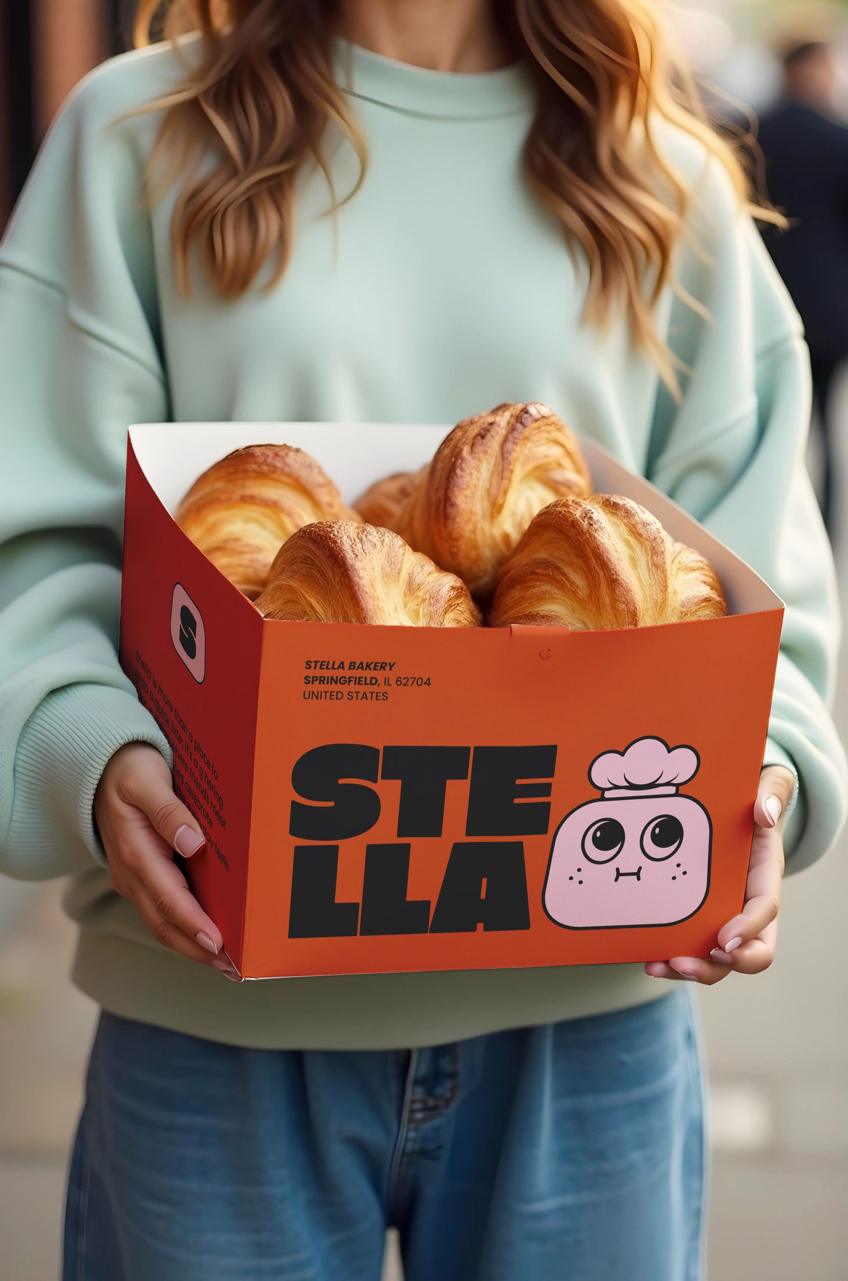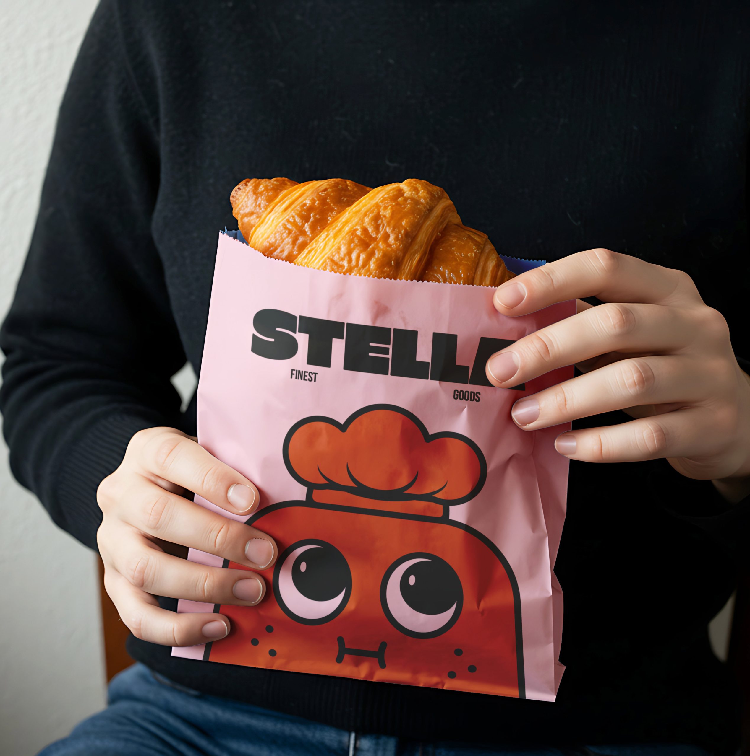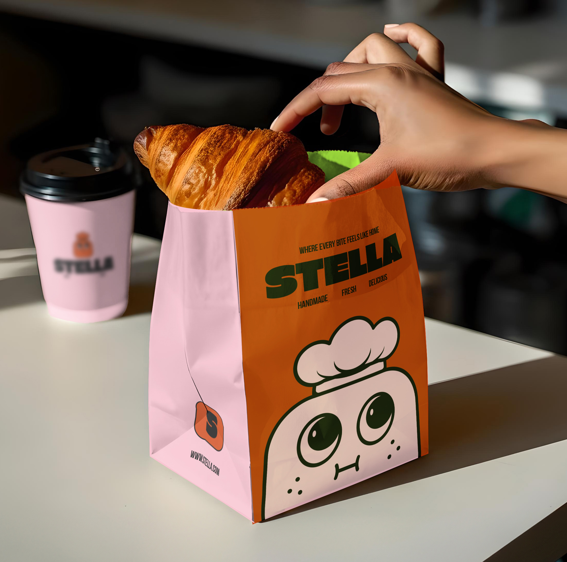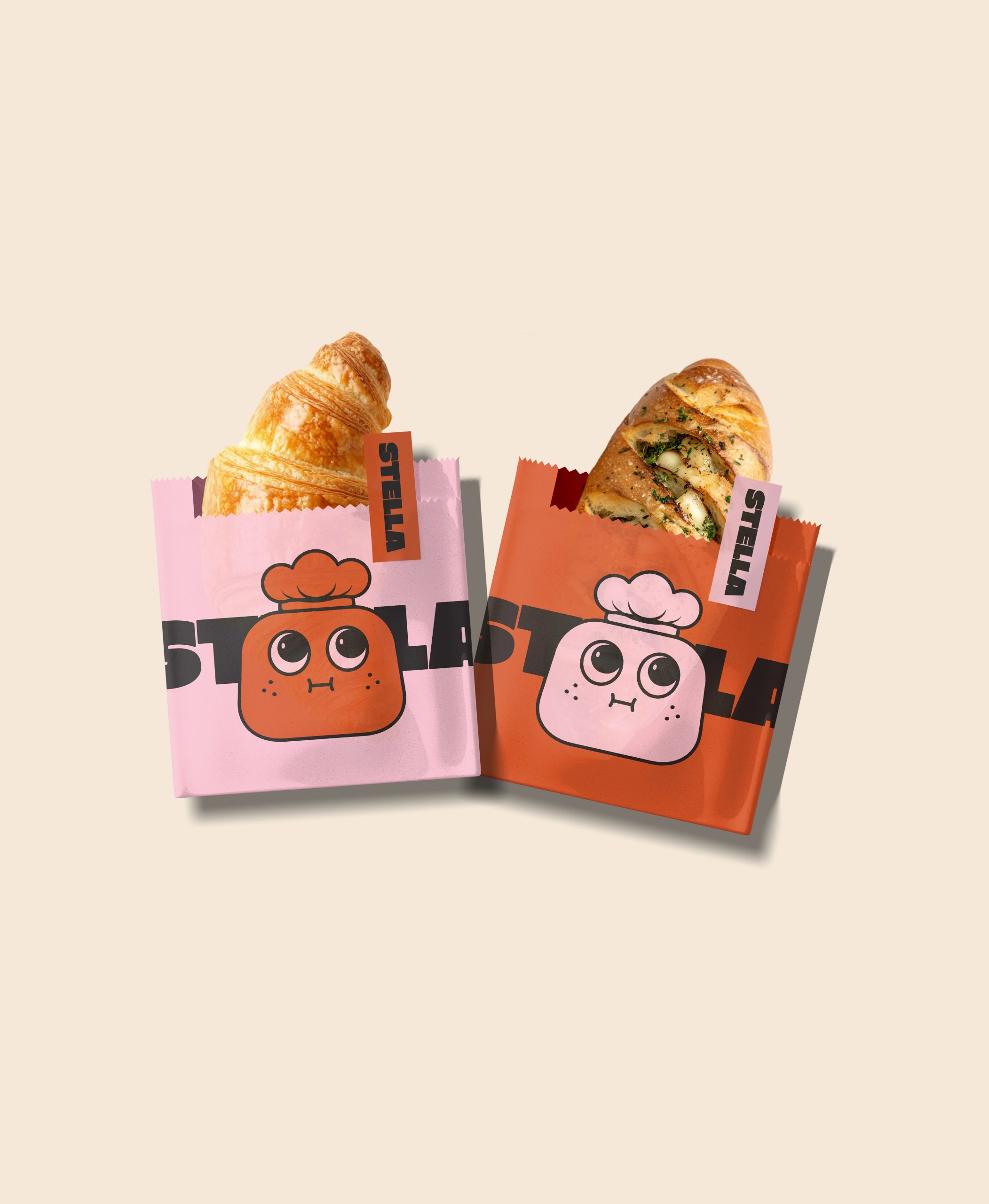 😍 We used bright colors like orange, pink, and black, used a bold and modern typeface, and added a fun illustration to give the brand a unique and happy look. It’s made to grab attention and feel fresh — just like the bakery items inside.
