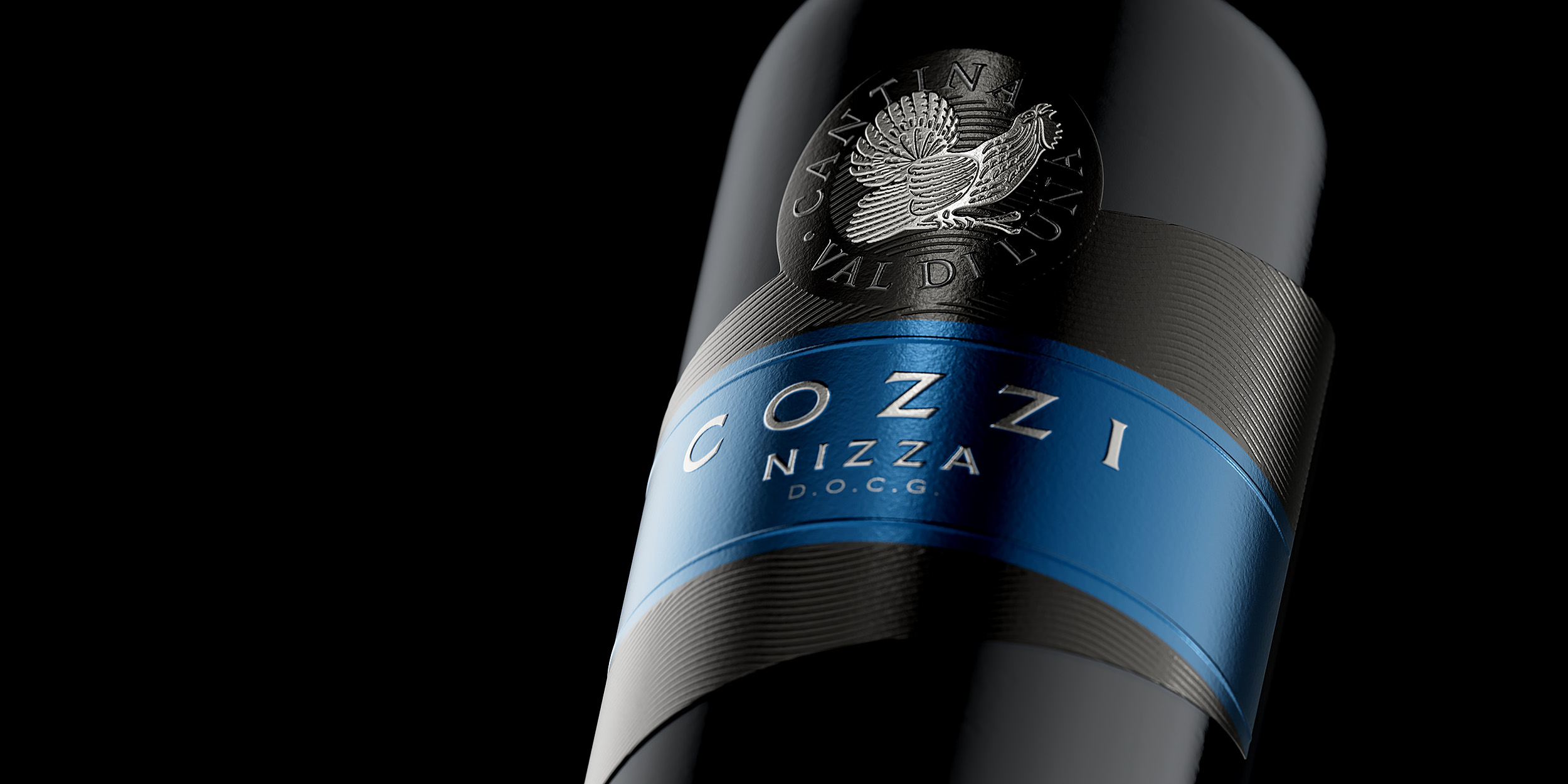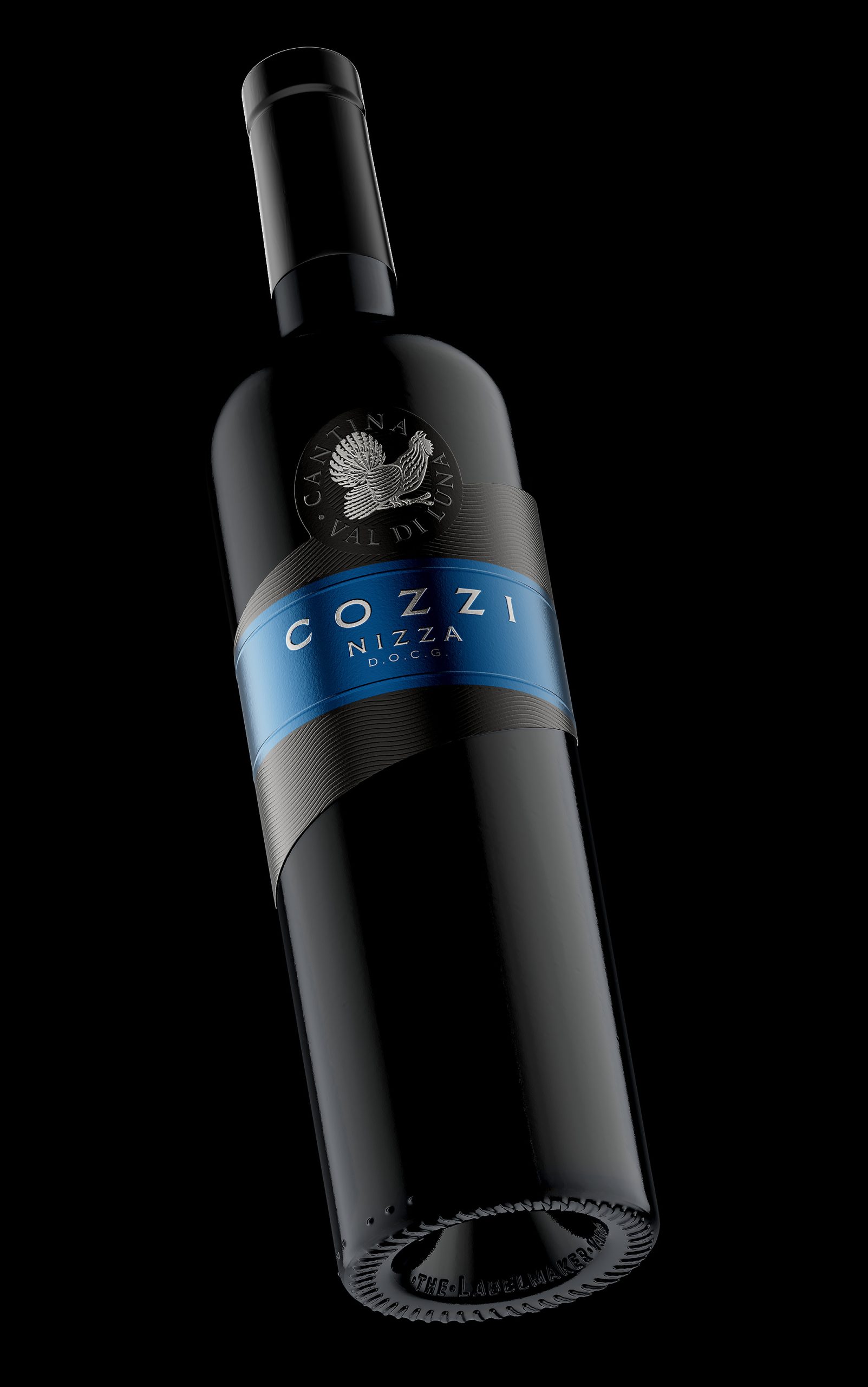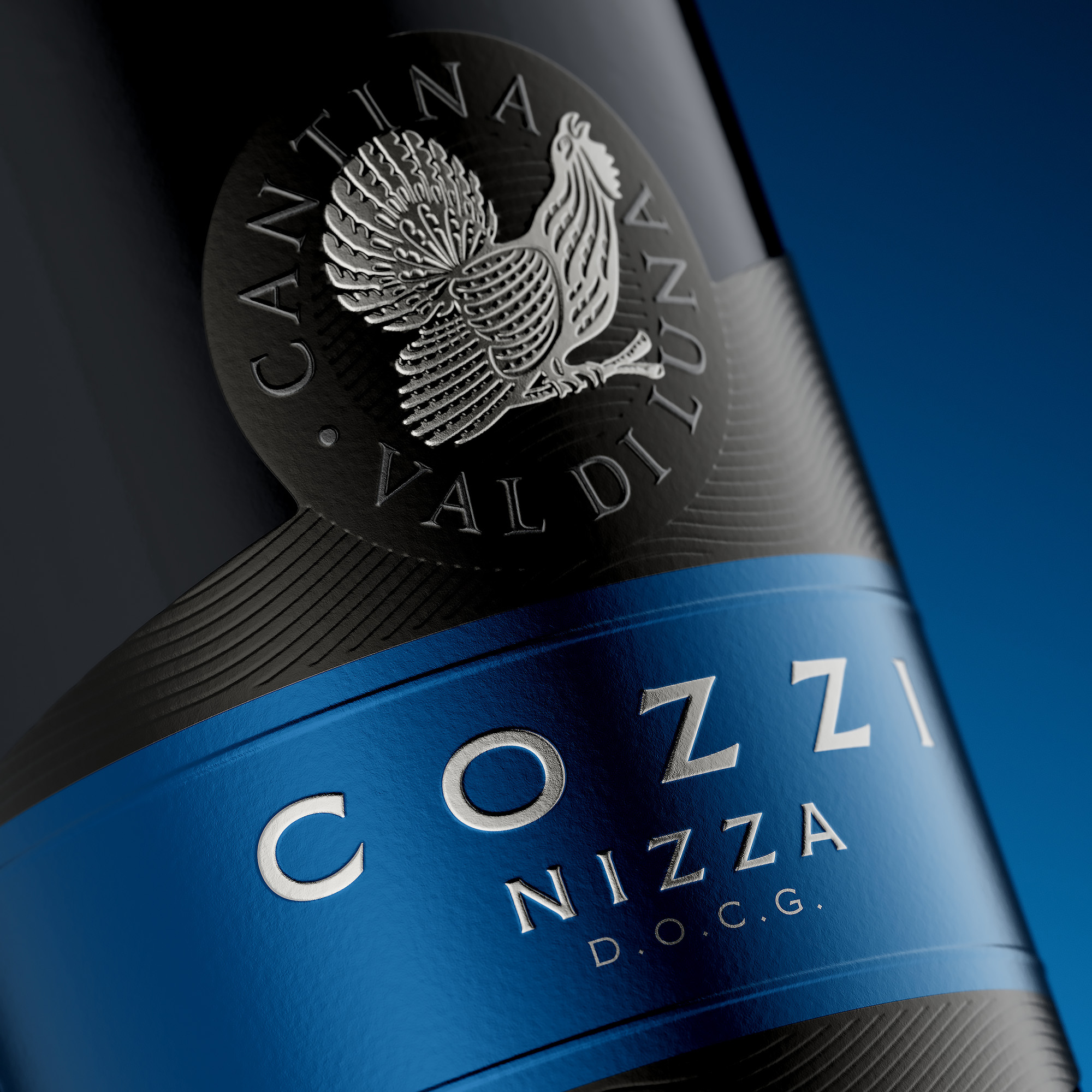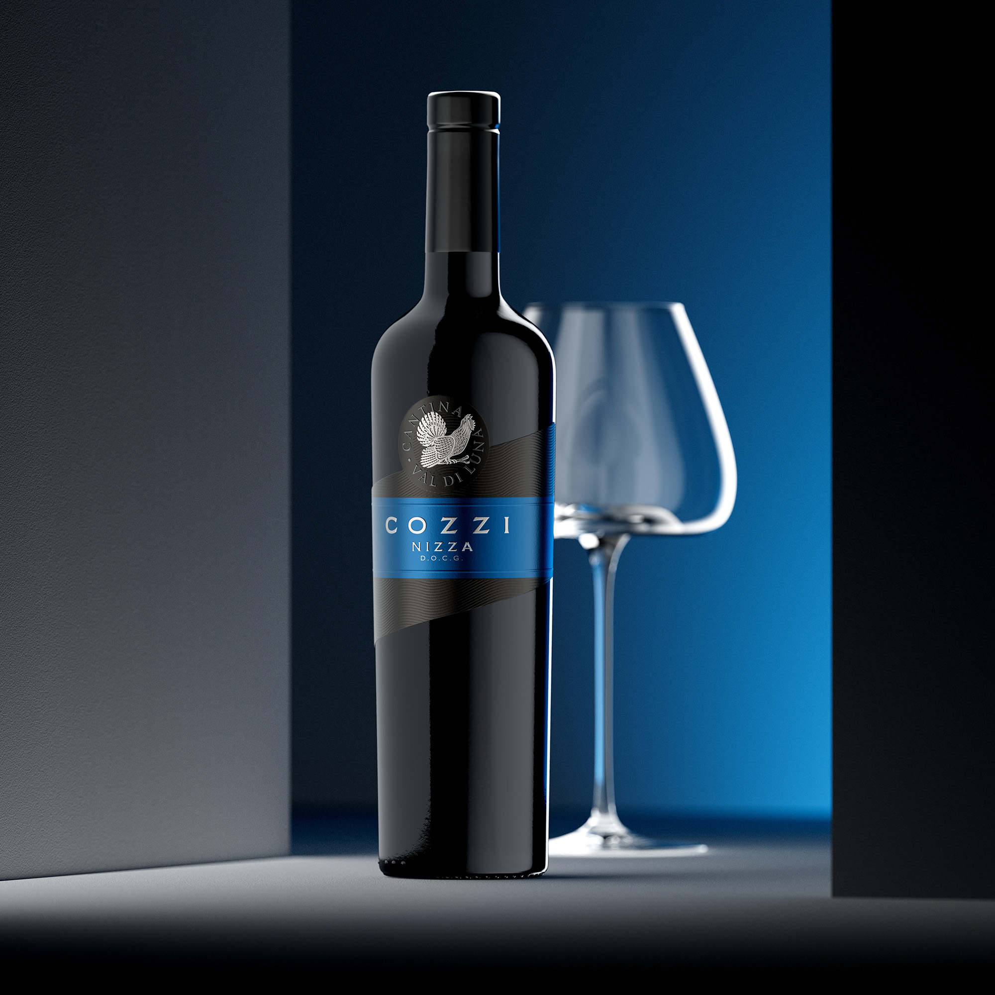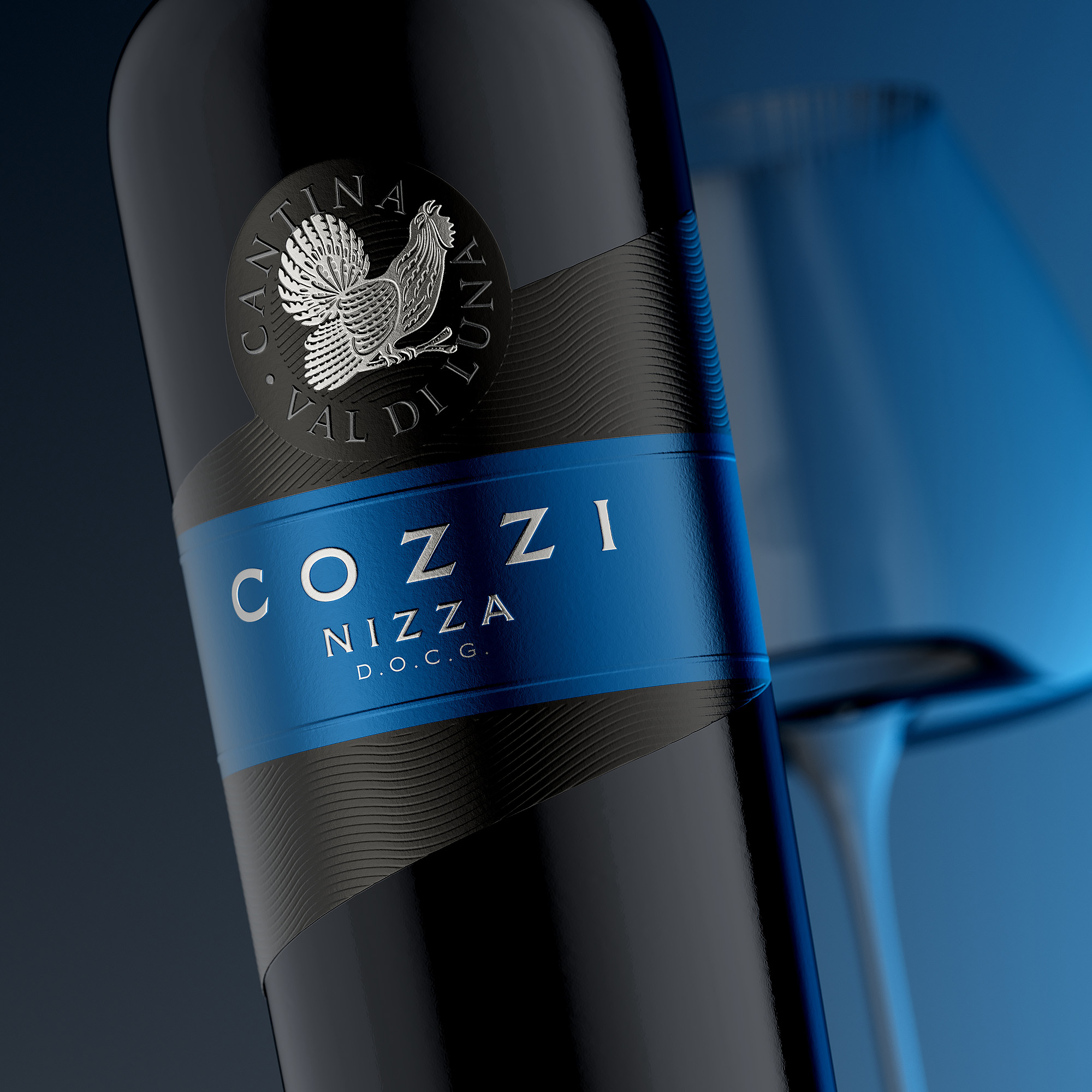 The Central Focus: Metallic Blue and Precision Typography on the COZZI Nizza DOCG Label