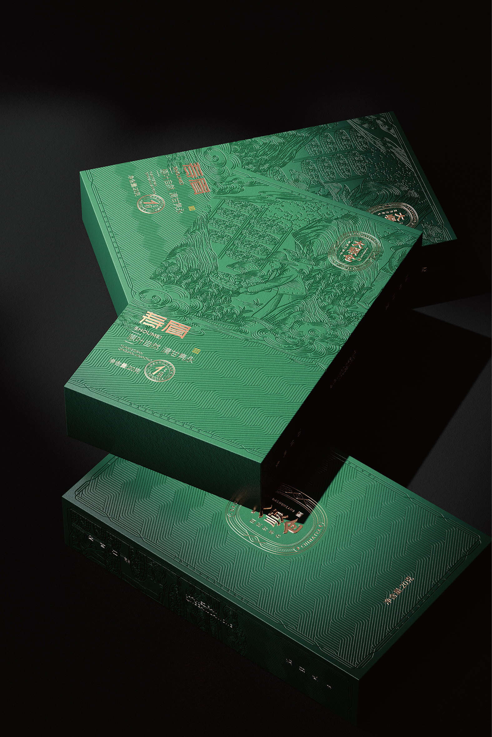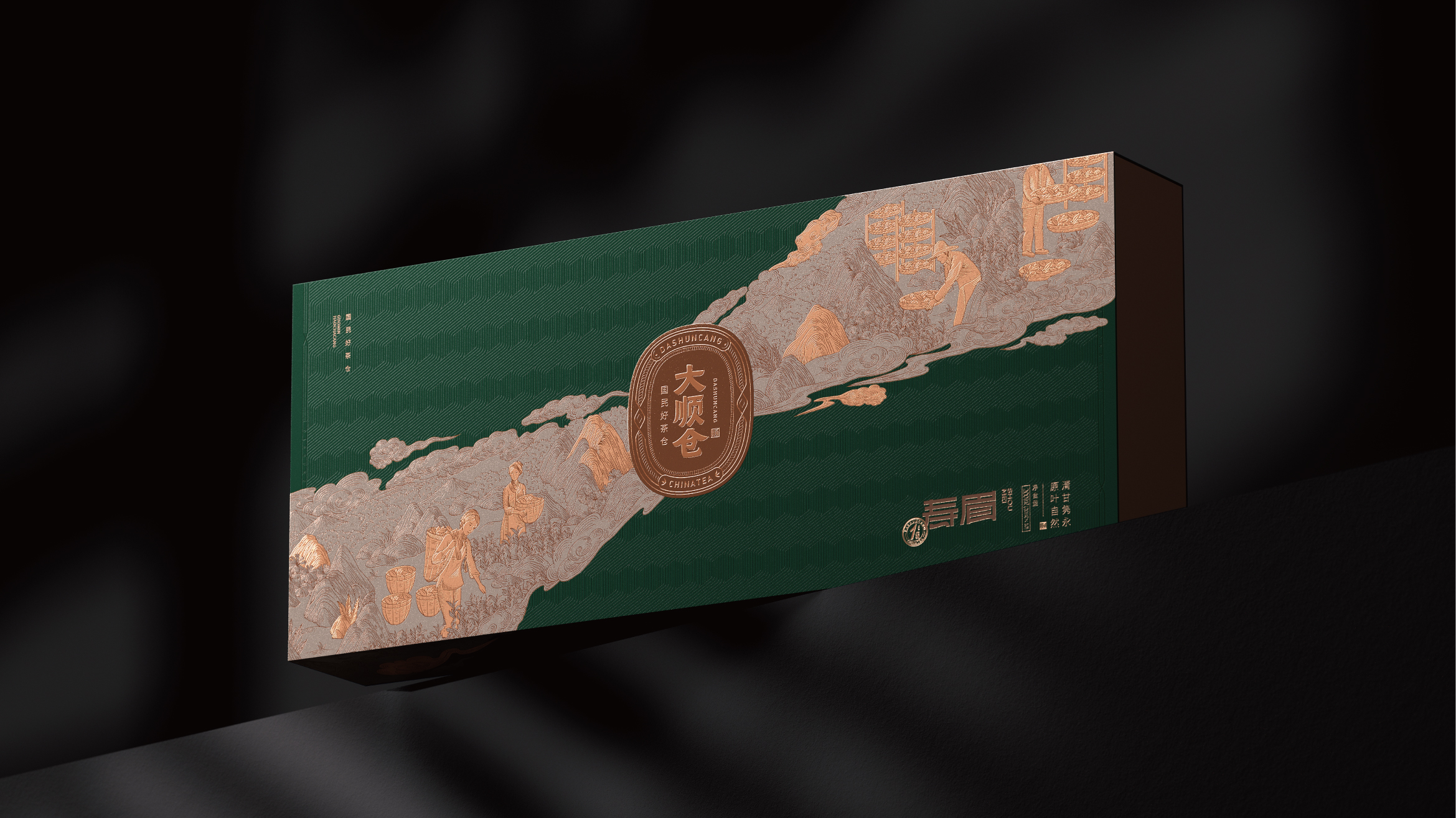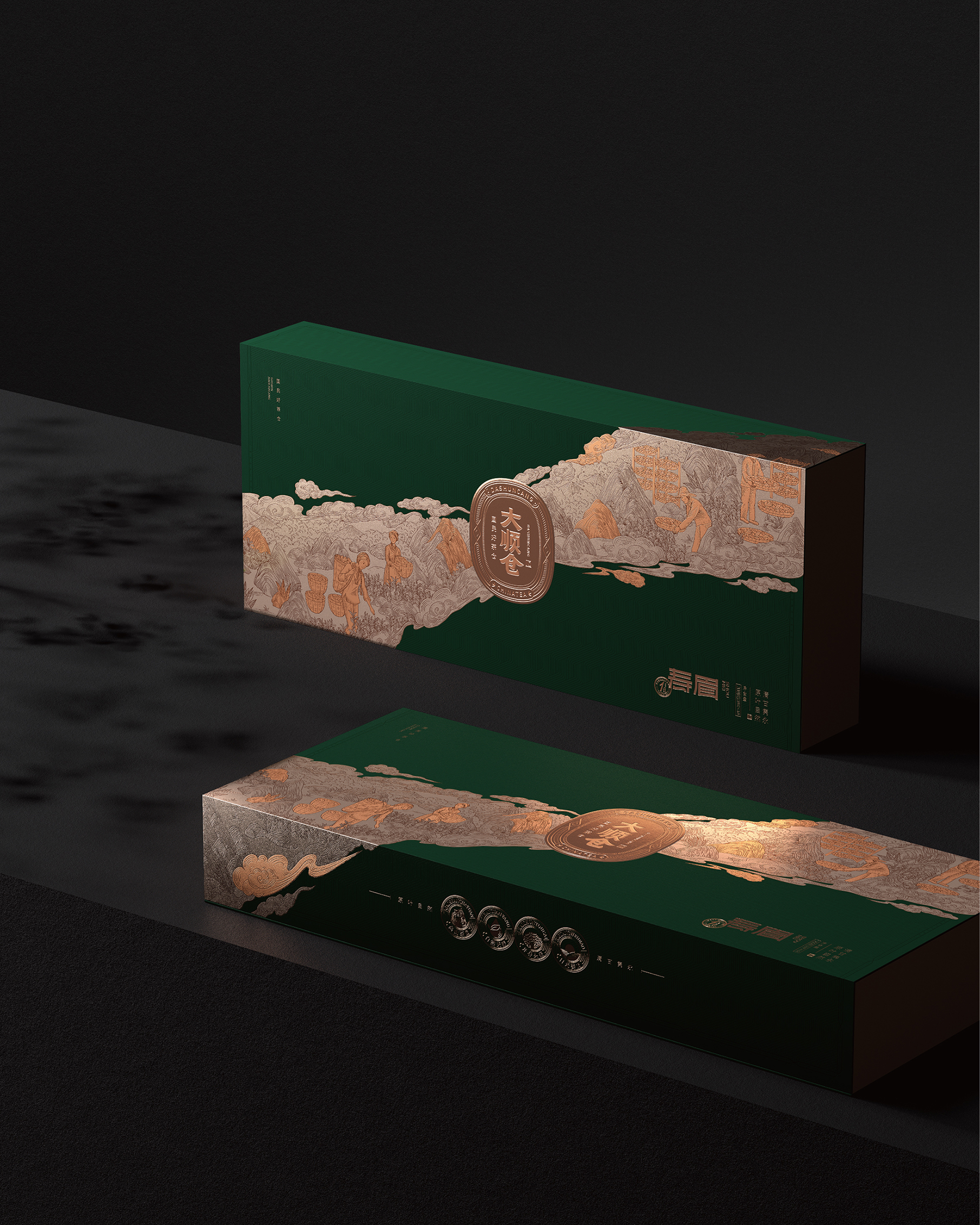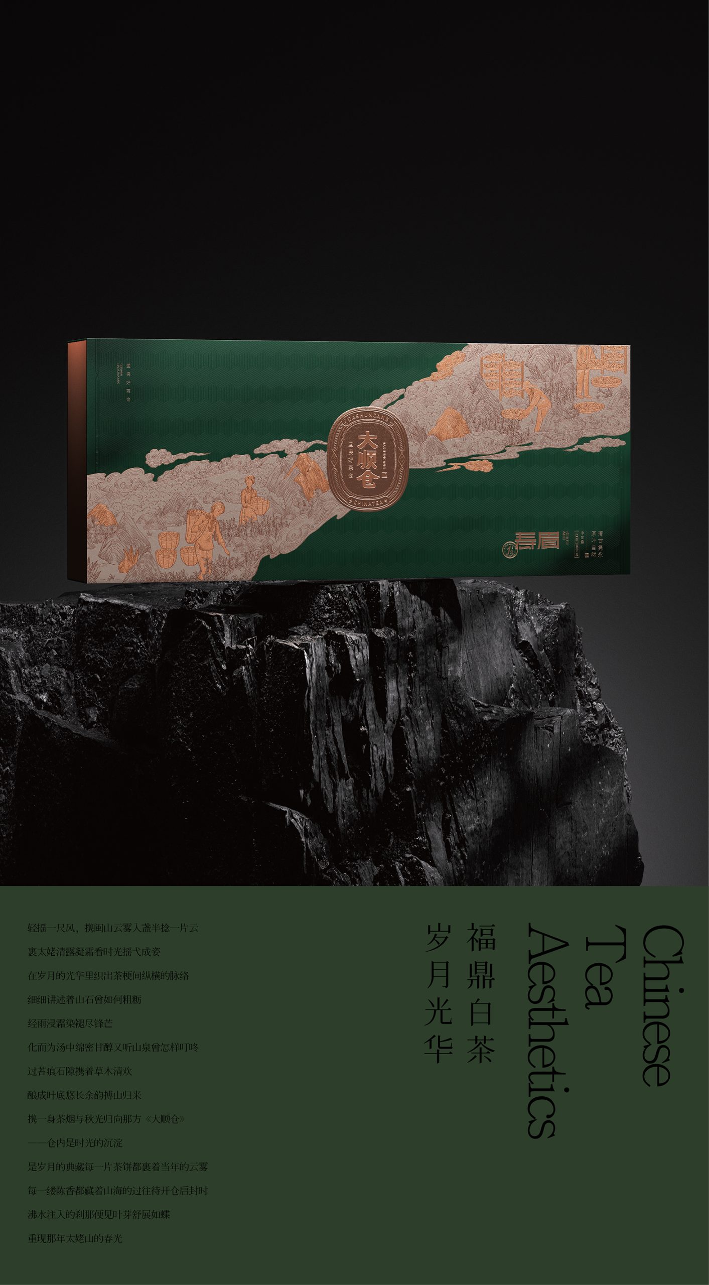 This exquisite packaging design for Dacshuncang x Guge blends traditional Chinese tea aesthetics with modern craftsmanship. Featuring embossed copper illustrations of tea pickers and flowing mountain landscapes on a deep emerald base, it evokes the serene beauty of Fuding’s tea culture. The meticulous details, textured patterns, and refined typography reflect the elegance of time-honored craftsmanship—positioning the brand as a guardian of heritage and sophistication in contemporary tea culture.