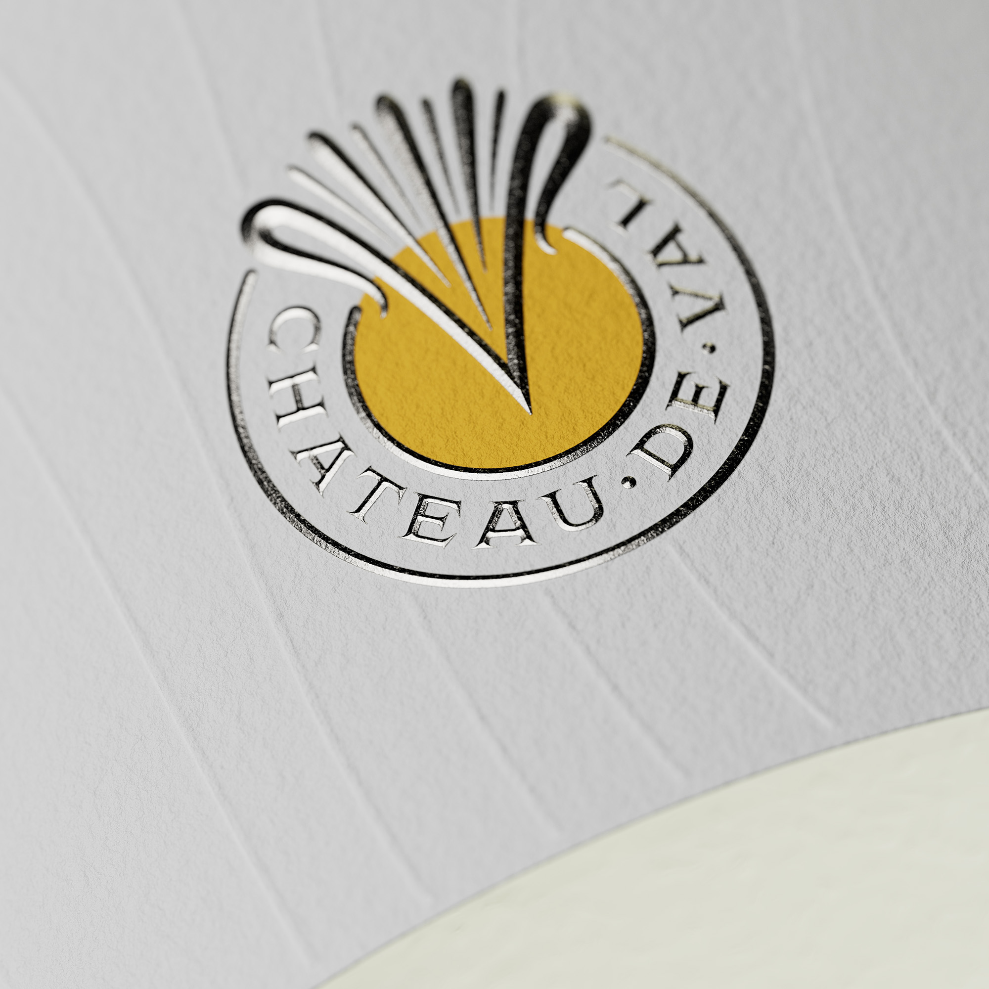 The emblem of Château De Val sits at the base of the label — a circular V-shaped mark with a golden sunburst accent, symbolizing warmth, optimism, and craftsmanship.