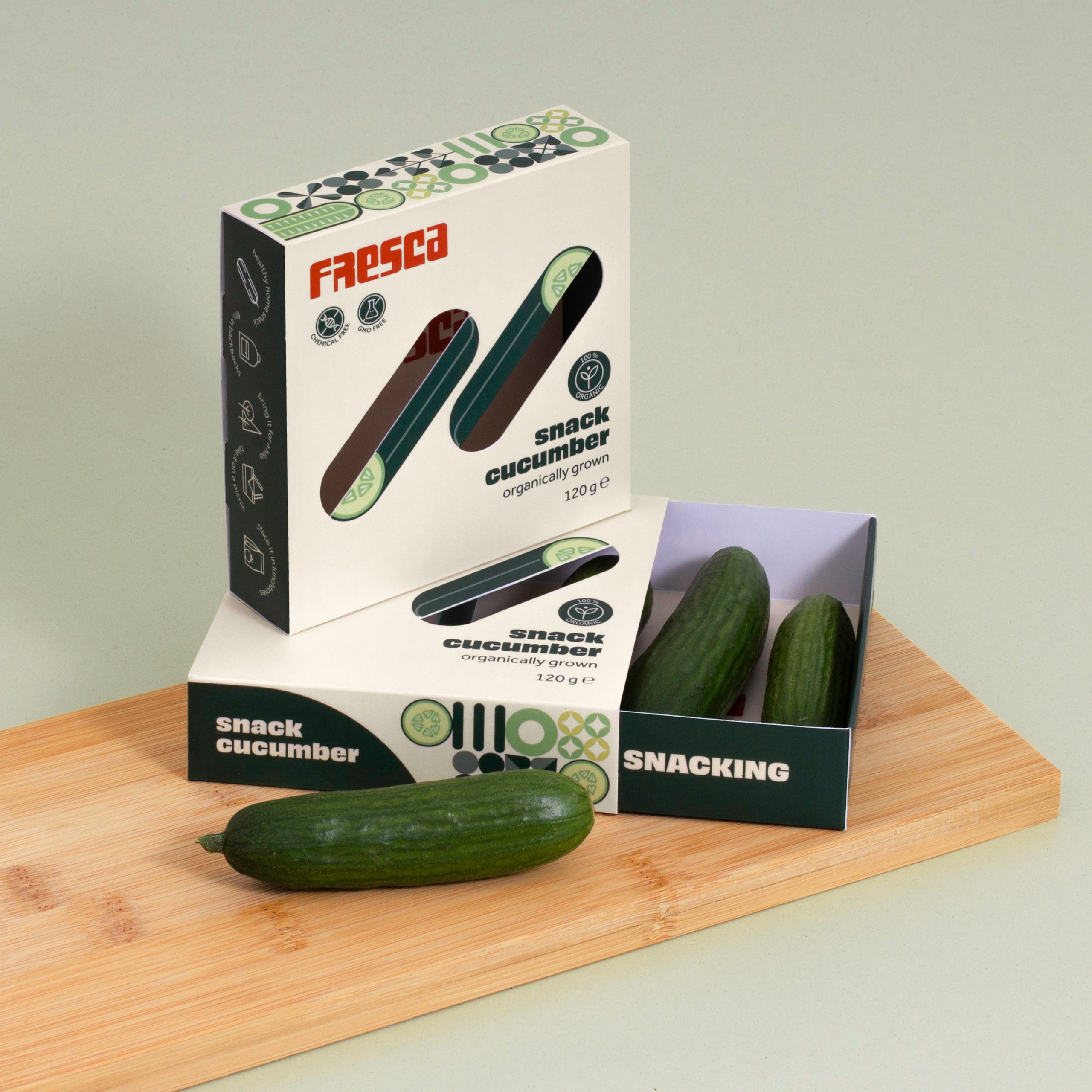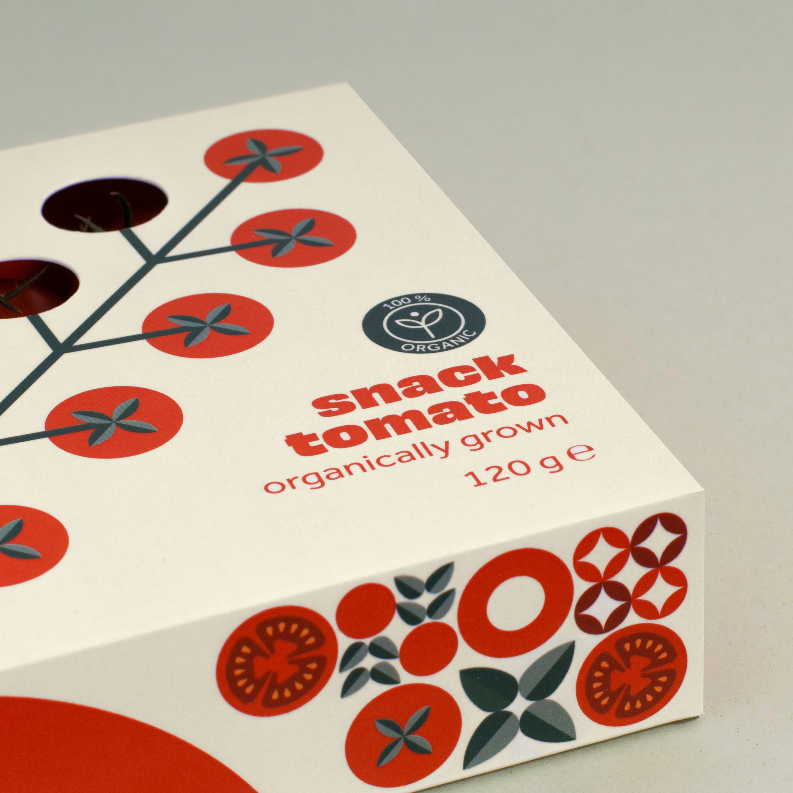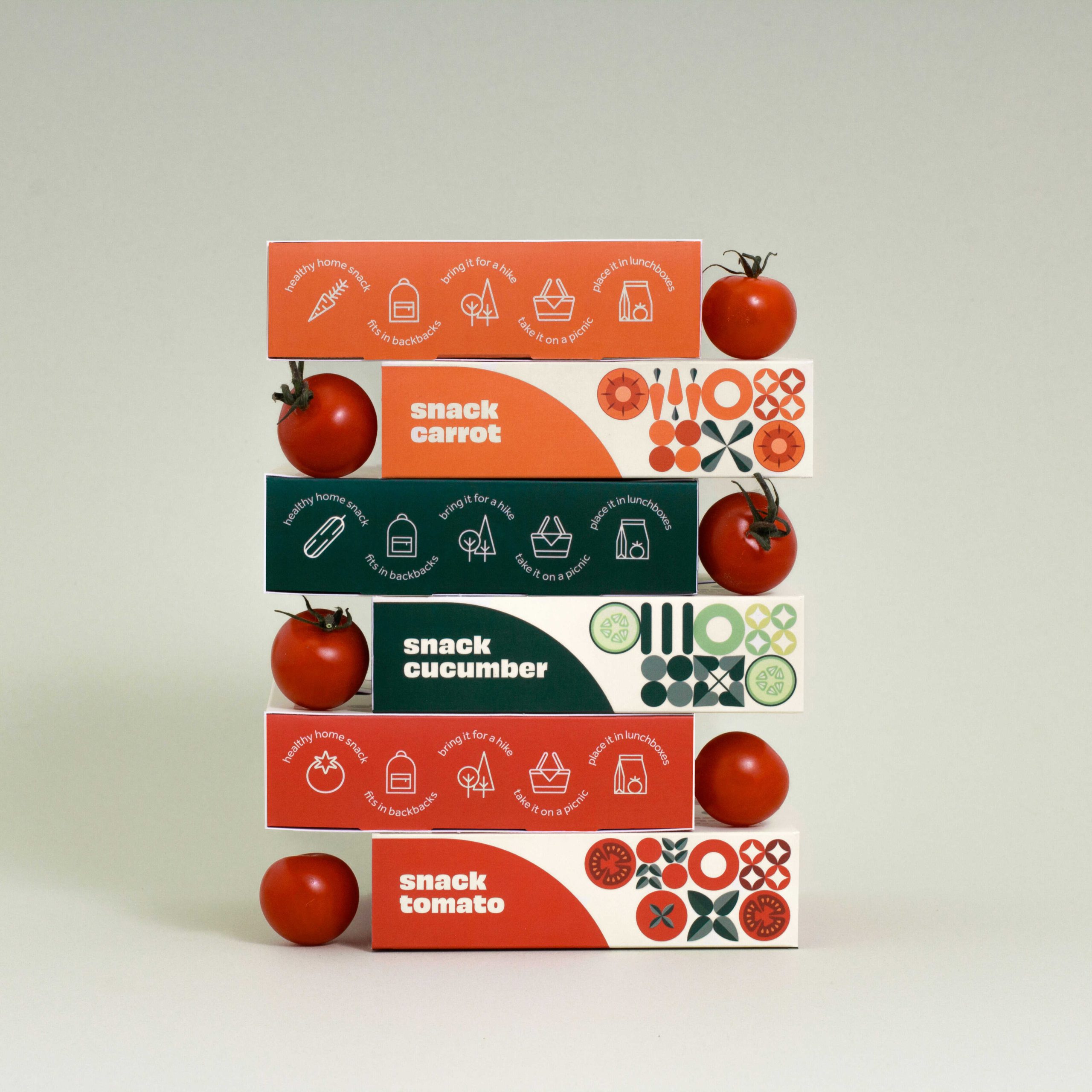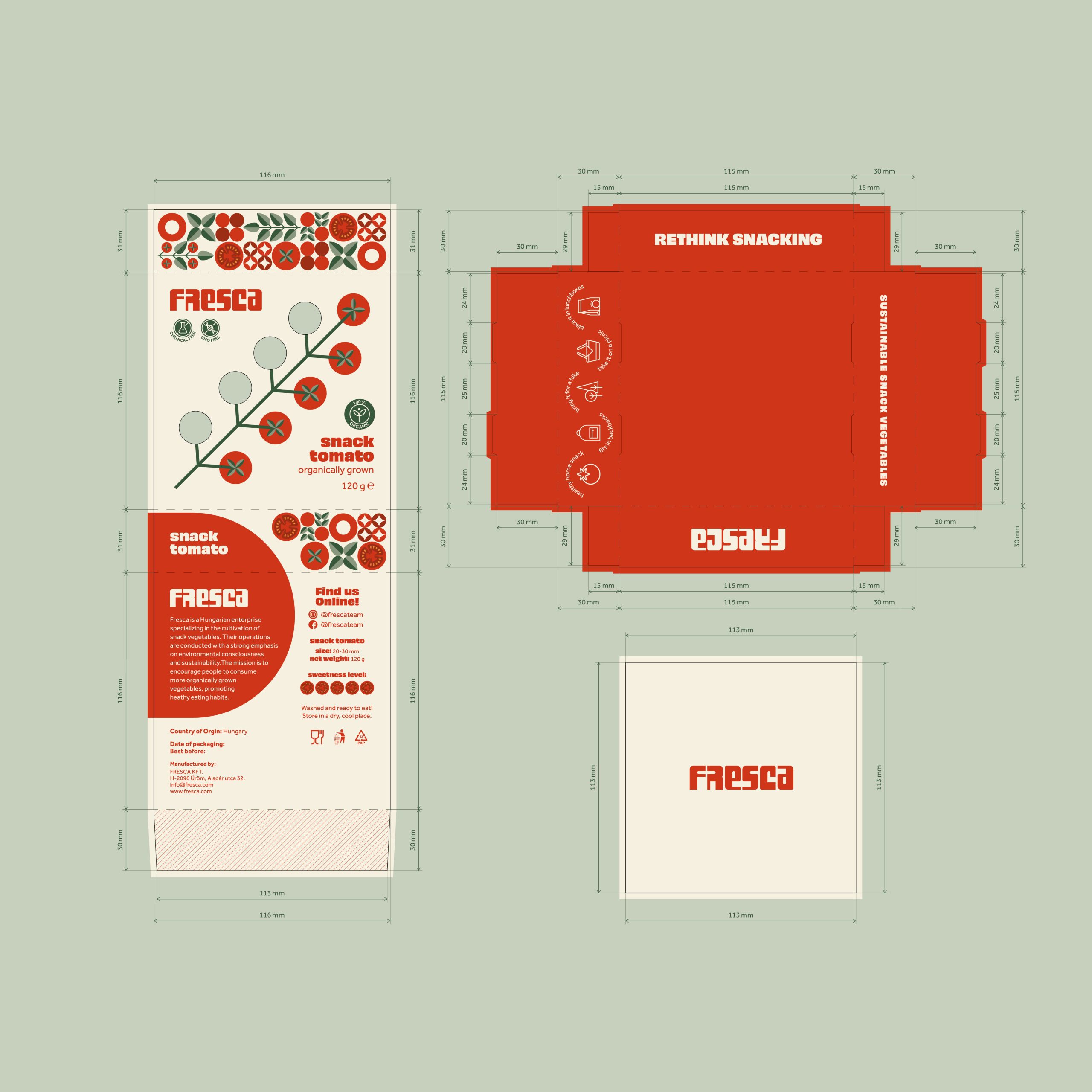 The packaging consists of three main components: an inner container for the vegetables, a stabilizing insert, and an outer protective sleeve. The structure is practical, the inner box can be easily pulled out, and when closed, it takes up minimal space. To ensure ventilation and visibility of the vegetables, cut-out windows have been integrated into the front-side illustrations. Prominently featured on the packaging are the organic certification label and pictograms symbolizing naturalness. The brand’s distinctive mosaic-style illustrations appear on the sides of the box, while additional pictograms offer suggestions for how the vegetables can be used. On the back, alongside the required nutritional and food industry information, a brief brand story and social media links are also included.