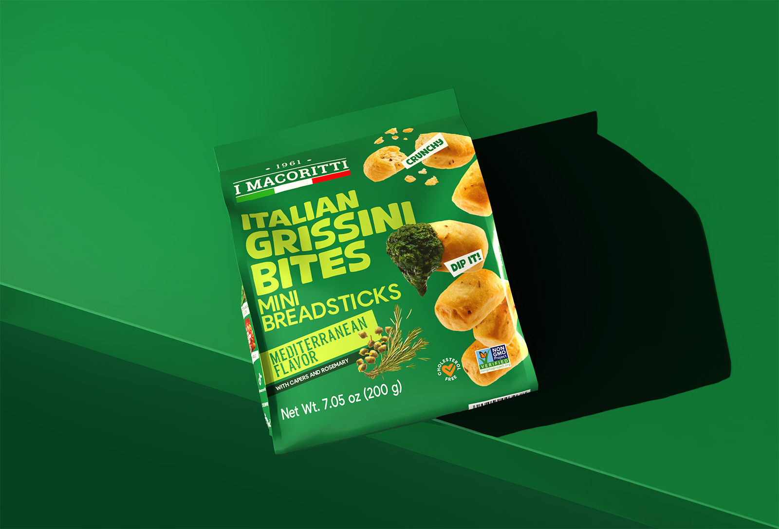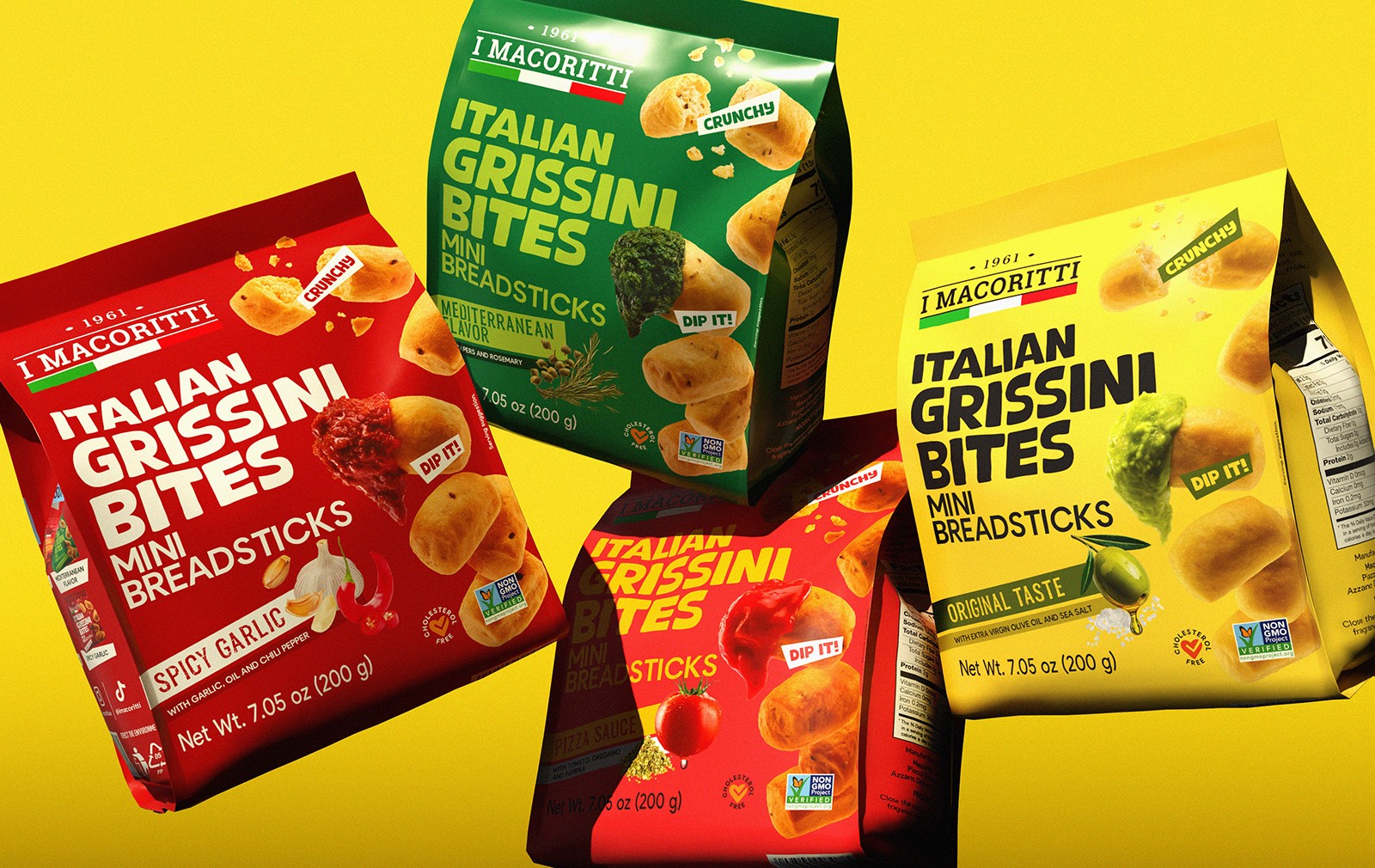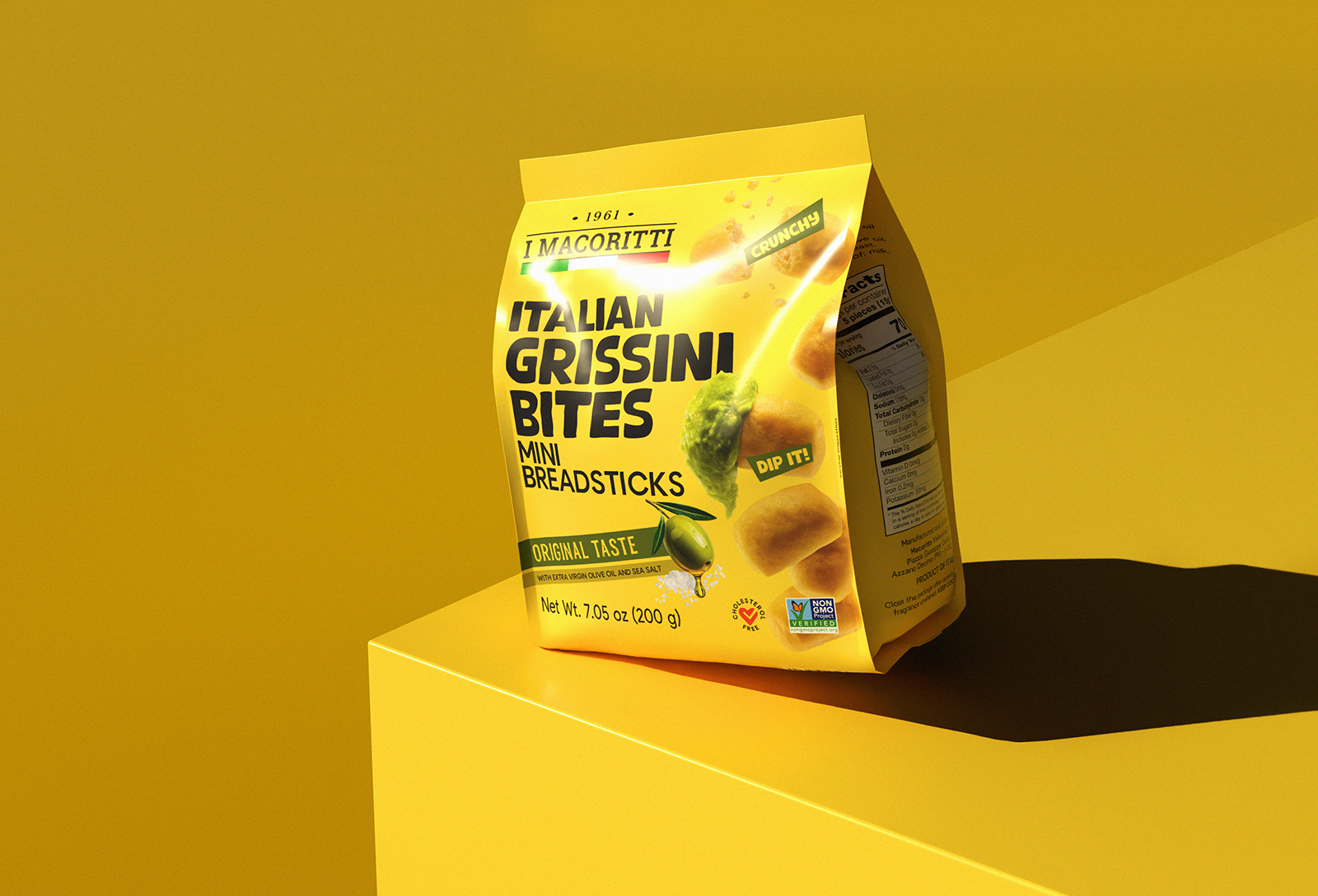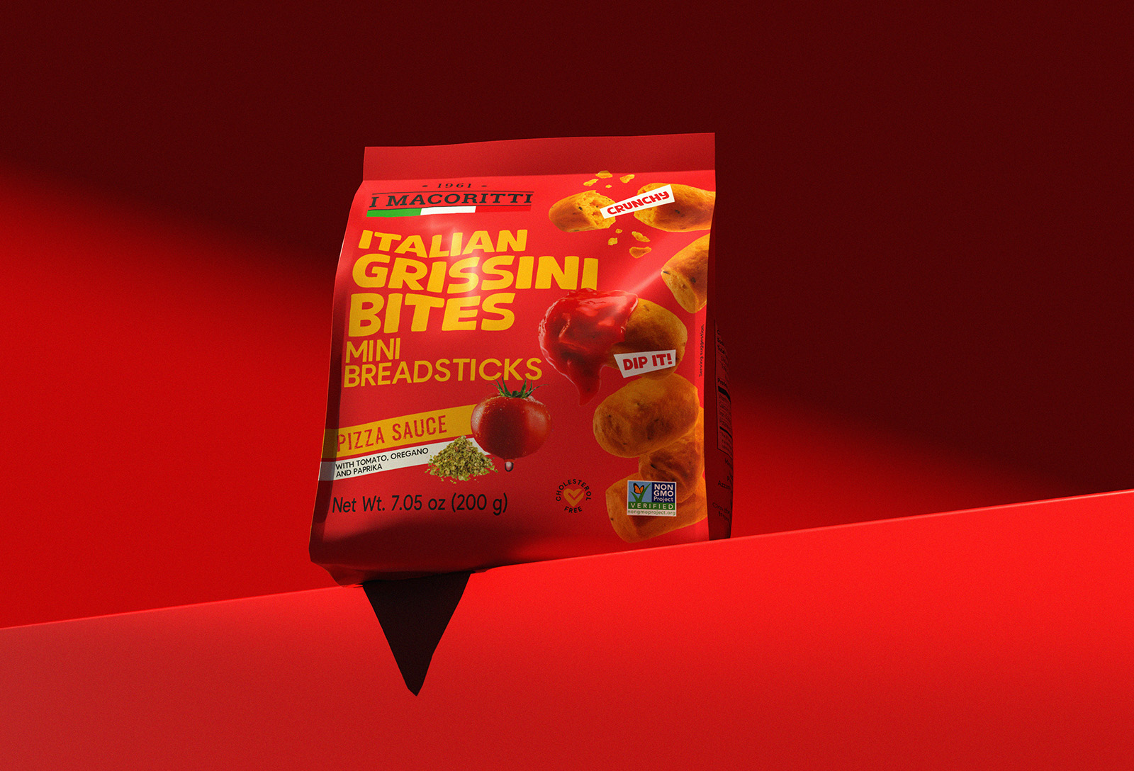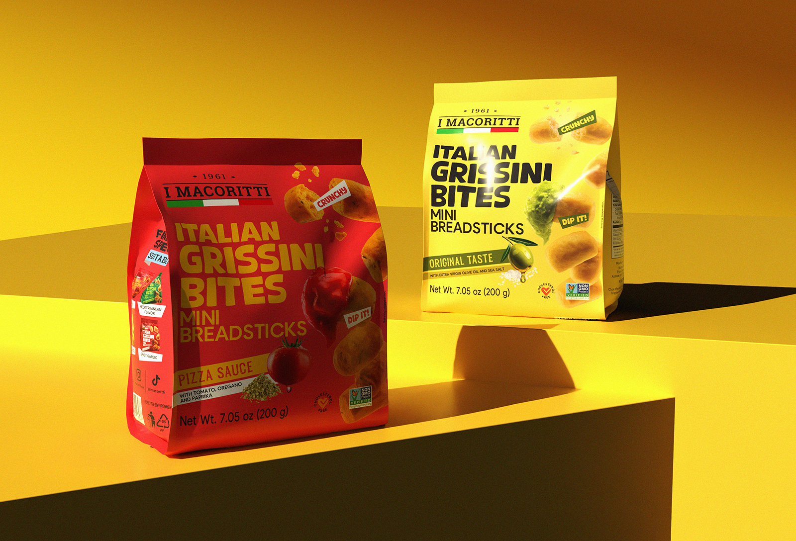 Macoritti mini grissini are a flagship product of Macoritto Valentino, beloved for their crunchiness, lightness, and playful character. For the US market, we were tasked with designing a packaging system that could translate the authenticity and joy of these Italian grissini into a visual language that resonates with American consumers. The goal was to create a line that stands out on crowded supermarket shelves while communicating the product’s Italian heritage, quality, and fun personality… all in a single glance.
