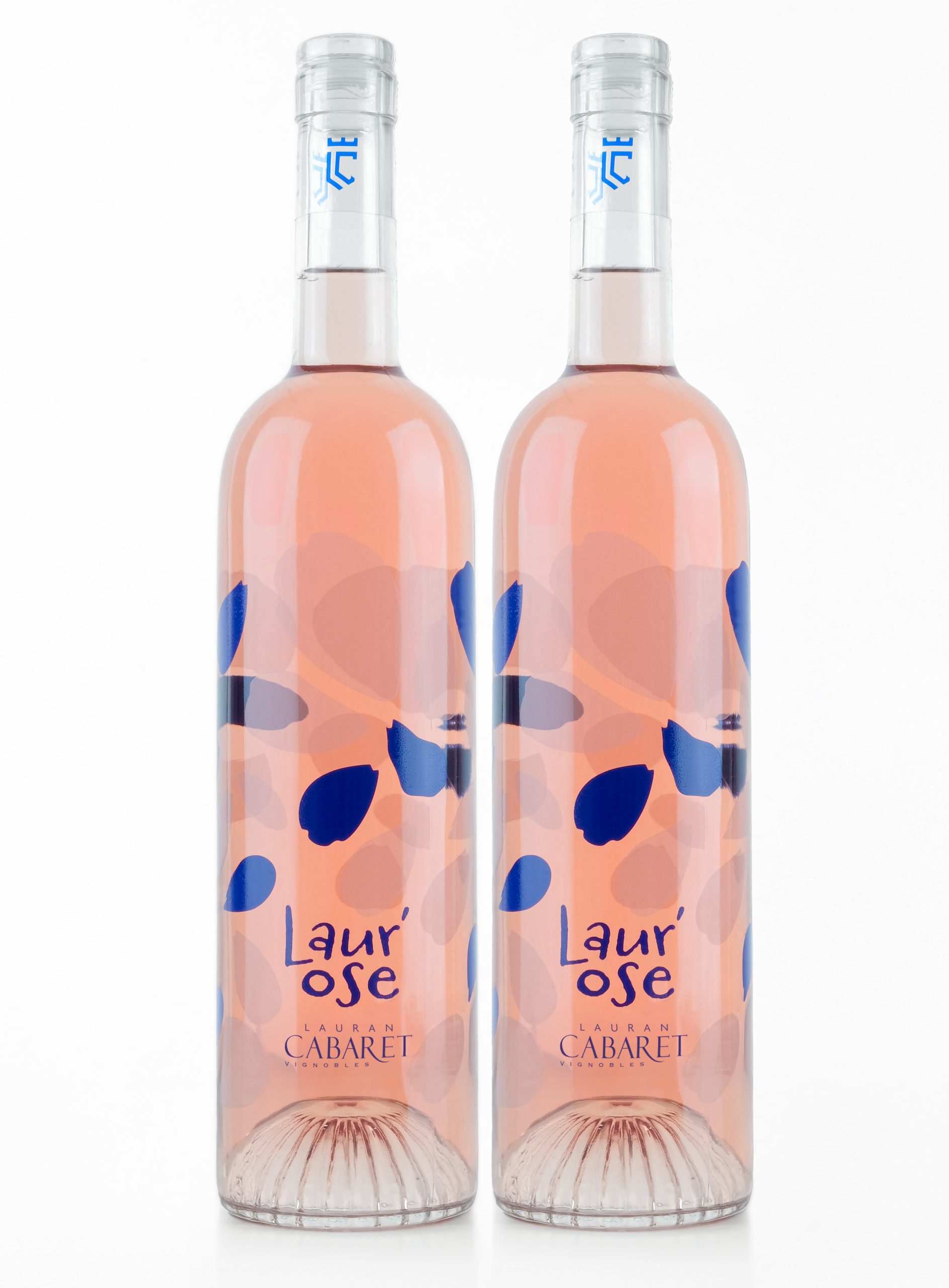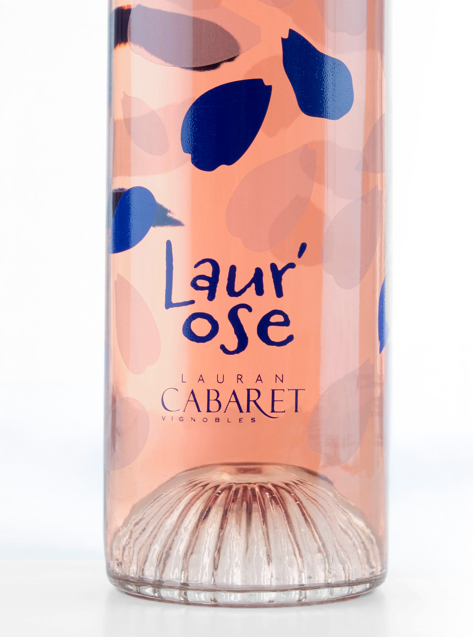 Un rosé tout en transparence où le bleu profond dialogue avec avec l’effet dépoli de certains pétales. Laur’Ose déploie son décor sur la jolie bouteille Rosemarie de chez Berlin Packaging France.