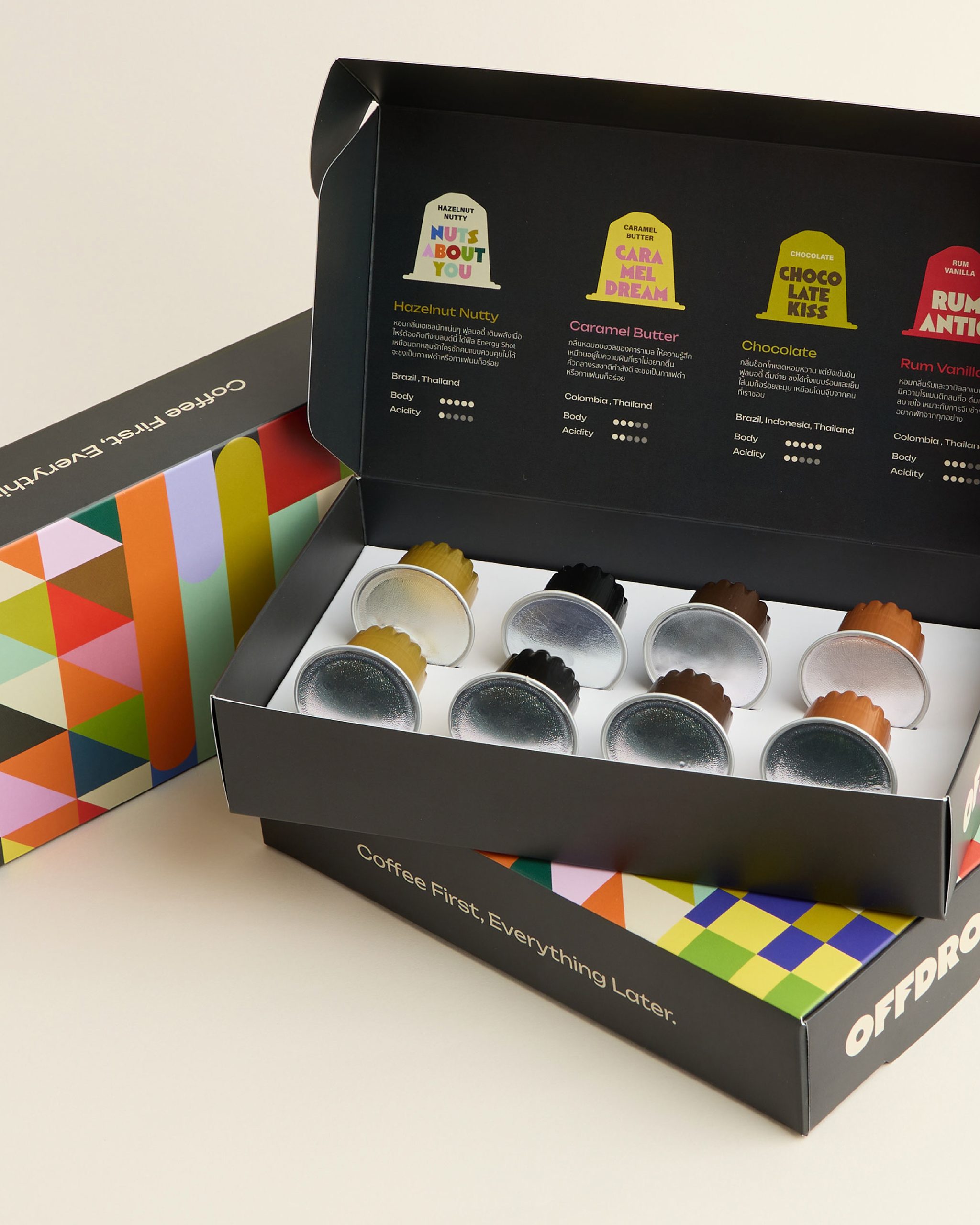 Each box carries its own unique identity while staying cohesive as a collection, designed to be both visually striking and practical for home or office use. Inside, nitrogen-sealed capsules ensure lasting freshness, reflecting Offdrome’s balance of creativity and quality.
