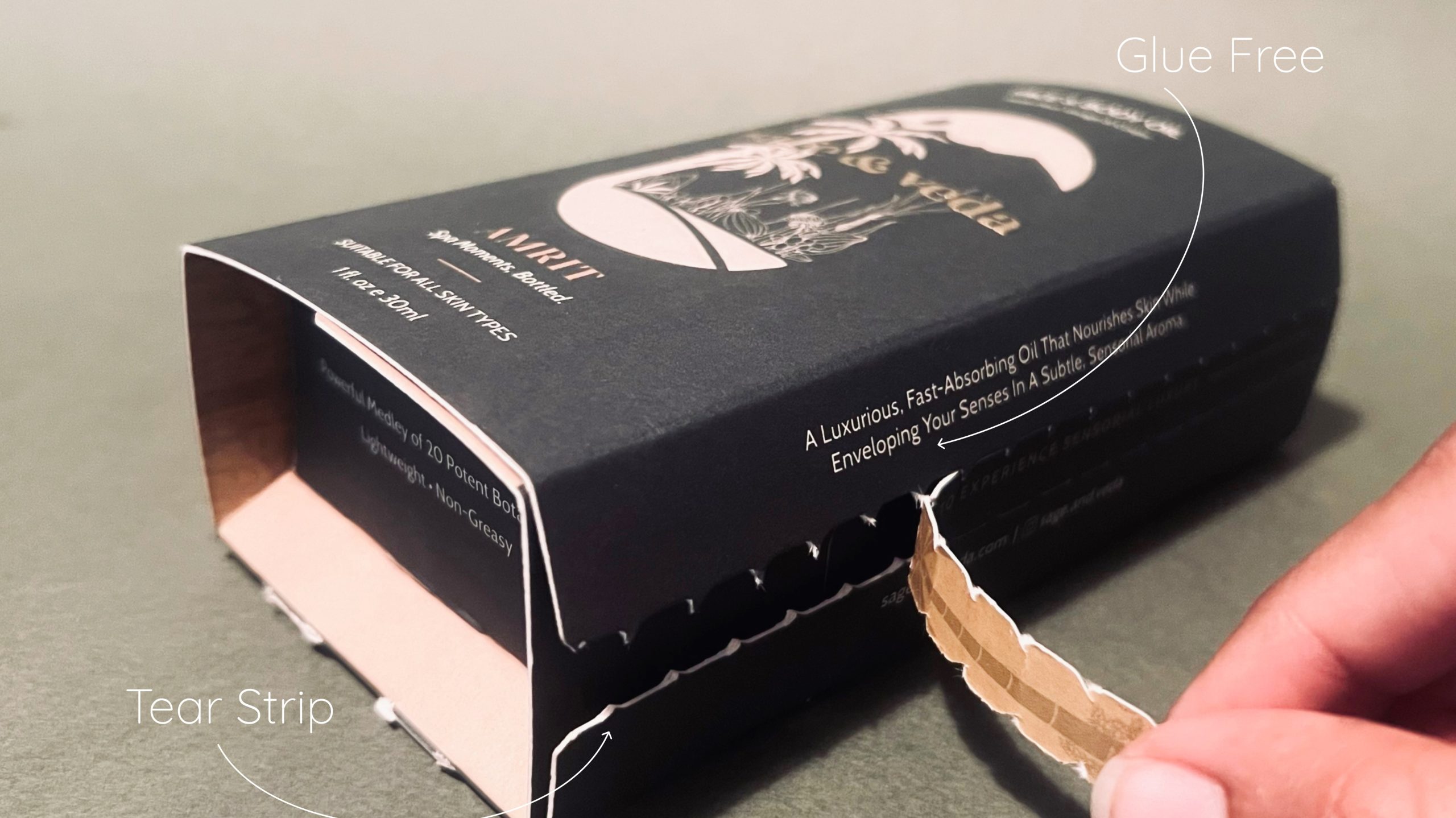 Instead of cello tape, a clean perforation strip seals the box. It’s intuitive, elegant, and ensures the product arrives untouched and pristine.