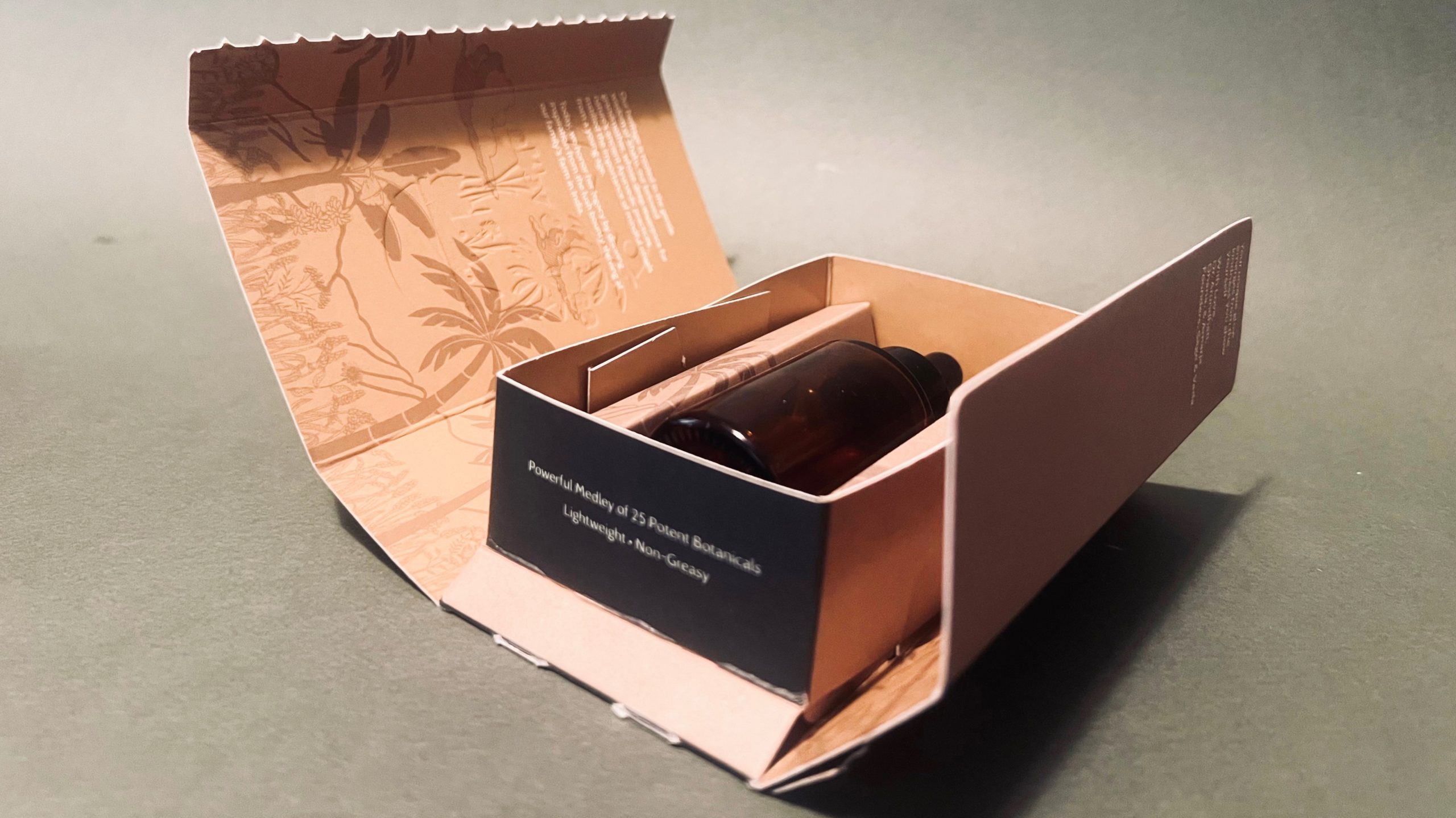The packaging unfolds like a book, inviting the customer into the brand’s narrative. No tugging, no tearing—just a graceful reveal. Inside, the glass bottle in a custom tray, cradled securely yet presented.