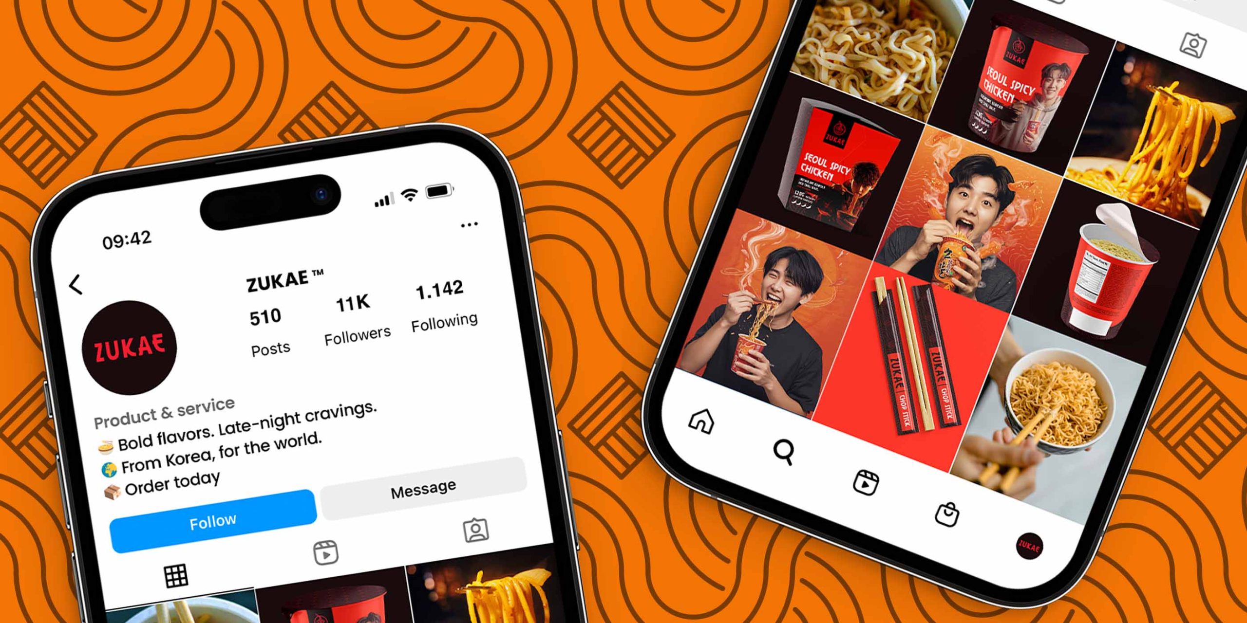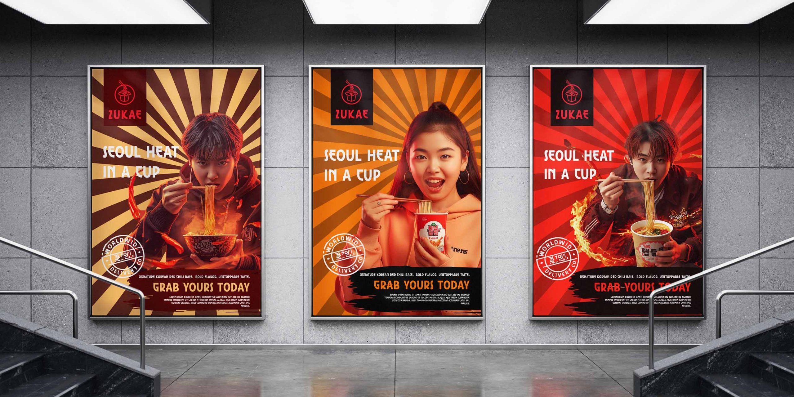 The minimal structure and bold color usage were chosen to stand out on both digital platforms and physical shelves, positioning ZUKAE as a lifestyle-driven noodle brand rather than just a quick snack.