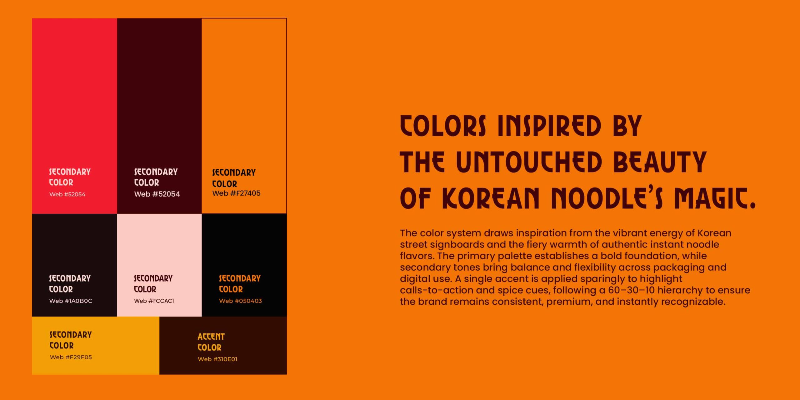A warm, spicy color palette mirrors the neon-lit energy of Seoul’s food alleys while creating immediate appetite appeal. These colors are balanced by clean negative space, allowing the packaging to feel both bold and premium.