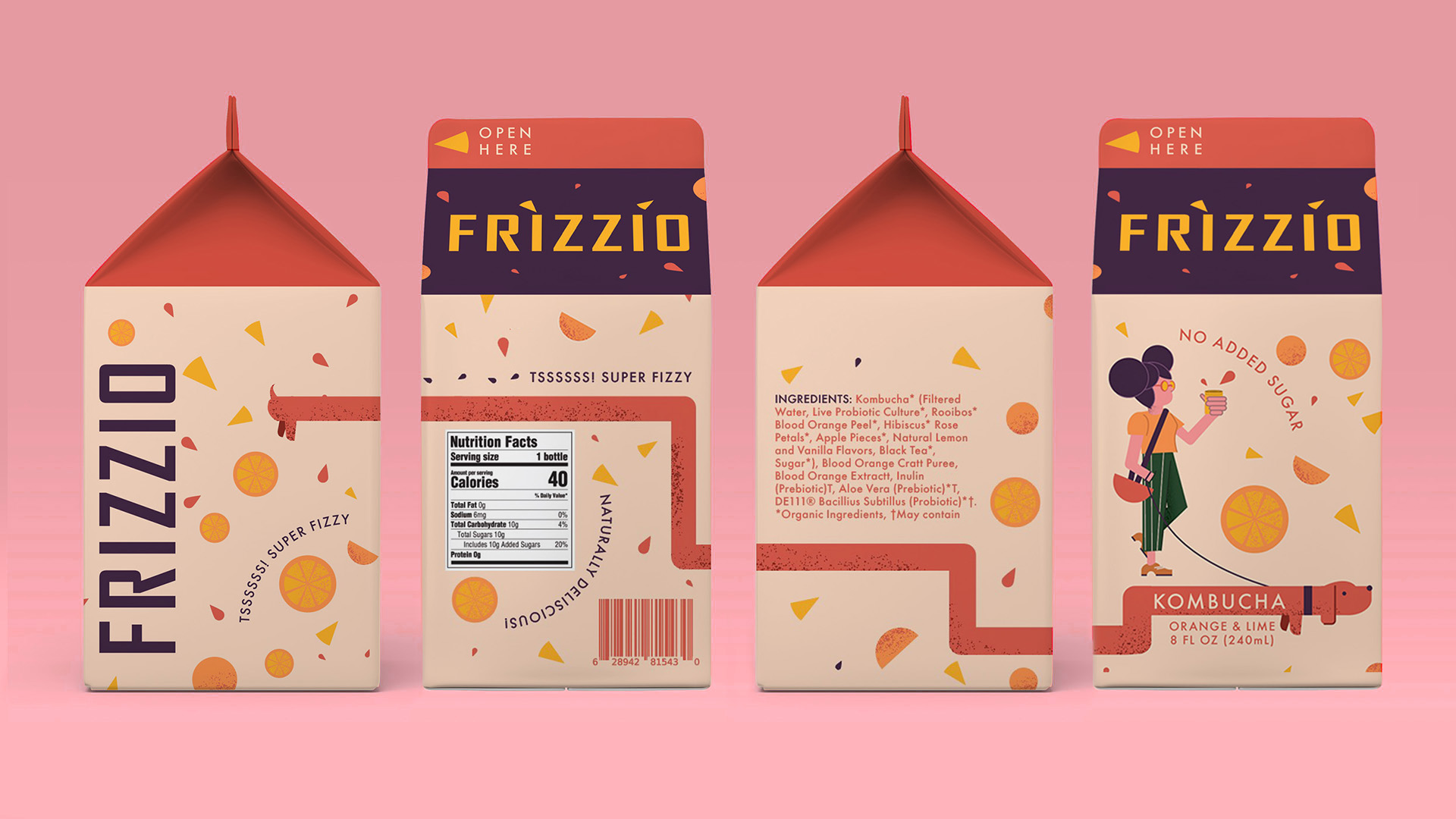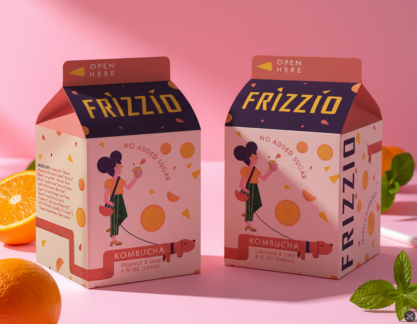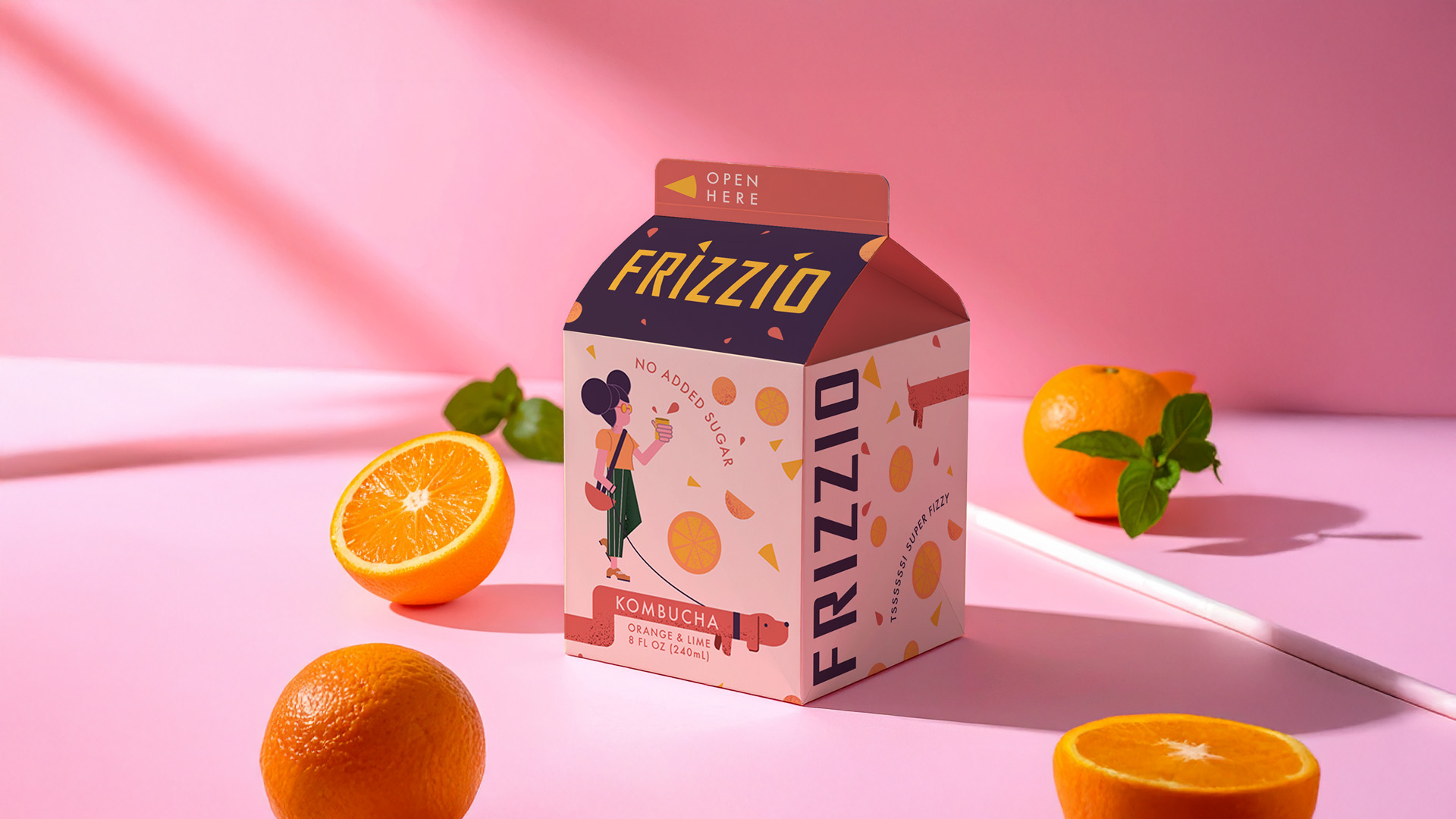 Frizzio is a kombucha that reinterprets the nostalgic world of vintage juice cartons — packaged in recycled Tetra Pak and designed to feel straight out of another era, but with a bold, Gen Z twist.