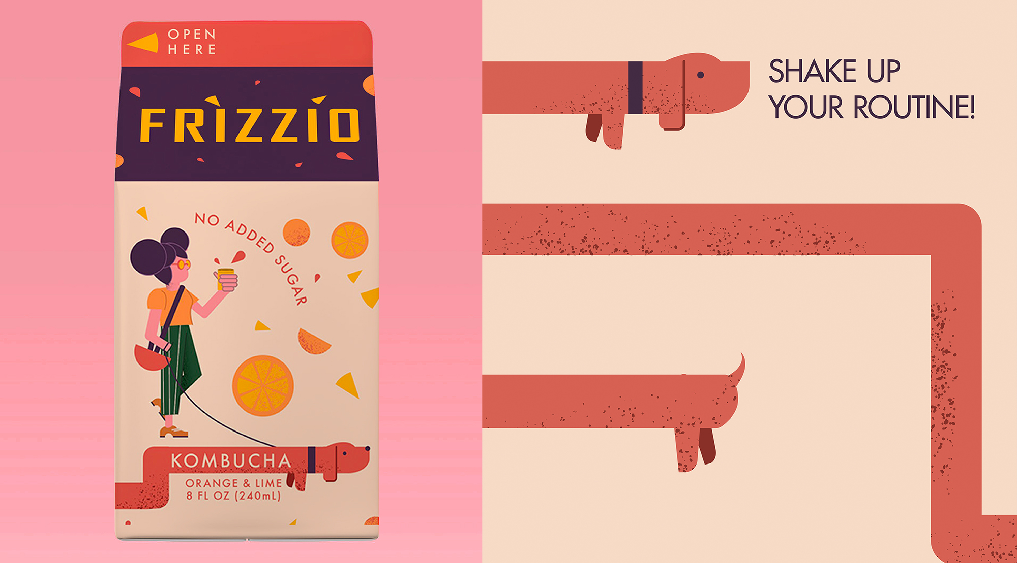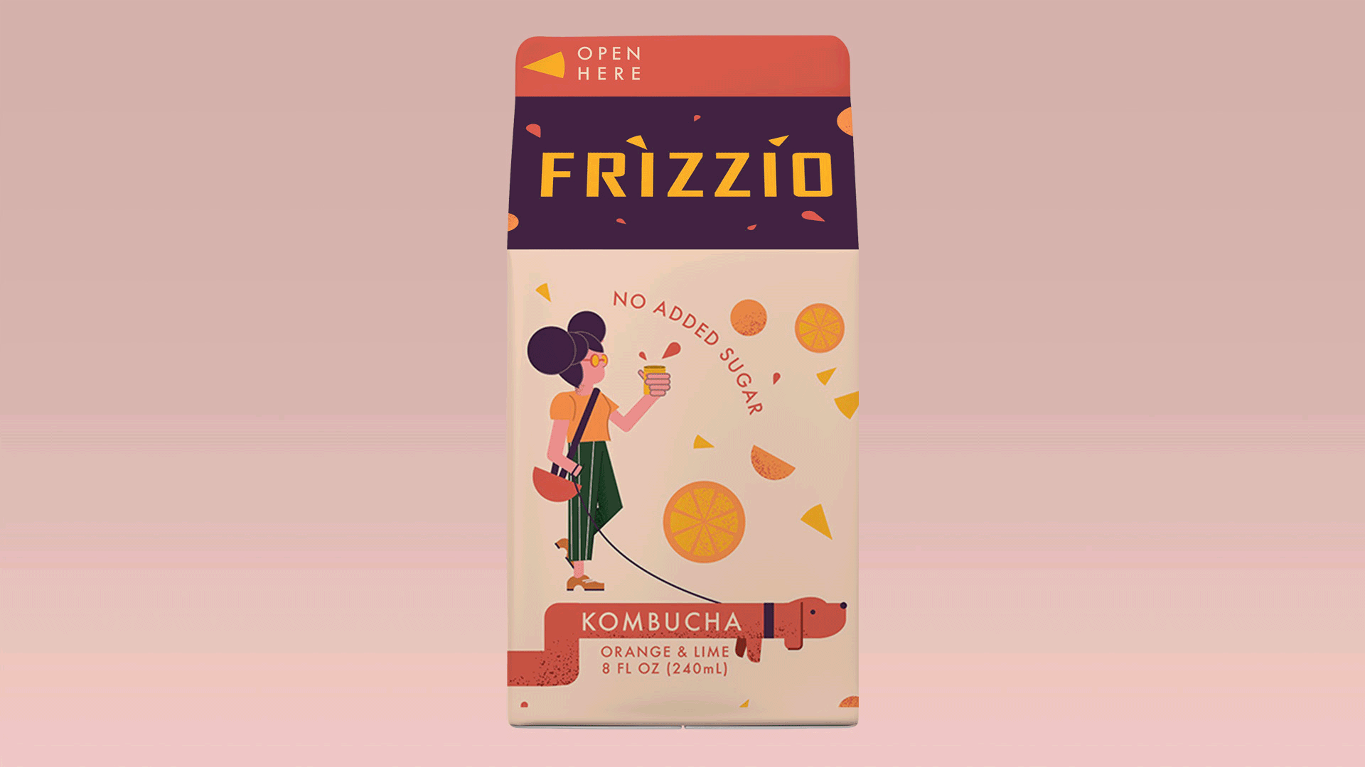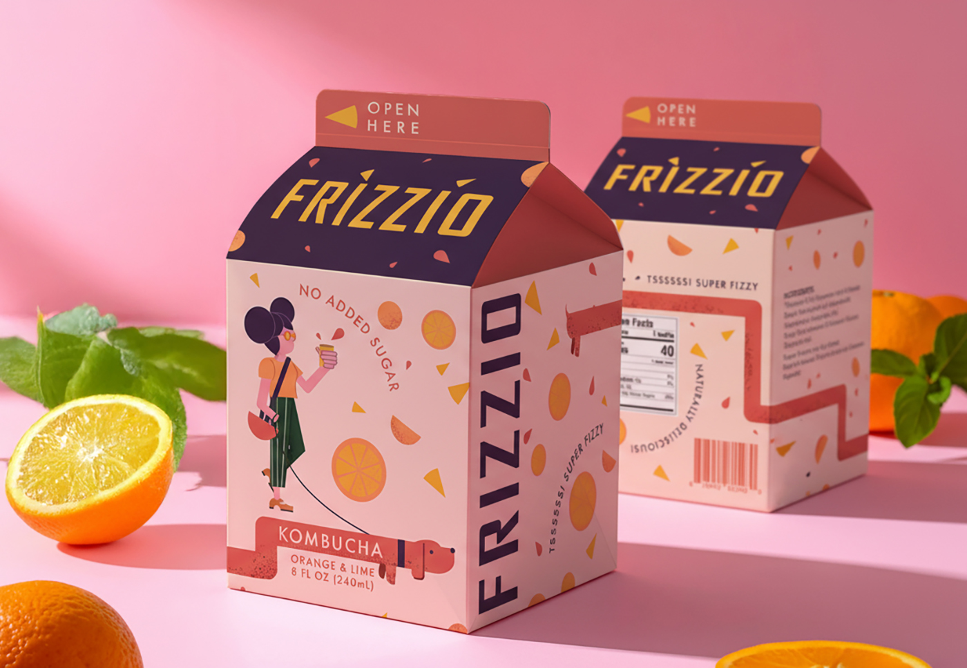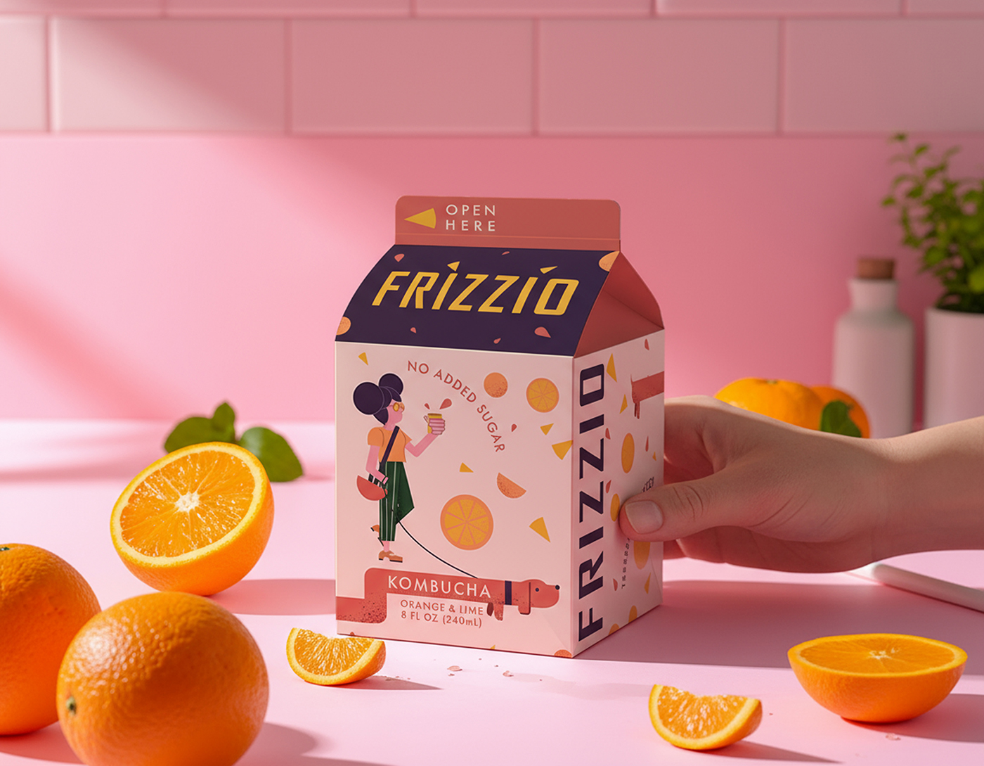 Frizzio is a kombucha that reinterprets the nostalgic world of vintage juice cartons — packaged in recycled Tetra Pak and designed to feel straight out of another era, but with a bold, Gen Z twist.