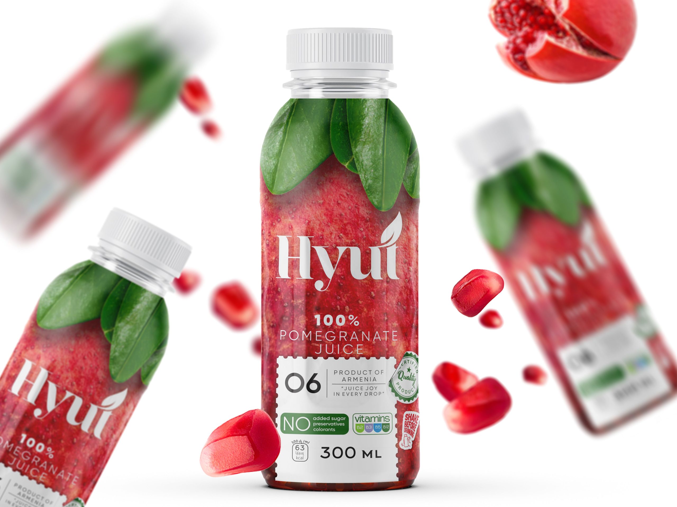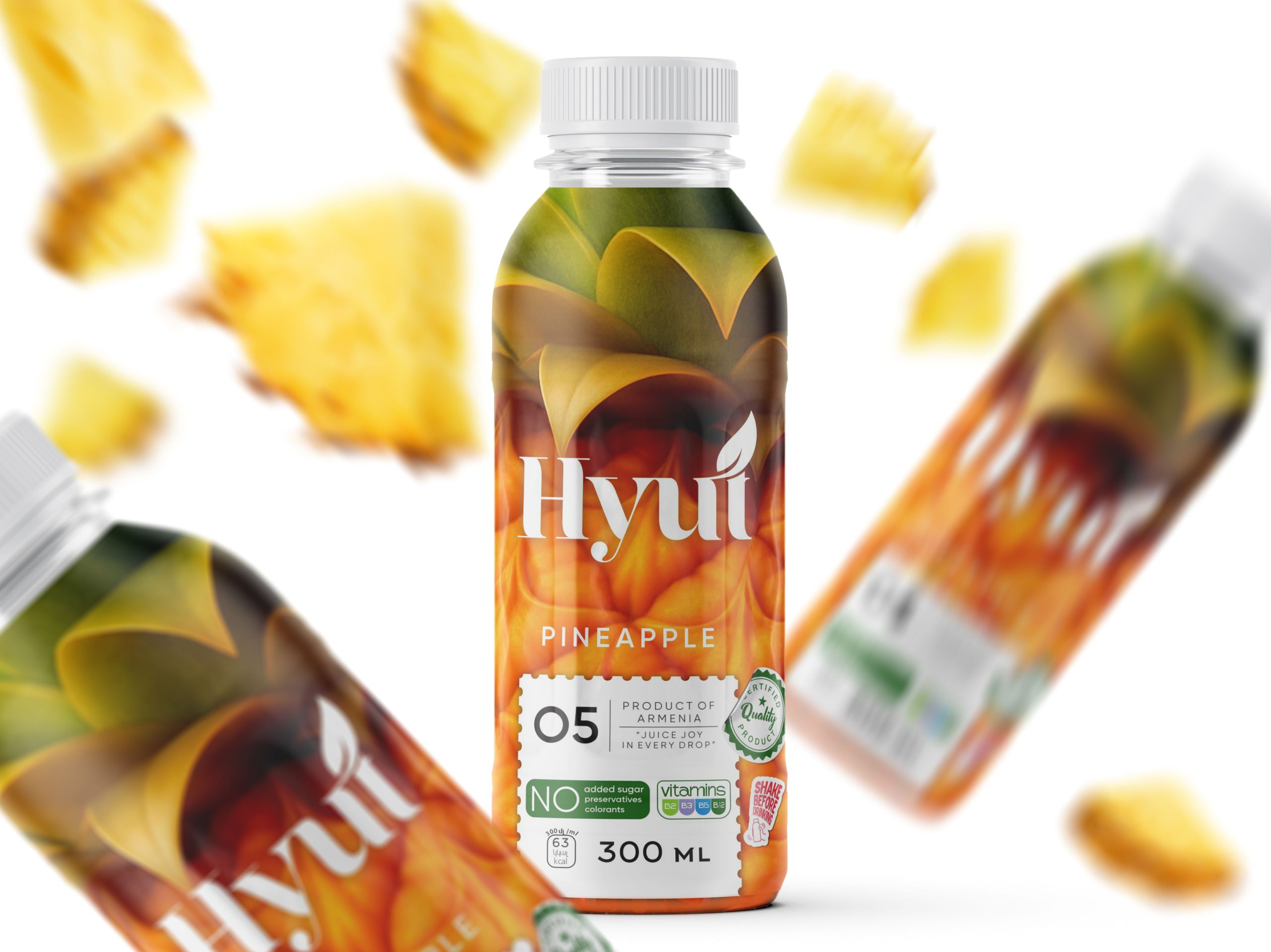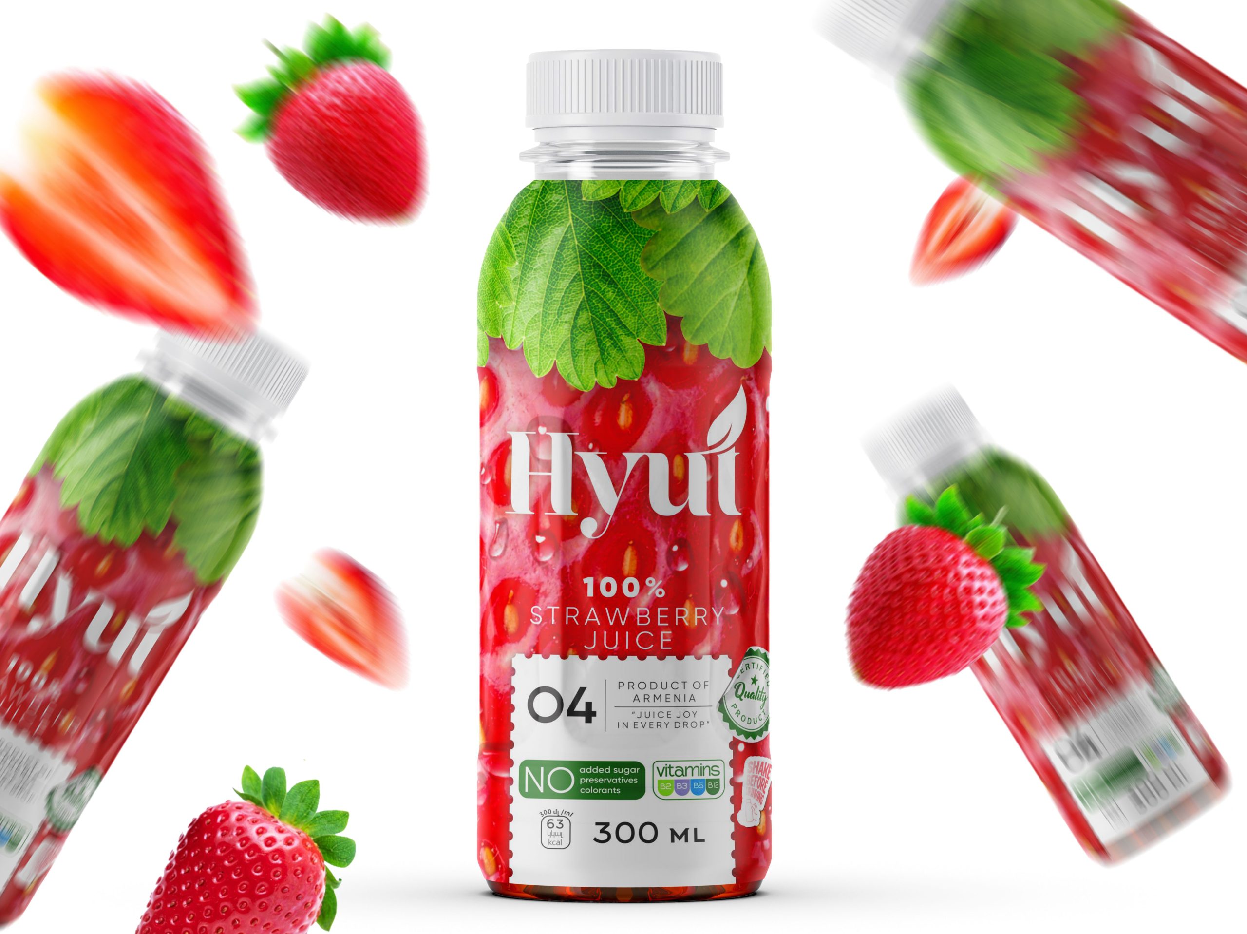 HYÚT, which means “juice” in Armenian, was born from a desire to present juice as a pure, genuine product. The design combines photorealistic fruit imagery, soft leaf accents, and a modern, airy composition, allowing the packaging to speak for itself. The white emblem and clean visual markers make the identity recognizable and honest: no added sugar, no unnecessary advertising, just real, beneficial taste. The packaging reflects the brand’s core values: simplicity, quality, and naturalness.