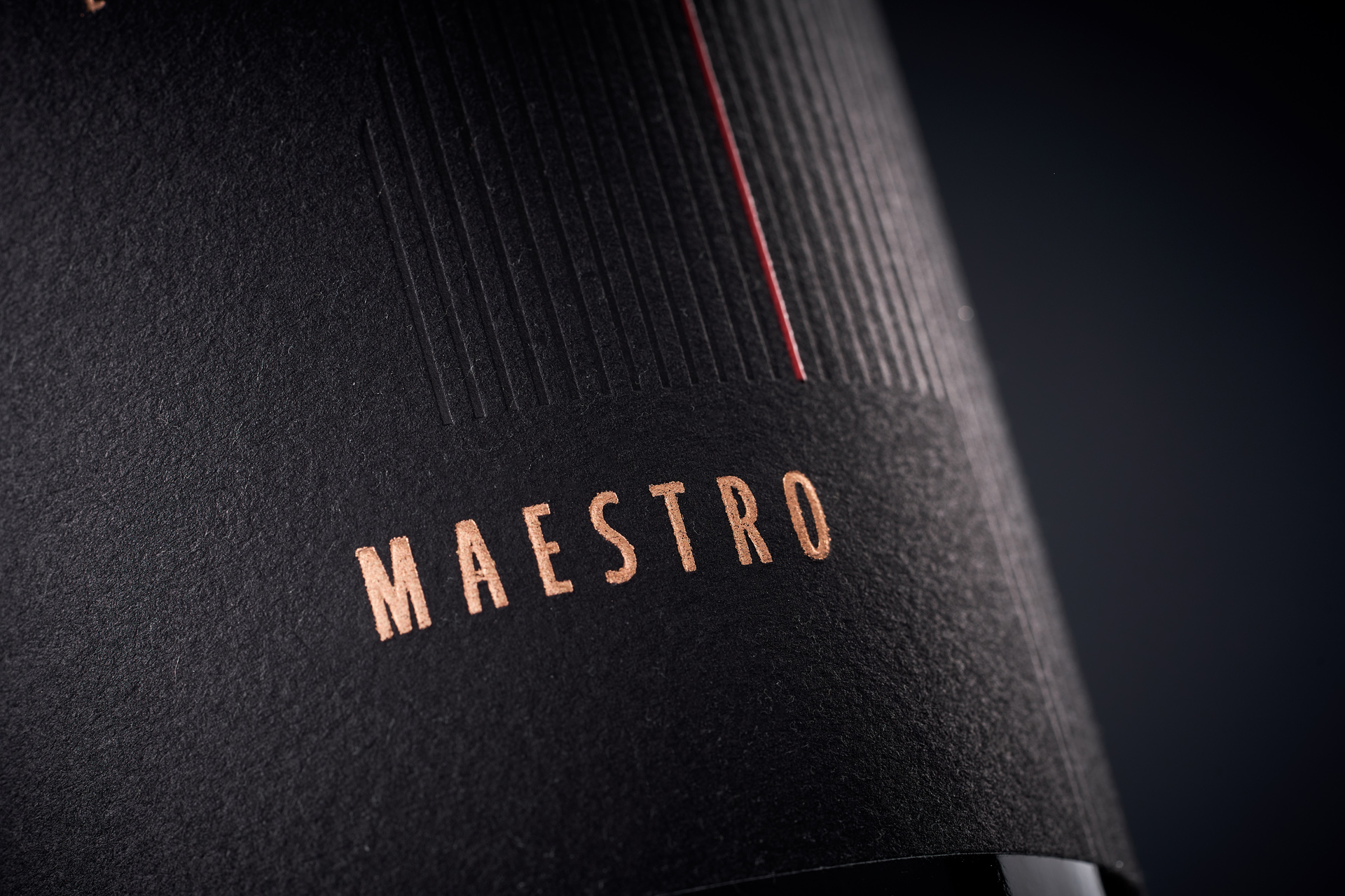 The label incorporates a deep matte surface enhanced with subtle vertical embossing, forming a tactile structure reminiscent of the cuvée’s internal architecture. A single red line adds direction and tension, guiding the composition while reinforcing the identity of the blend. The copper-toned emblem introduces a crafted, premium accent that reflects the small-batch nature of the release.