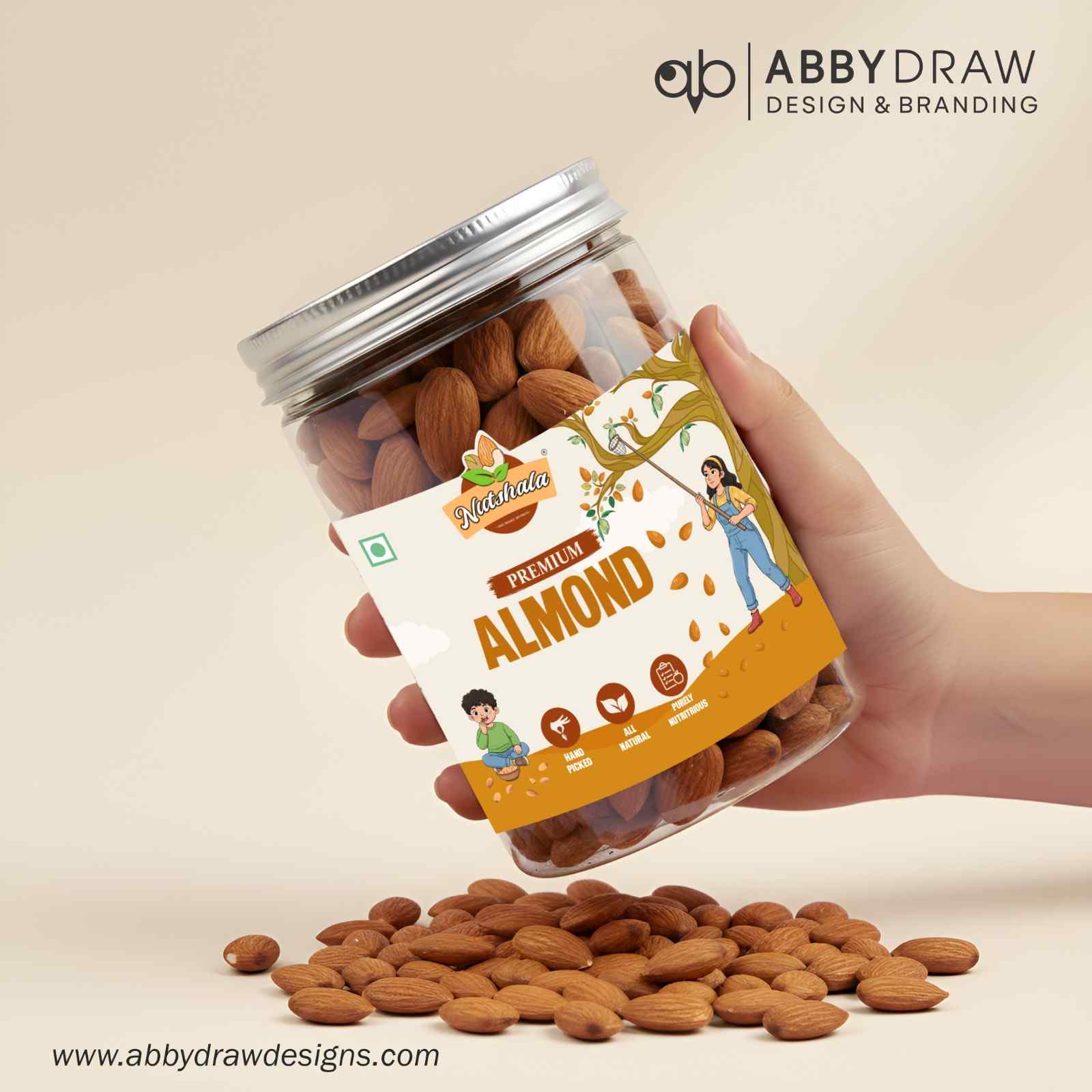Soft caramel/chocolate background with subtle botanical illustrations and elegant typography. Text reads: “Nutshala – Premium Dry Fruits / Almond / Handpicked 250 GM.”