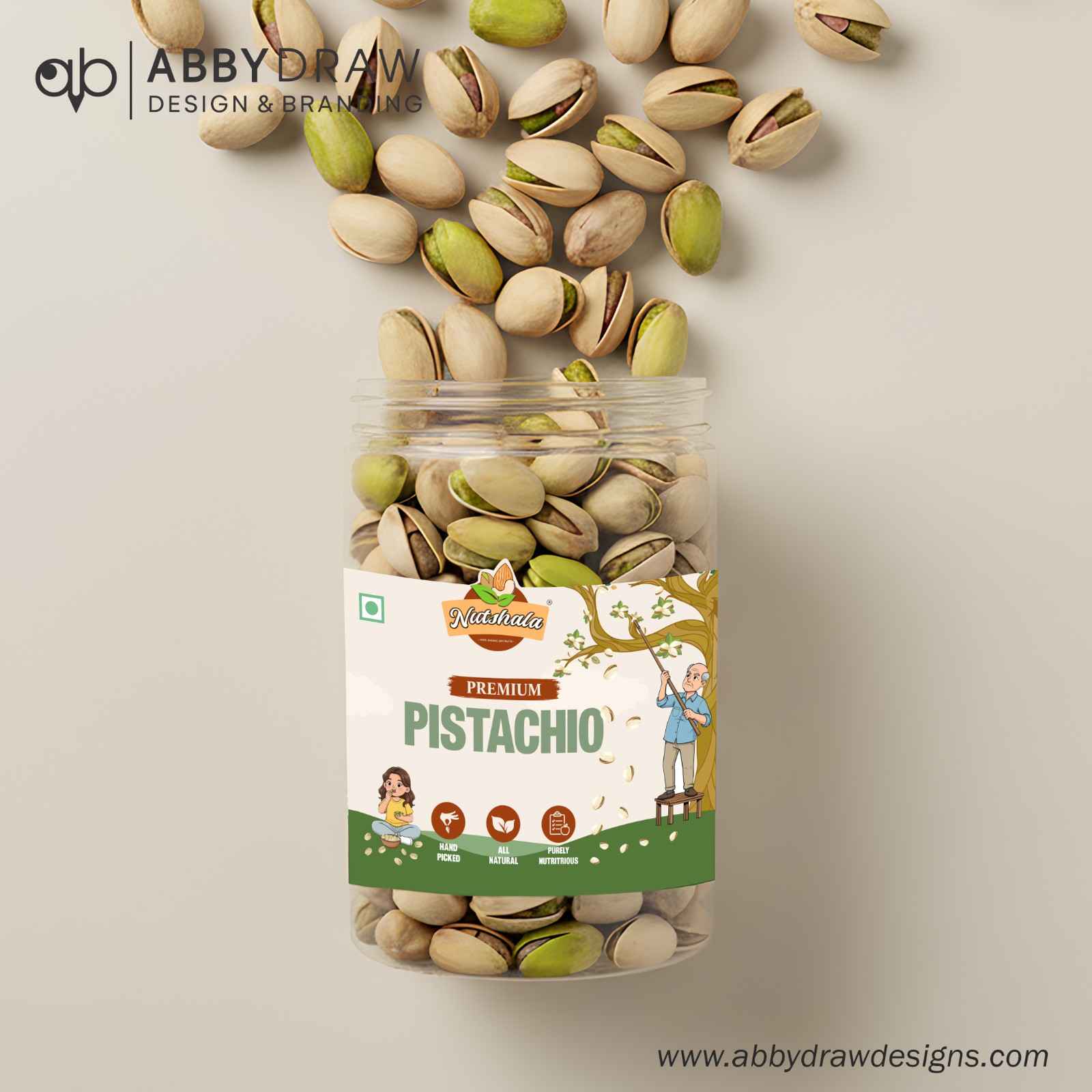 Deep green tone for richness and premium appeal. Strong contrast for botanical elements. Text: “Nutshala – Premium Dry Fruits / Pistachio / Handpicked 250 GM.”