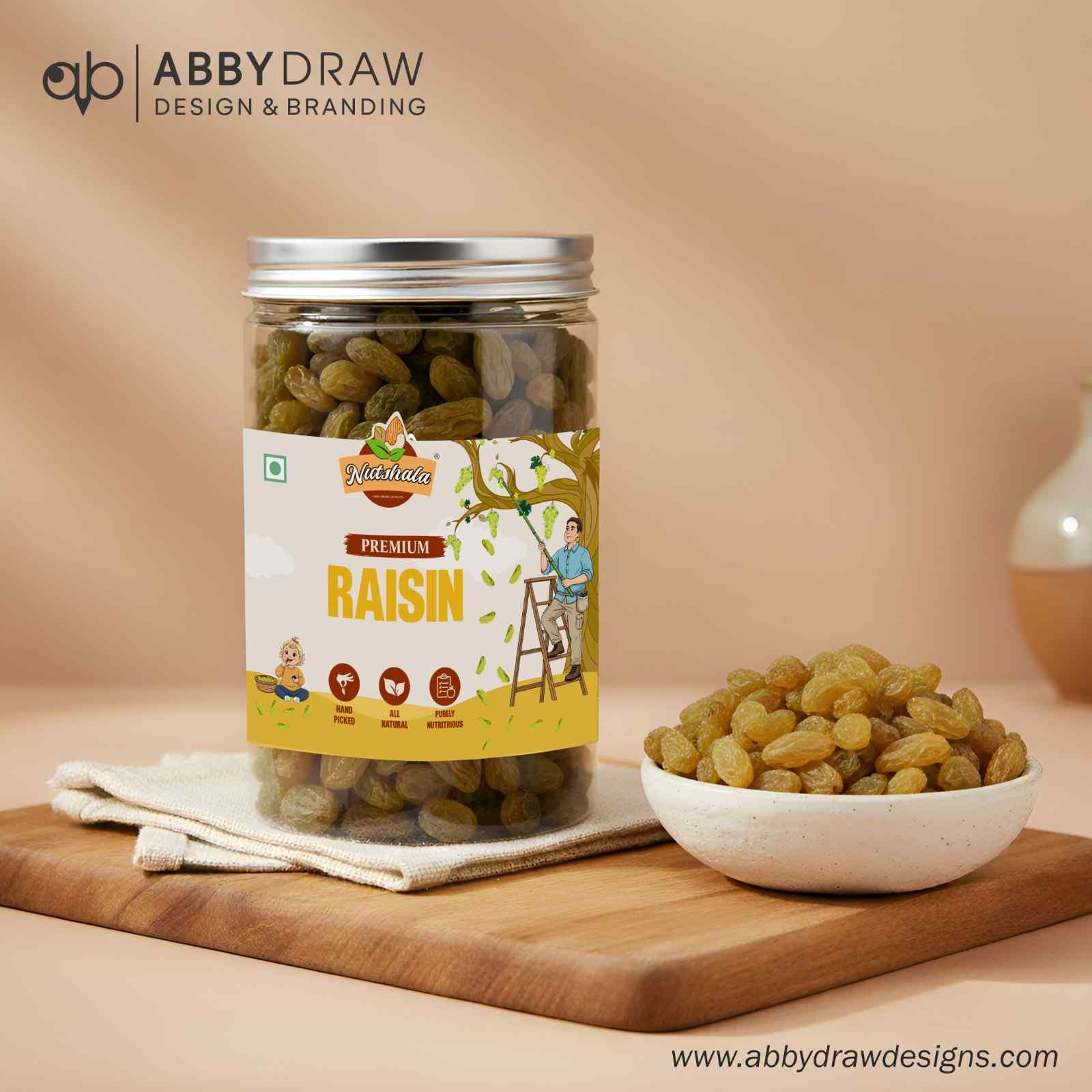 Vibrant yellow conveying energy and visibility. Consistent illustration style and layout. Text: “Nutshala – Premium Dry Fruits / Raisin / Handpicked 250 GM.”