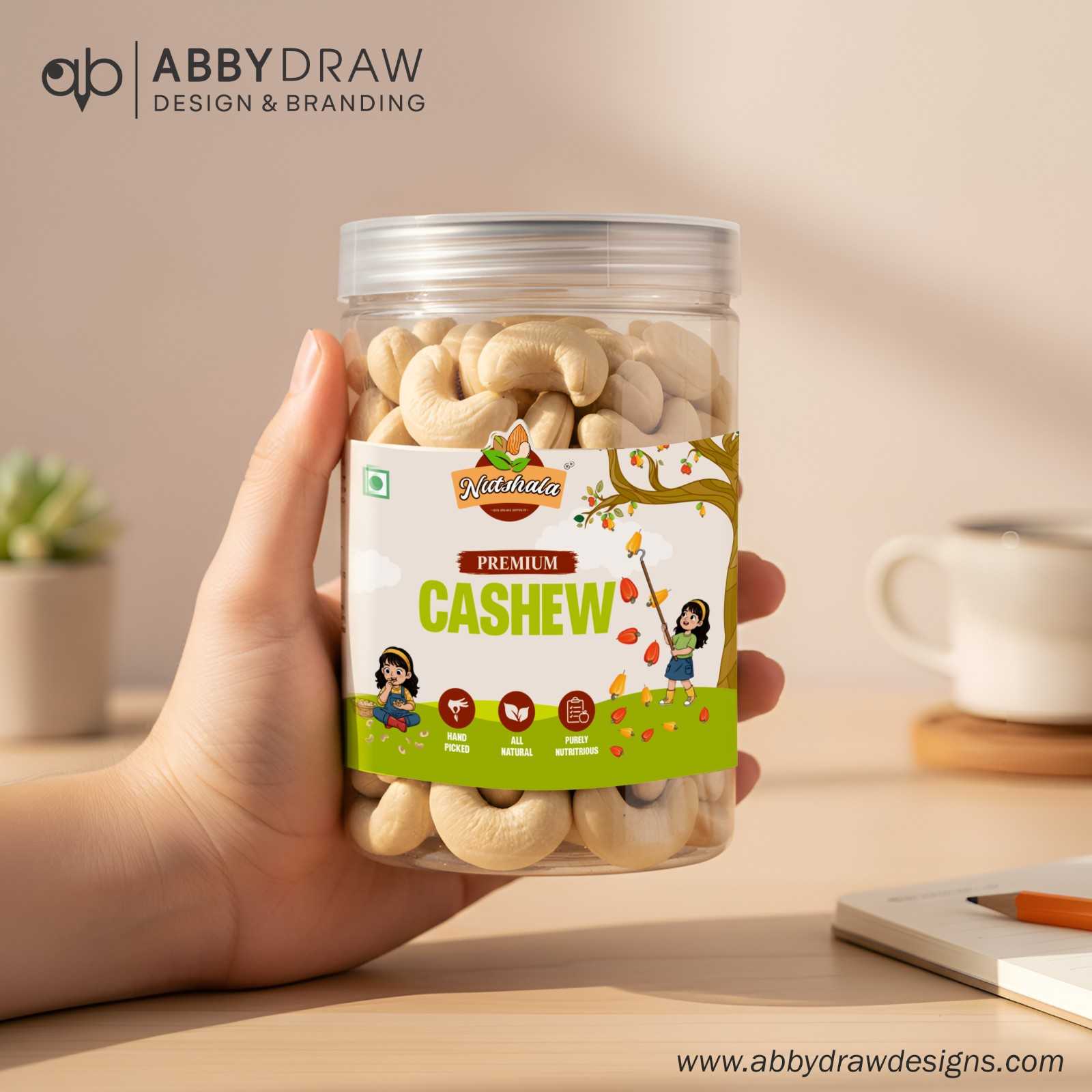 Fresh pastel green representing vitality. Minimal botanical motifs and clean serif/sans-serif pairing. Text: “Nutshala – Premium Dry Fruits / Cashew / Handpicked 250 GM.”