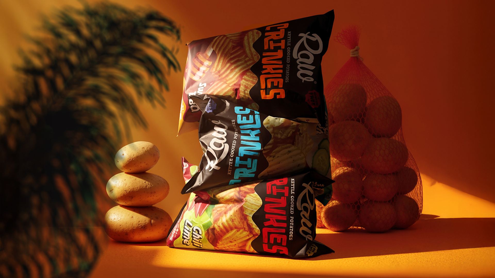 Inspired by the chip’s distinct crinkled texture, the design features a dynamic wavy pattern that flows across the pack — a visual metaphor for movement, flavor, and fun. Each SKU is defined by vibrant flavor-driven colors, creating instant shelf recognition while maintaining a unified system under the RAW brand.