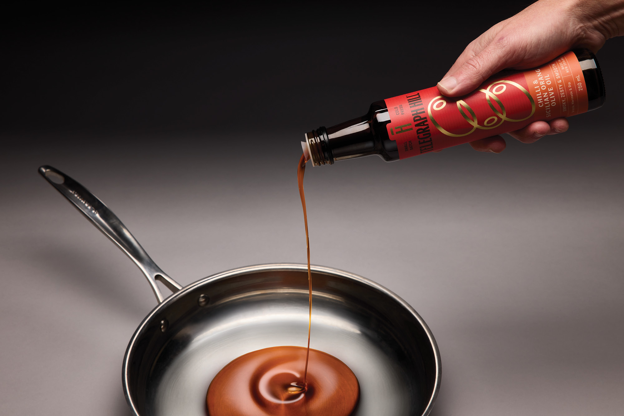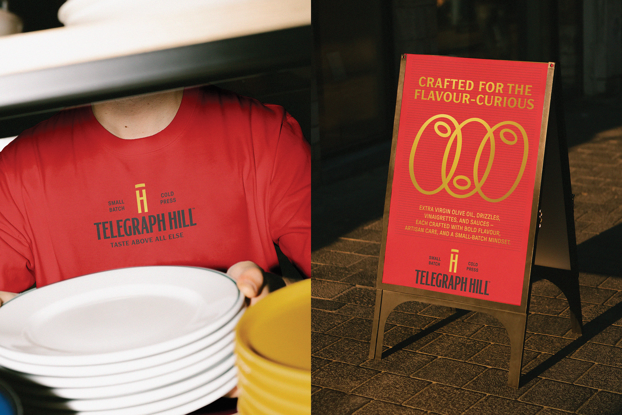 That ethos guided every design decision. The familiar Telegraph Hill red was elevated as the hero — a bold block of colour symbolising flavour, passion, and the joy of making. A new illustration system unites two brand truths: the natural oval of an olive and the rhythmic signal waves of telegraph transmission. The resulting pattern — printed in refined gold foil — is both icon and metaphor, capturing craft, connection, and the love of the olive at the brand’s core. A curious fusion of electromagnetic movement and nature, it radiates warmth and chef-level confidence.