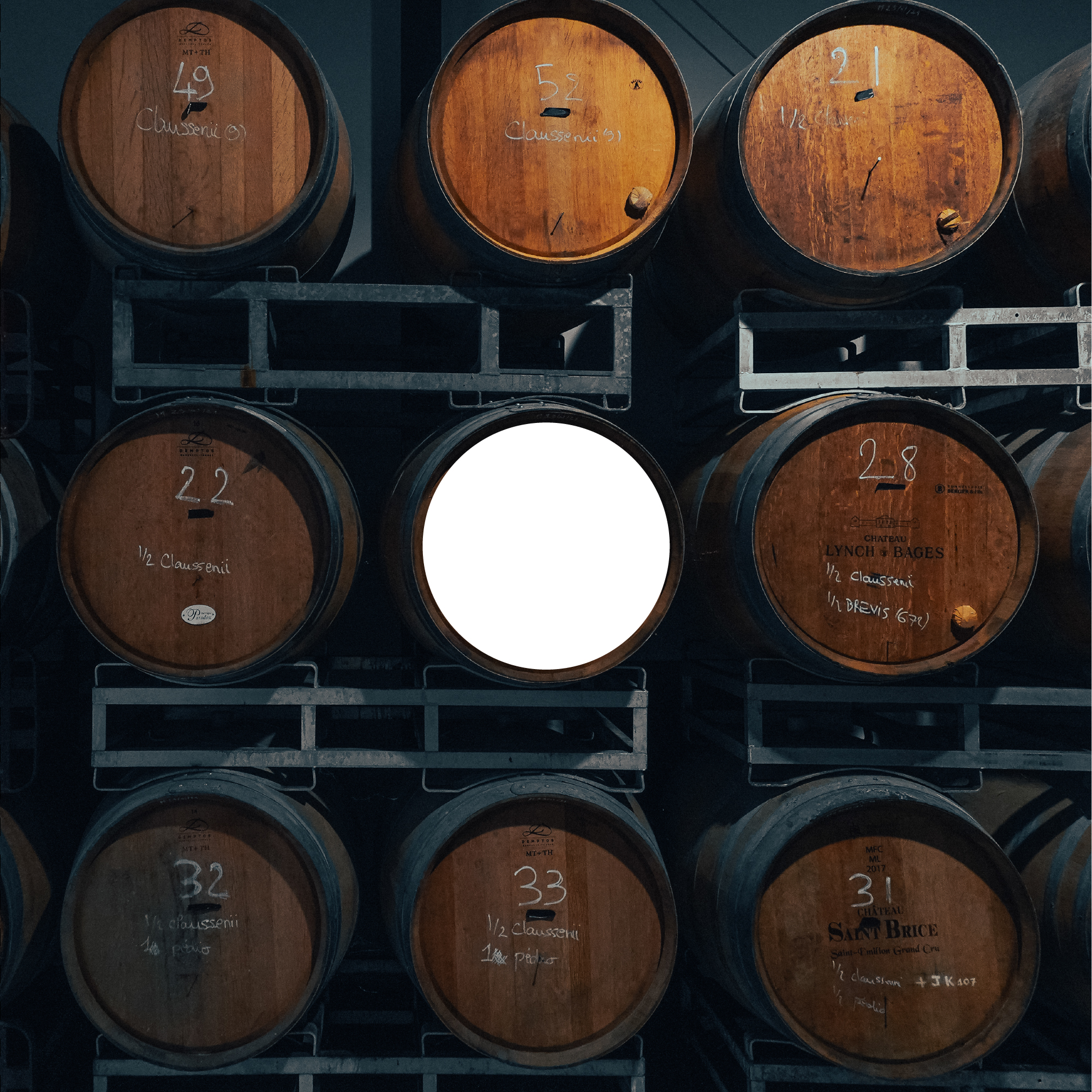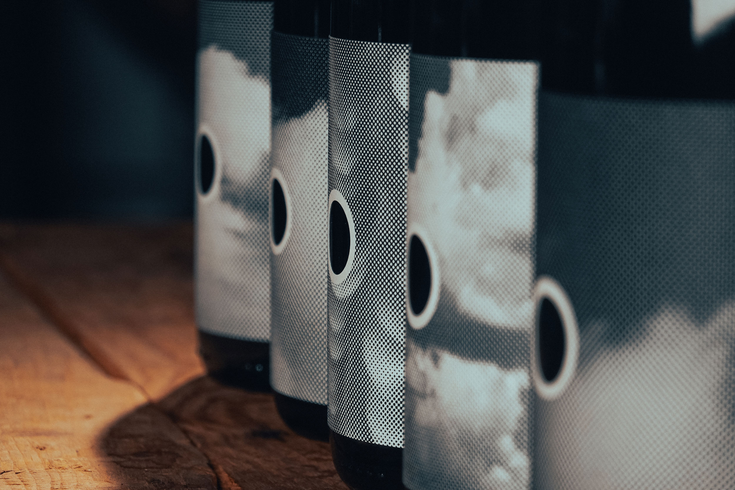 At the center of each label, a circular cut-out symbolises the barrel itself — a simple yet distinctive graphic element that visually ties the entire range together.