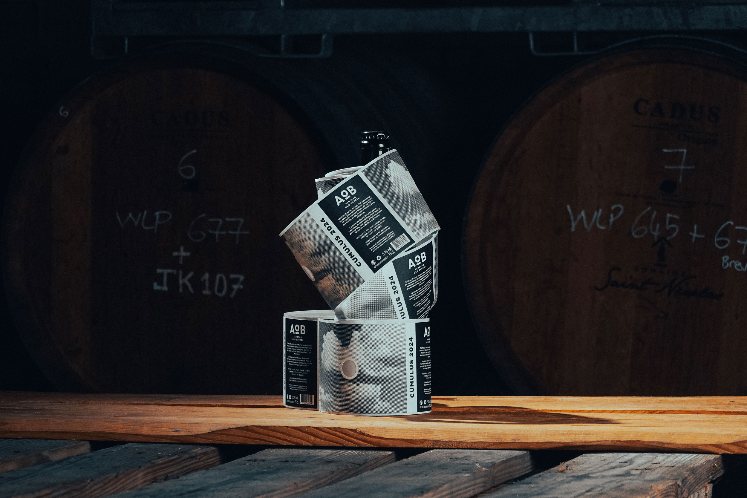 Each beer is named after a specific cloud name, directly inspiring the label design. The packaging embraces a screen-print-like halftone texture, with visible grain and imperfections — a deliberate reference to the handcrafted and unpredictable nature of barrel aging.