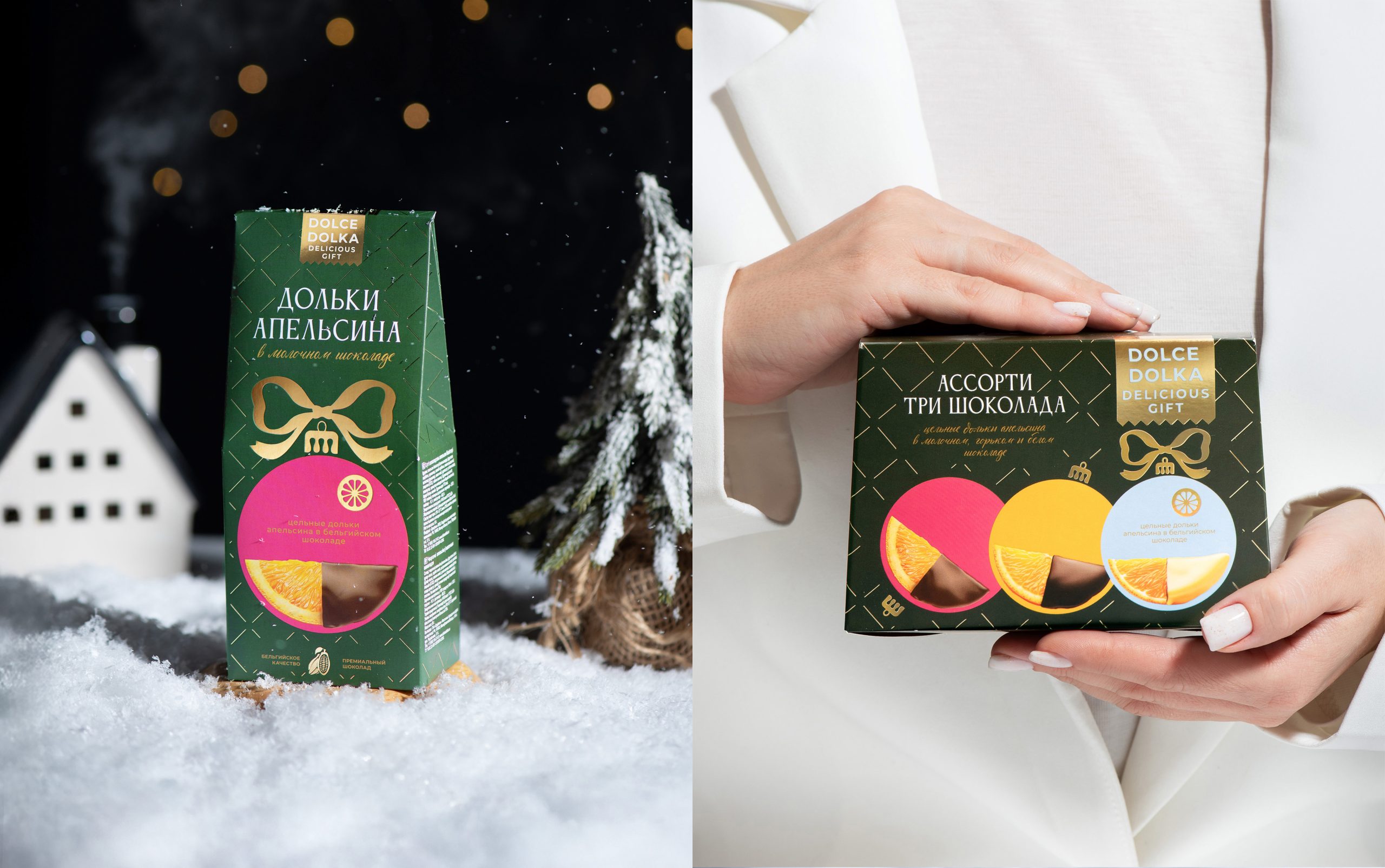 In this project, a chocolate-covered orange slice is reimagined as a Christmas ornament — bright, round, and instantly recognizable as a festive symbol. This concept sets the tone for the entire design, turning the sweet into a small, thoughtful gift. The packaging functions as a ready-to-give New Year’s present — simple, intuitive, and emotional, creating a sense of celebration even before it reaches the table.