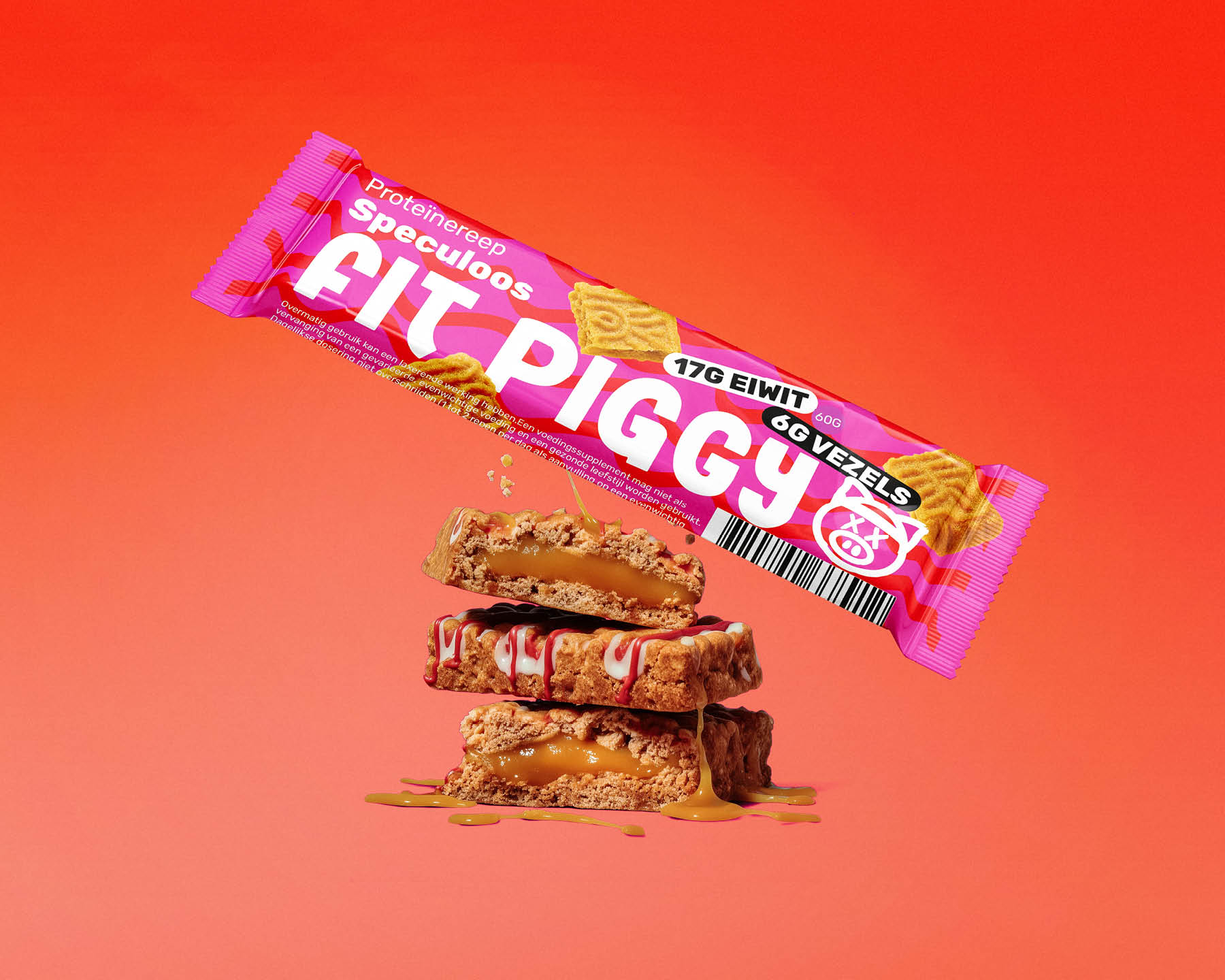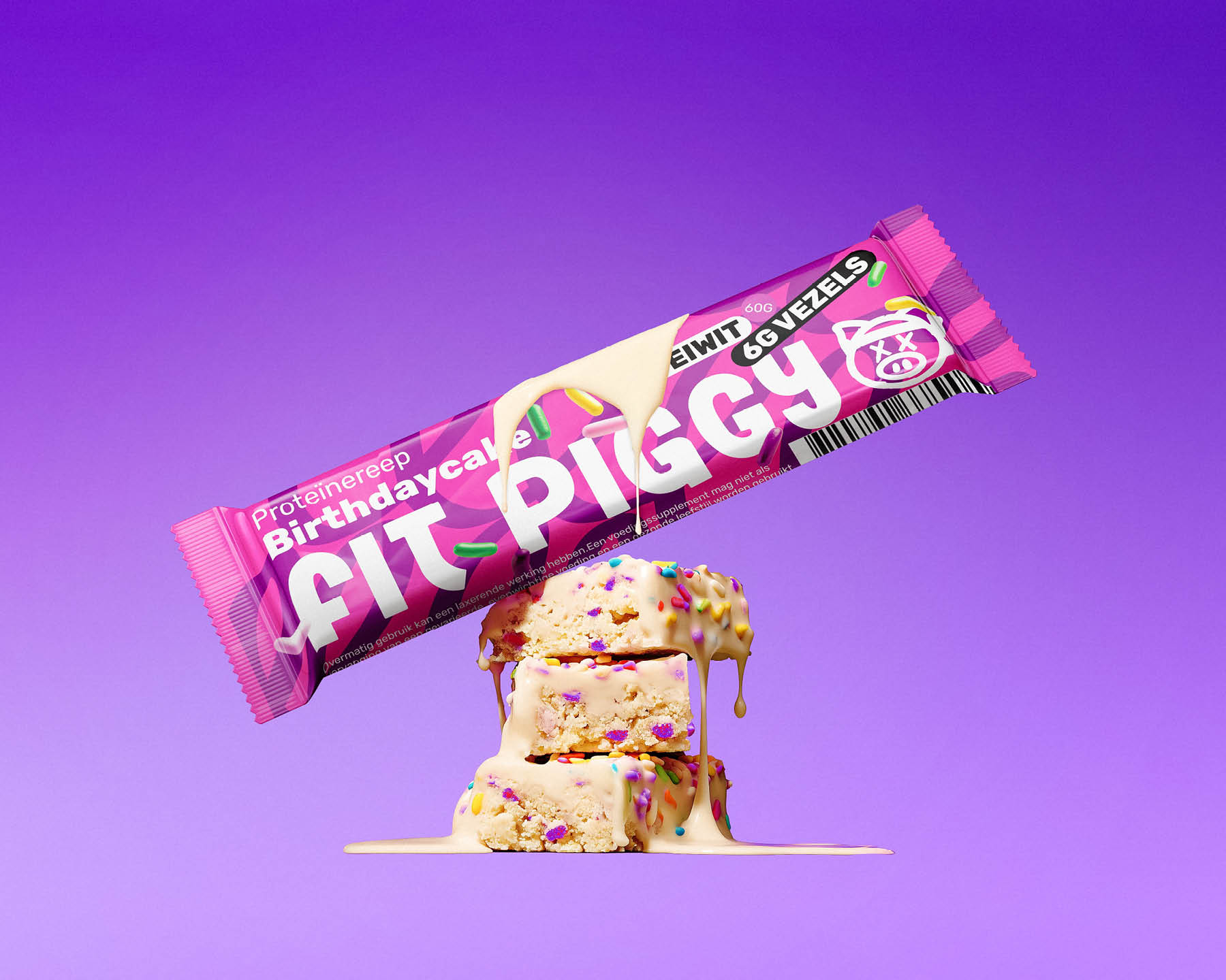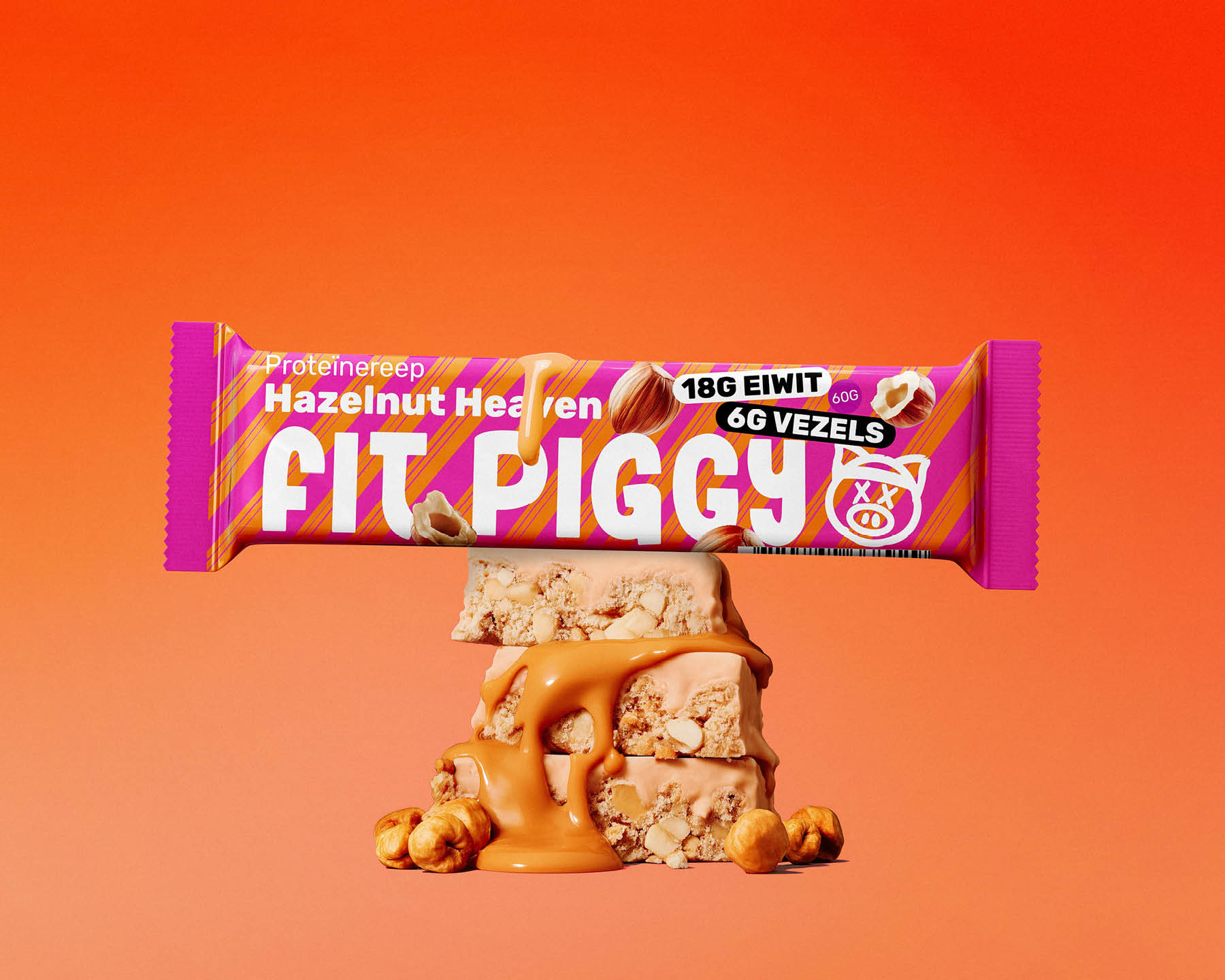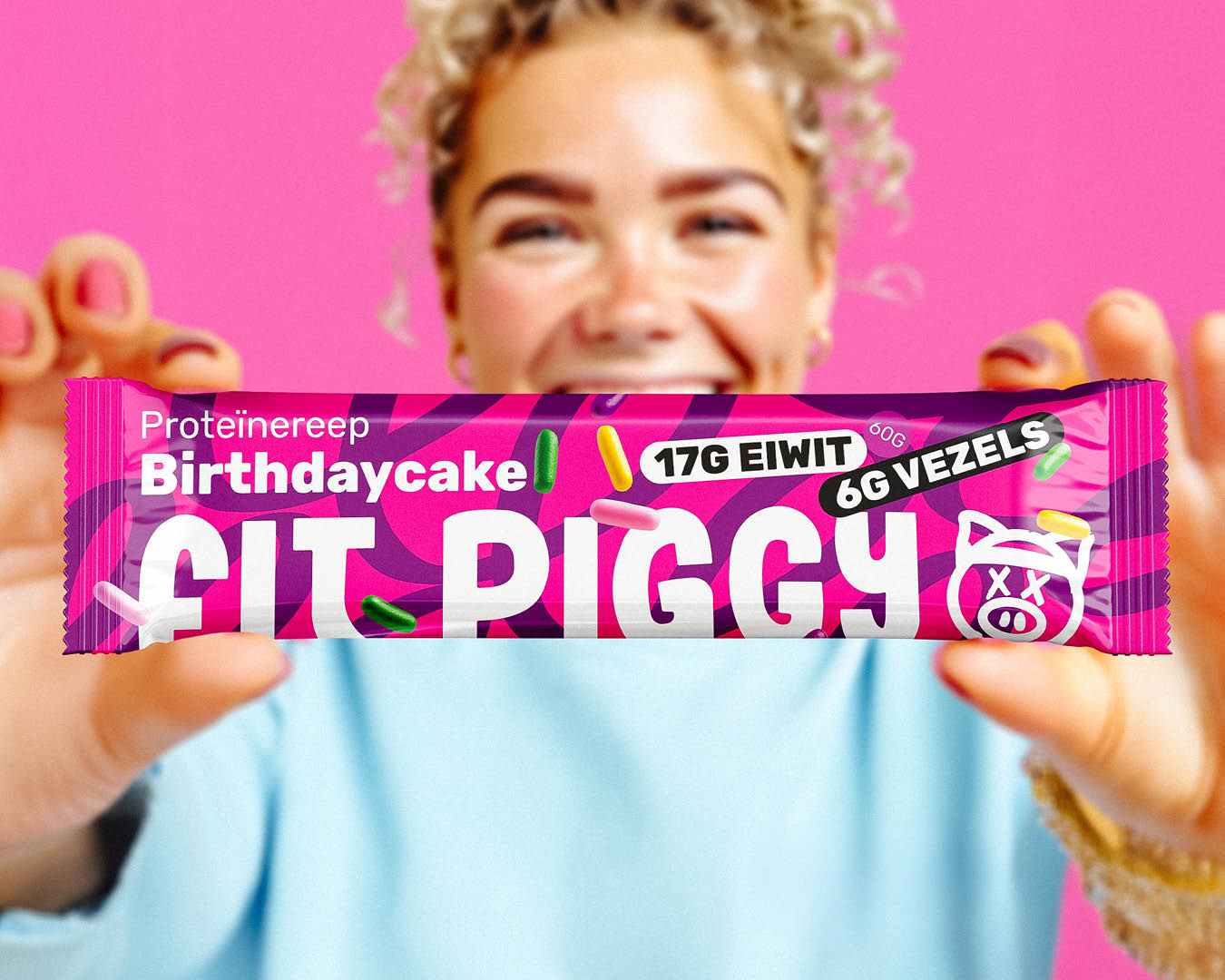 We designed packaging that breaks away from traditional sports nutrition aesthetics. By using vibrant pink tones, a friendly pig character, and an upbeat visual language, the packaging transforms a functional protein bar into something that feels rewarding and fun to carry.