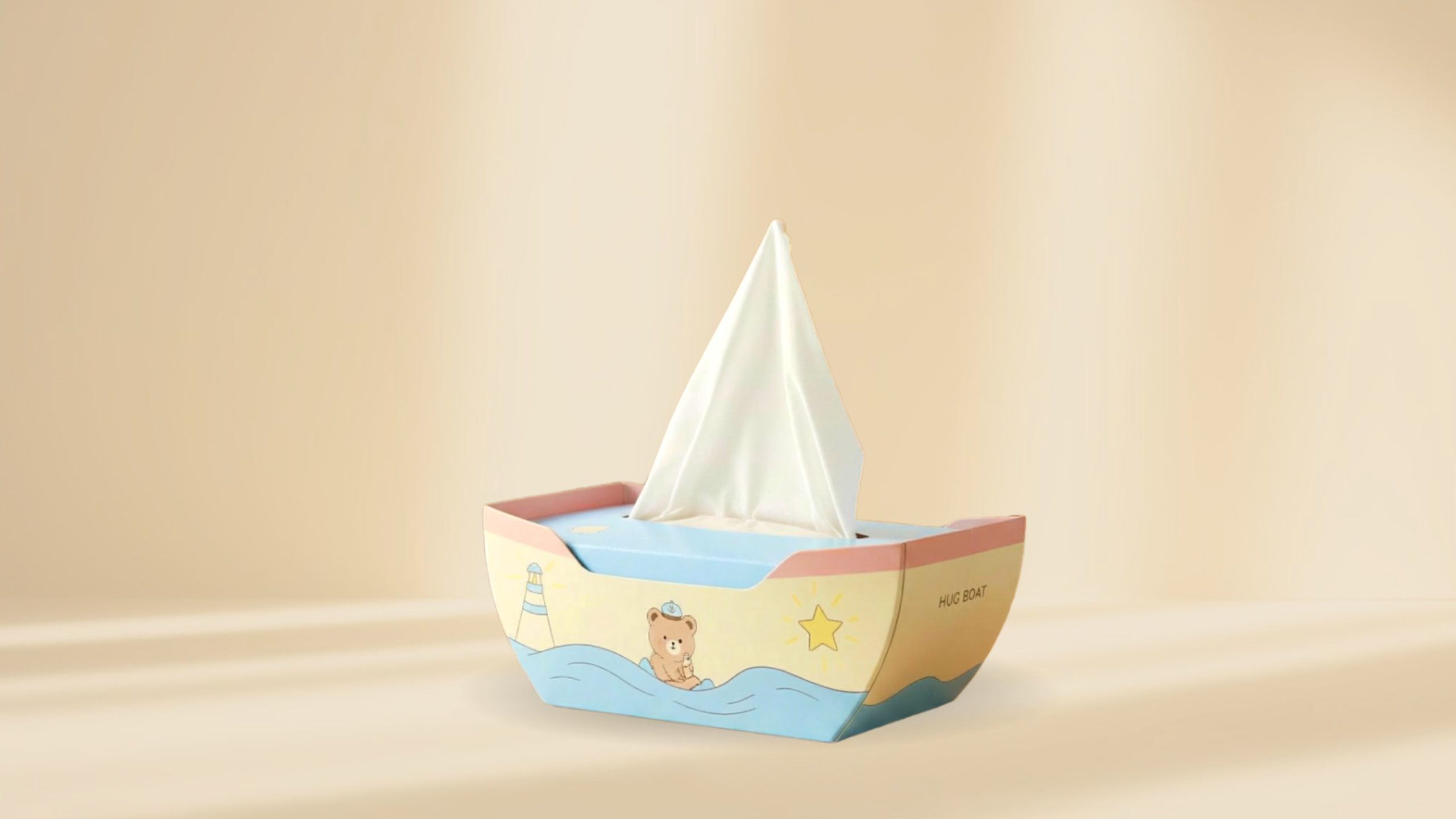 HUG BOAT is fully compatible with common tissue sizes and is designed for easy refill insertion. It remains stable on the table due to an extended base and reinforced edges. It is playful, but never impractical — its function is as visible as its story.